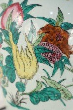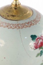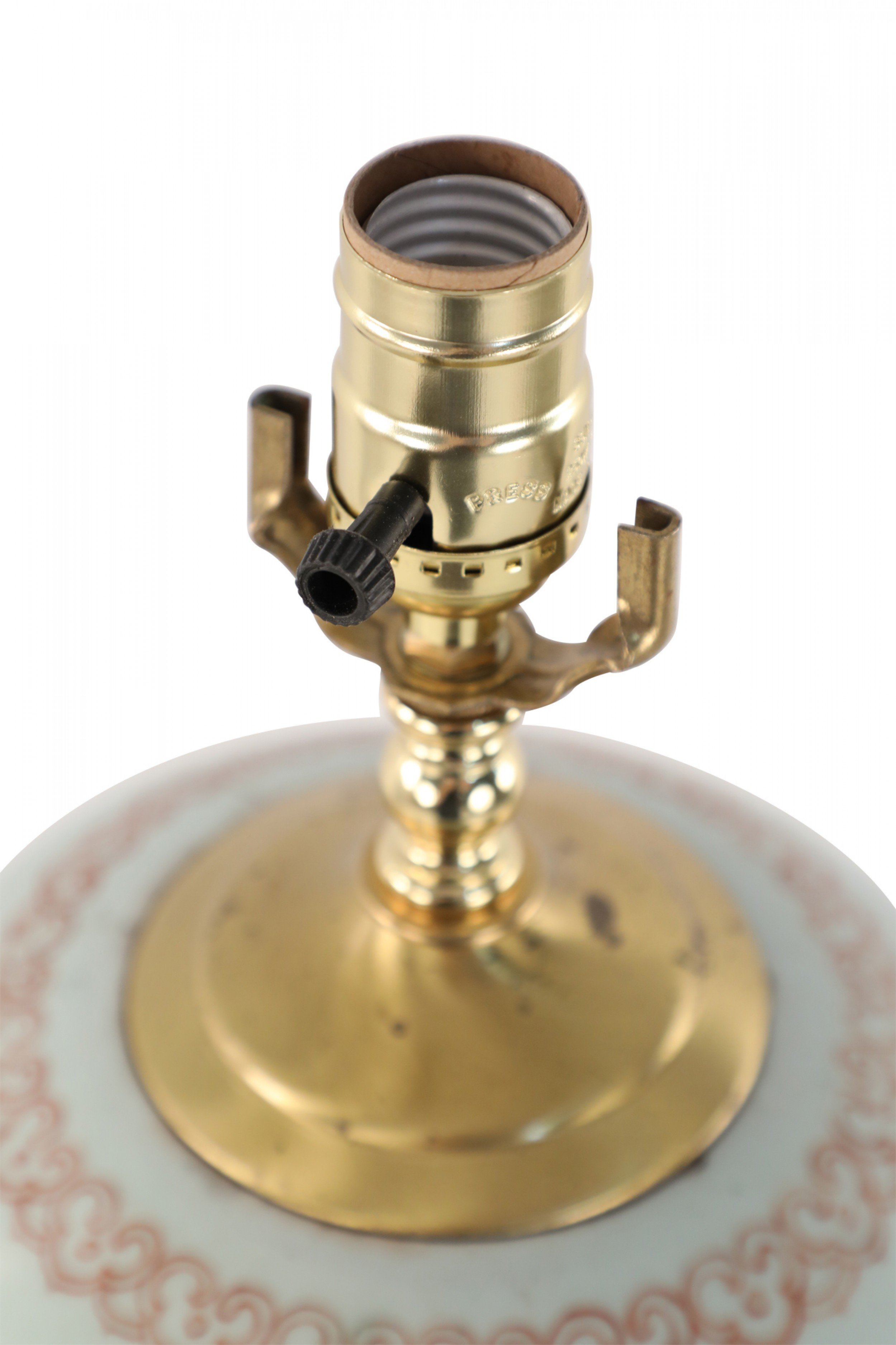 Style: Asian Materials & Techniques: Brass, metal, porcelain, wood Category: Lighting Condition: Hairline crack in the center of the vase. Ships without a shade.