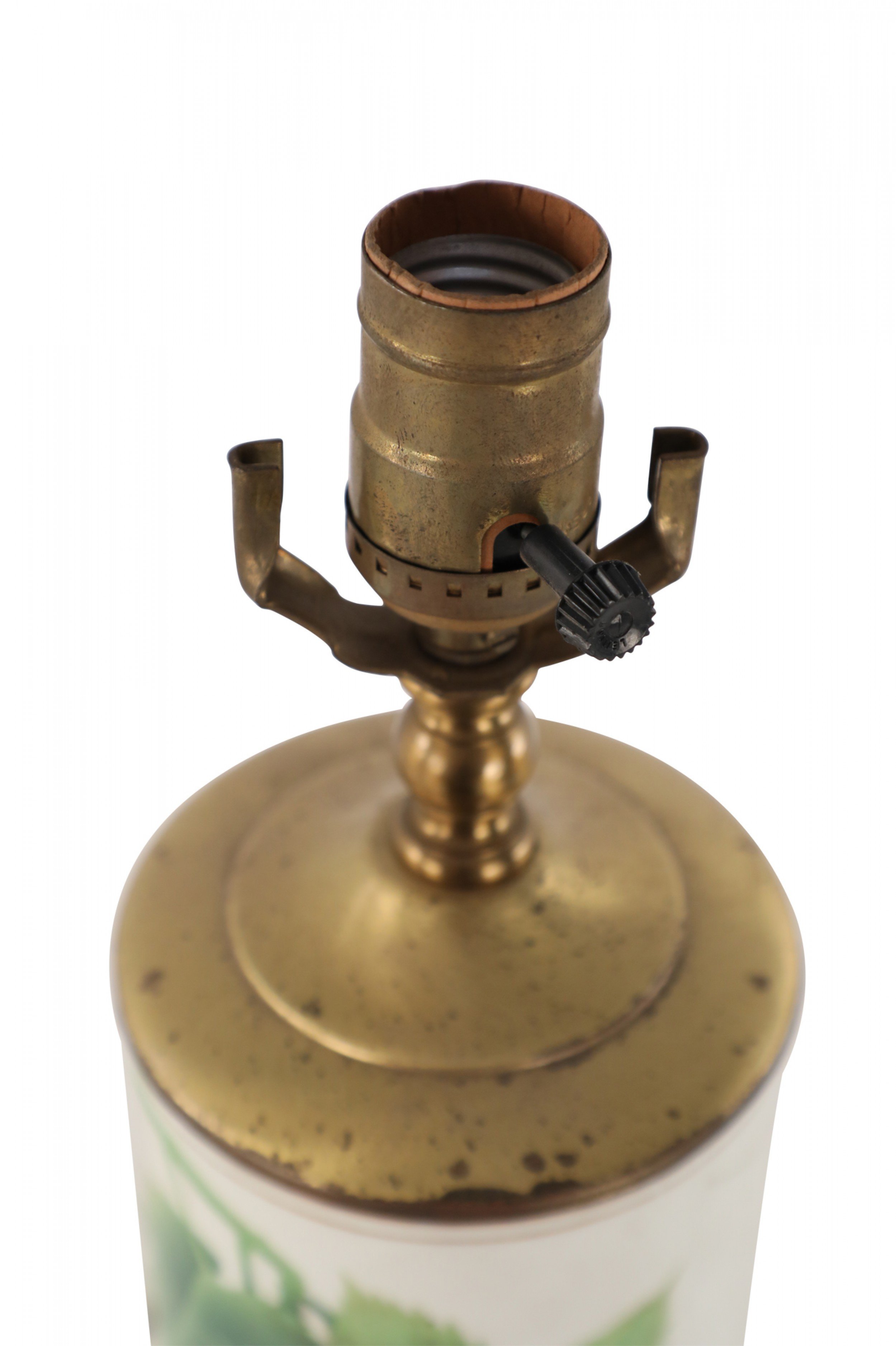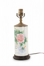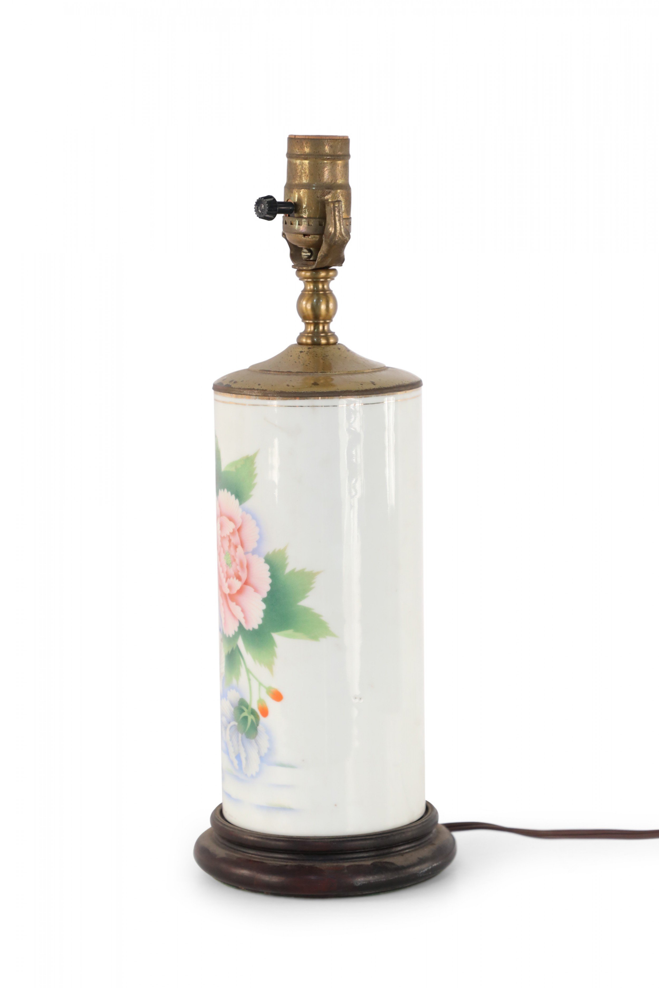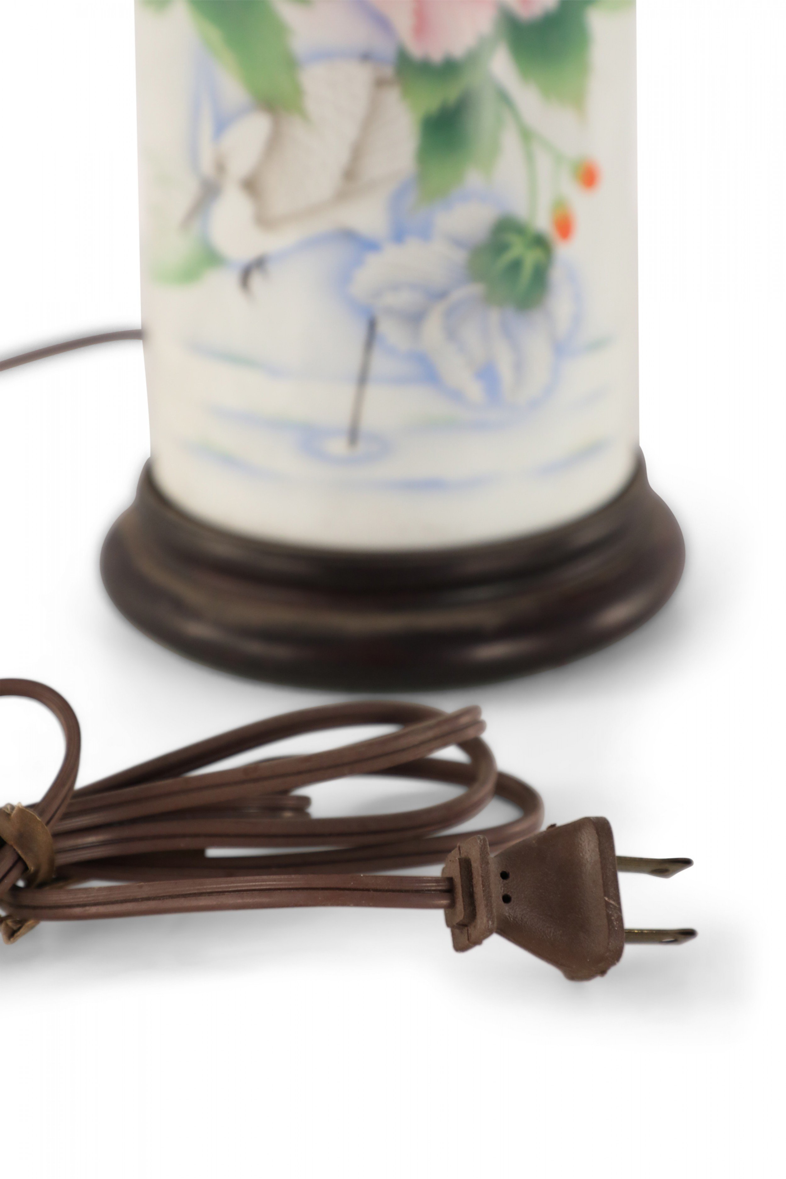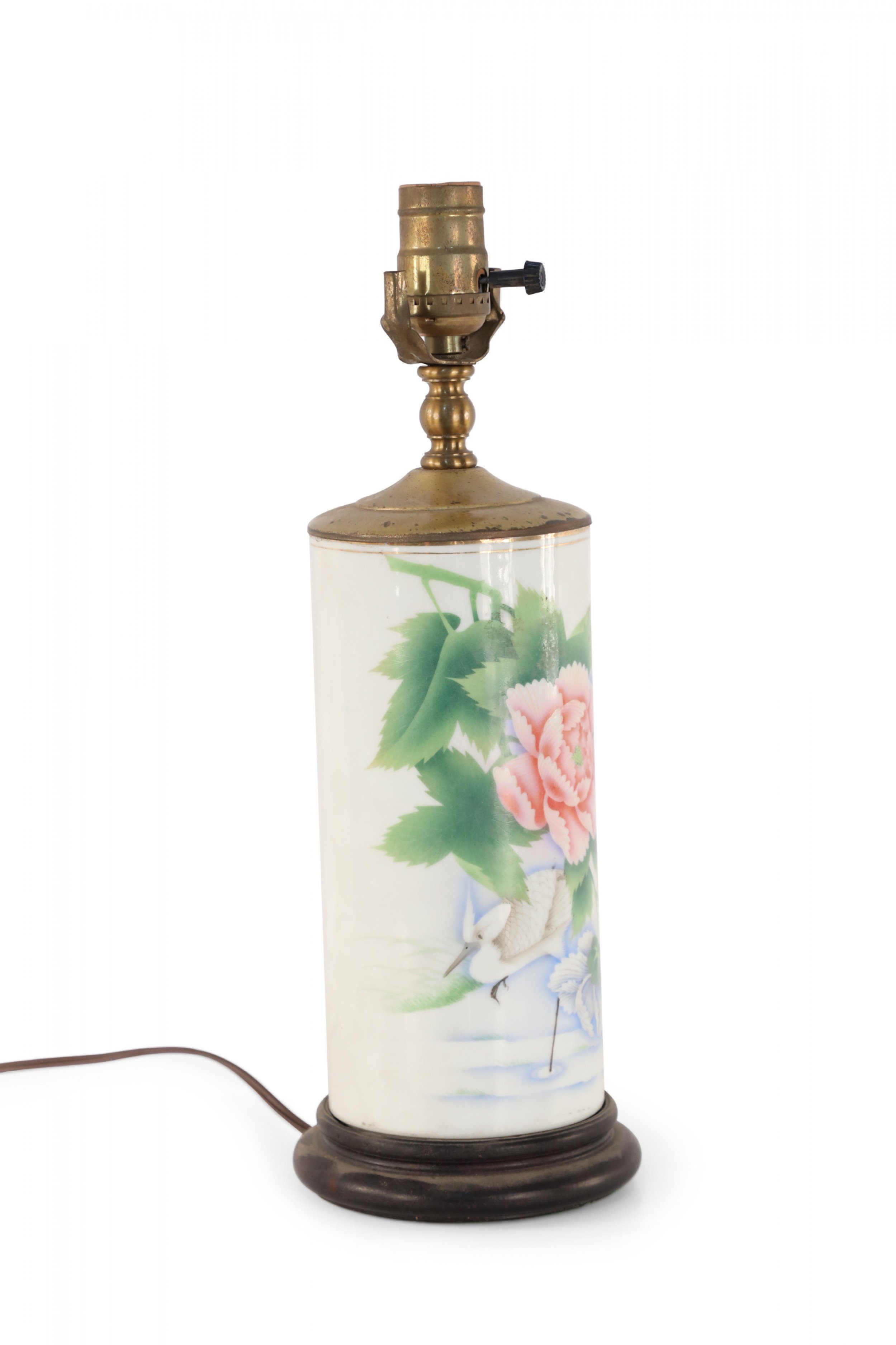 Chinese white porcelain table lamp made from a column-shaped vase painted with a crane alongside a blooming pink peony, a wooden base, and brass hardware..