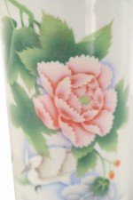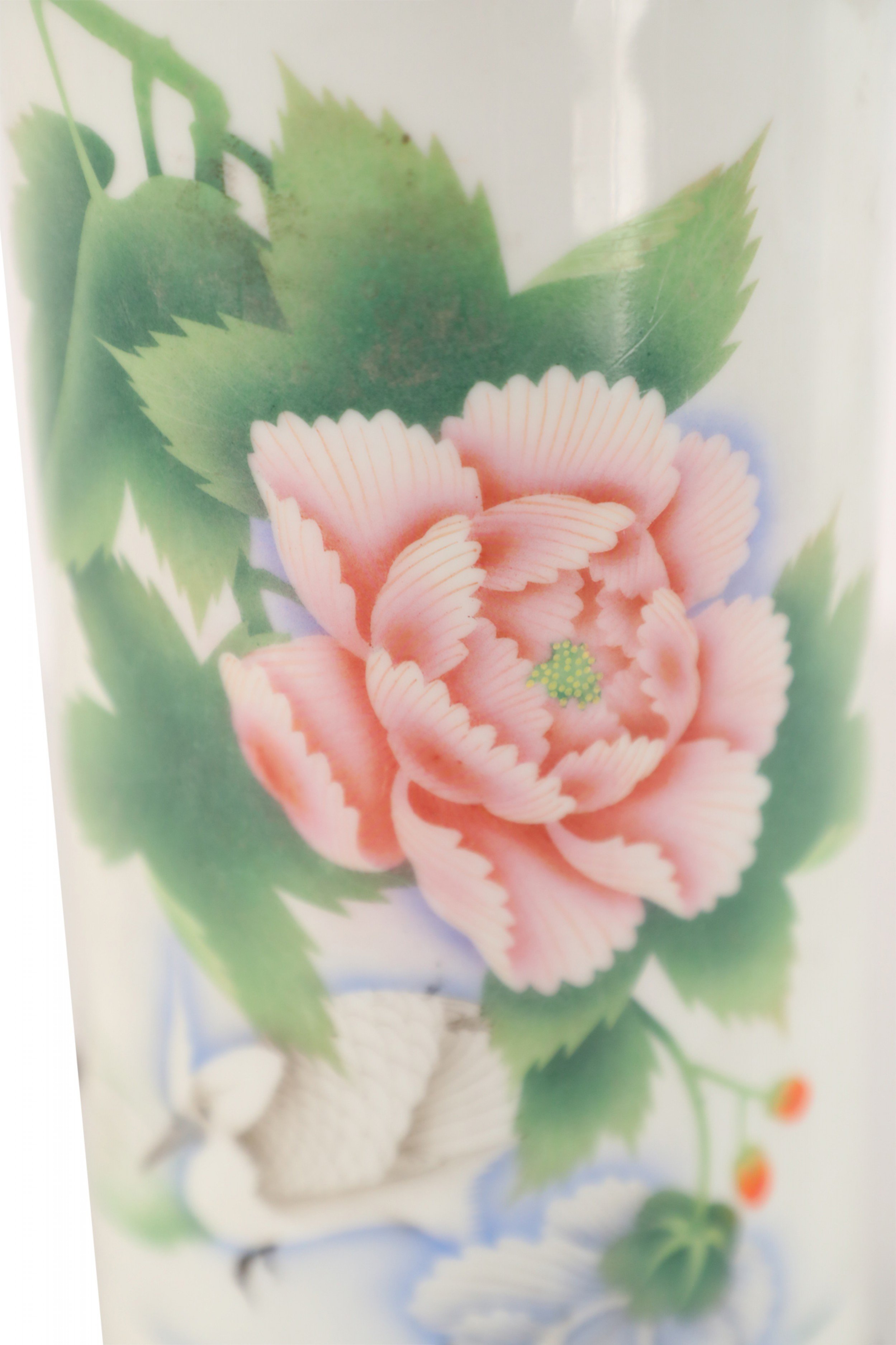 Chinese white porcelain table lamp made from a column-shaped vase painted with a crane alongside a blooming pink peony, a wooden base, and brass hardware.