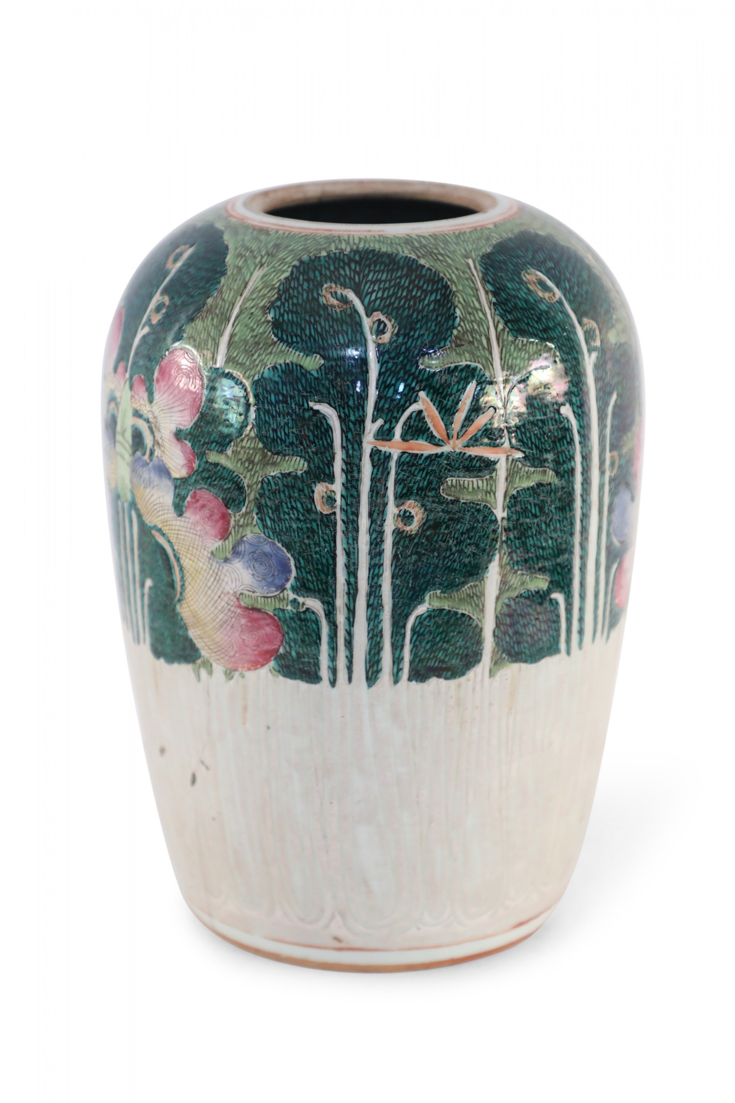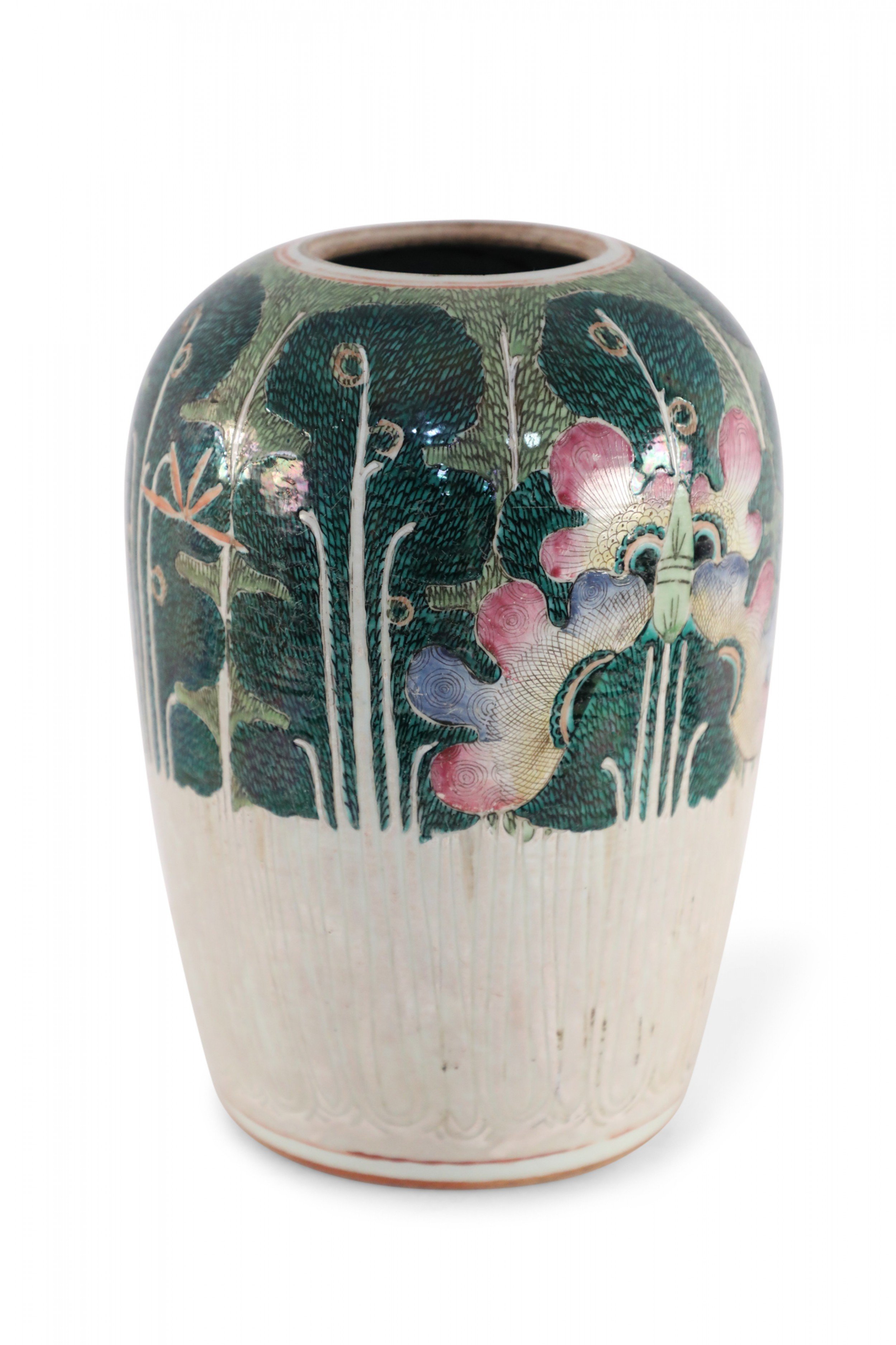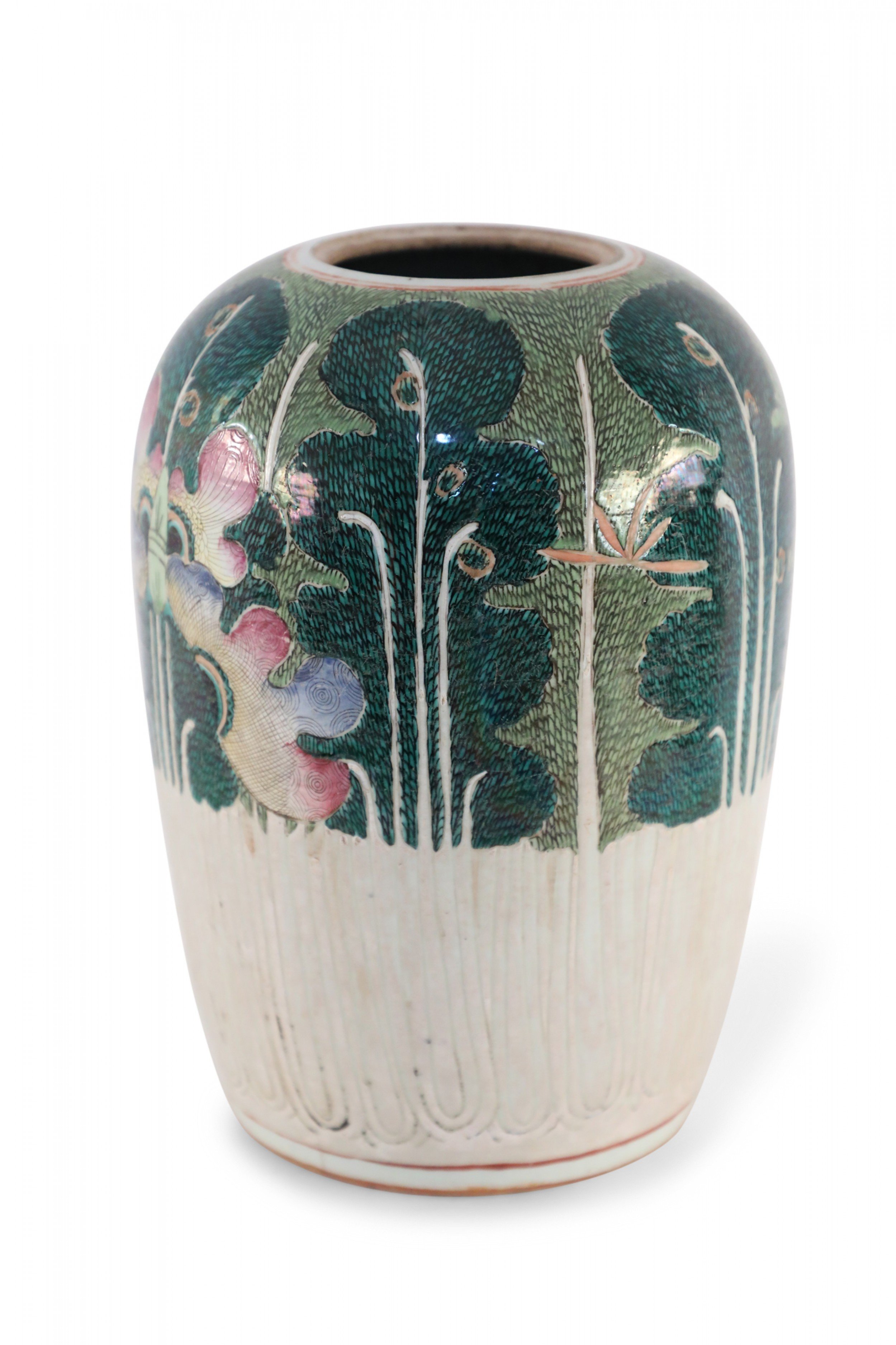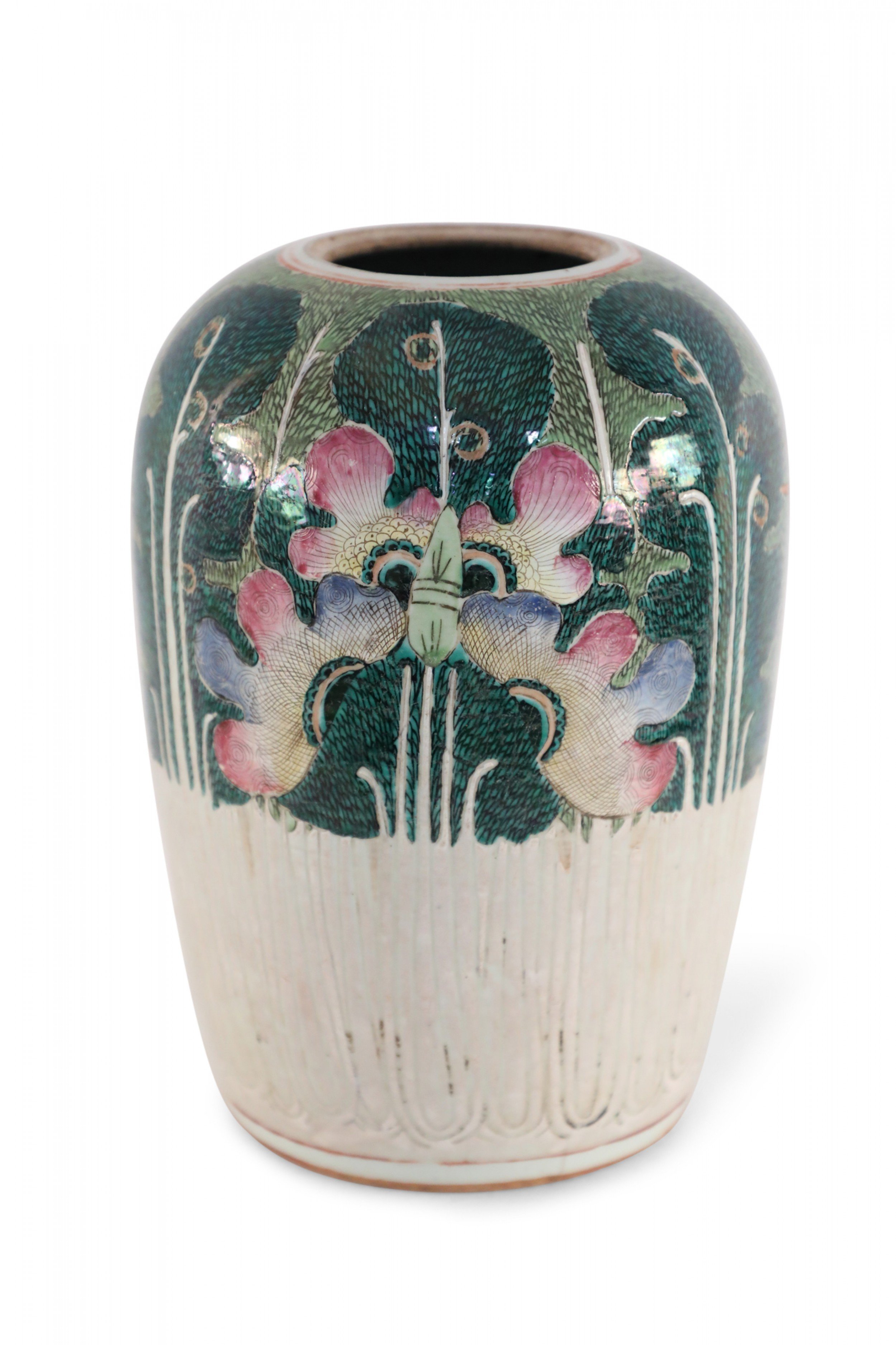 Antique Chinese (Early 20th Century) winter melon-form porcelain vase decorated with an incised, white bottom half that grows into verdant abstracted vegetal and peacock shapes on the top half in hues of green, pink and purple. The base includes a hole..
