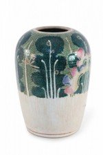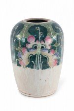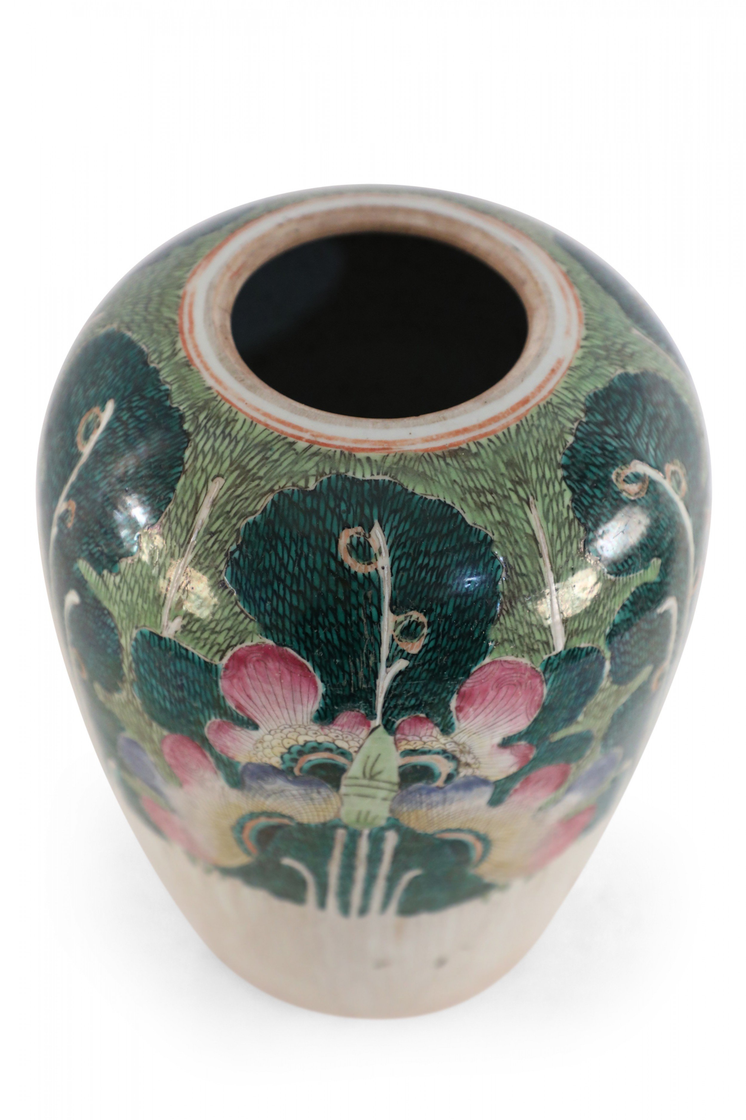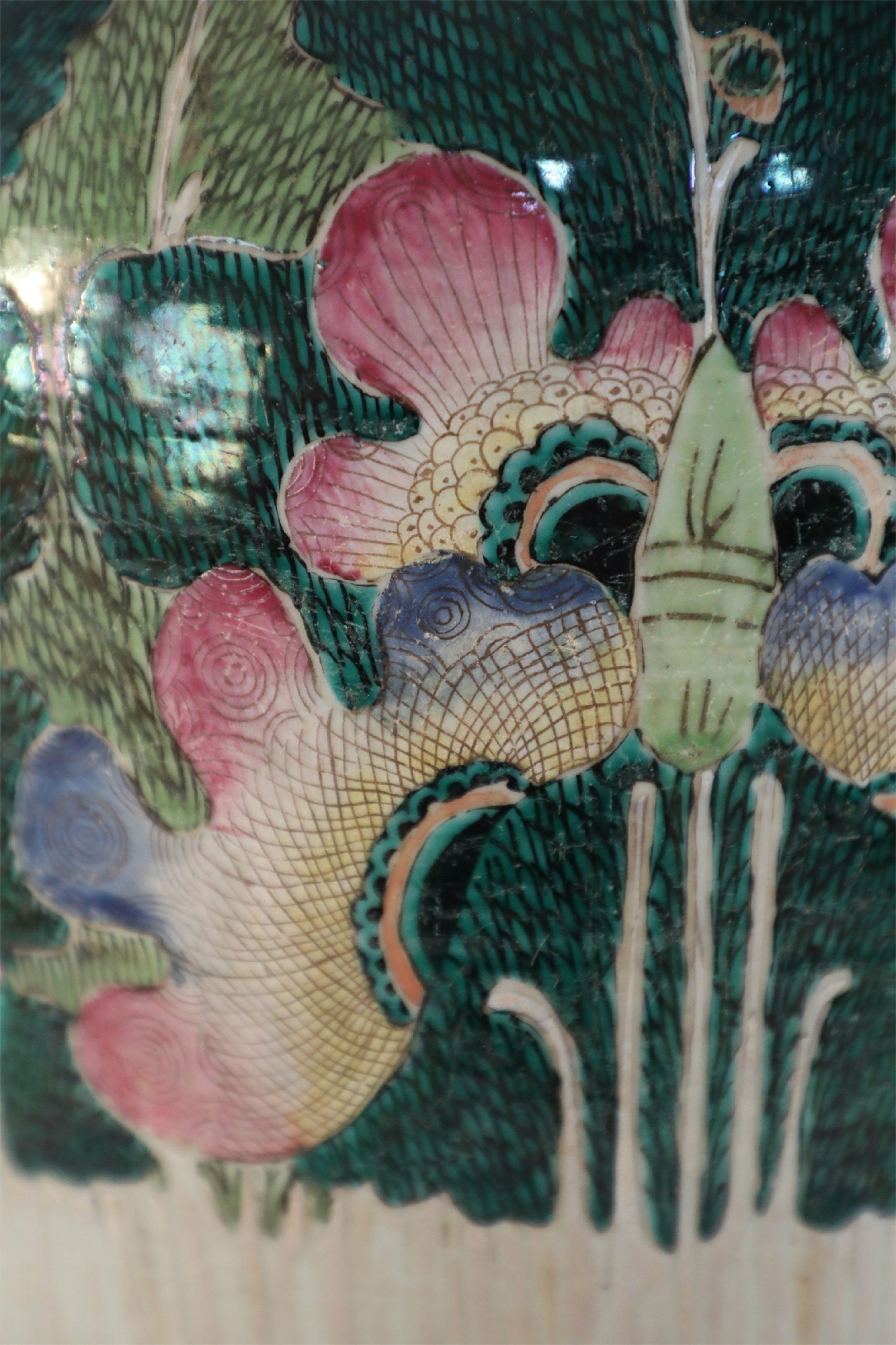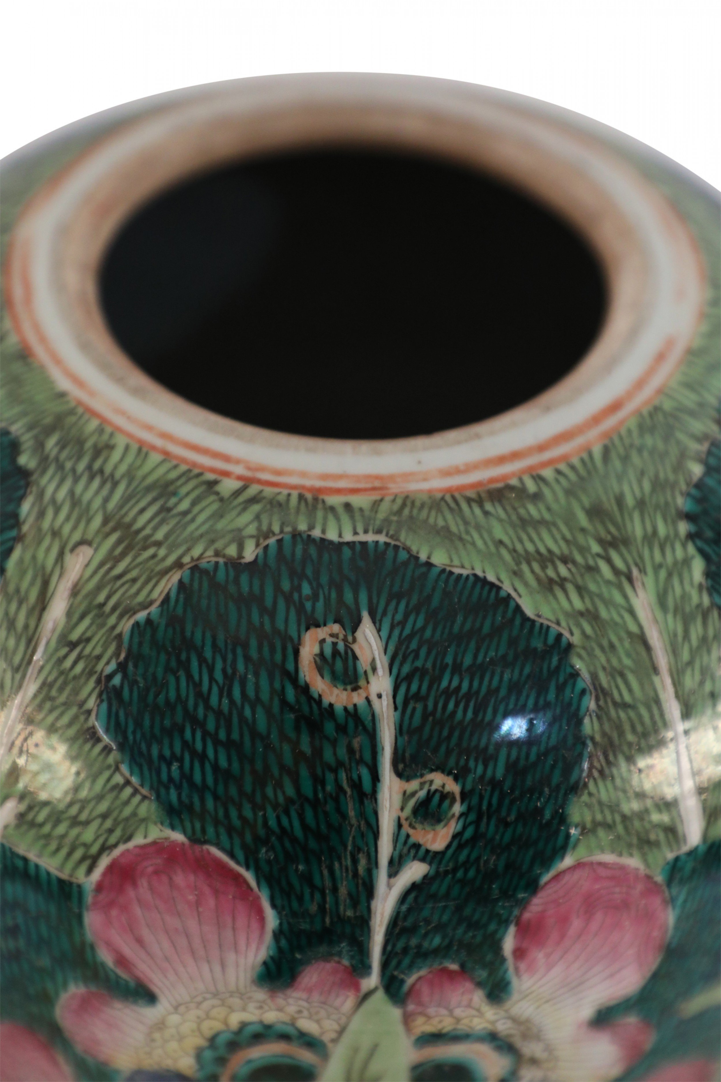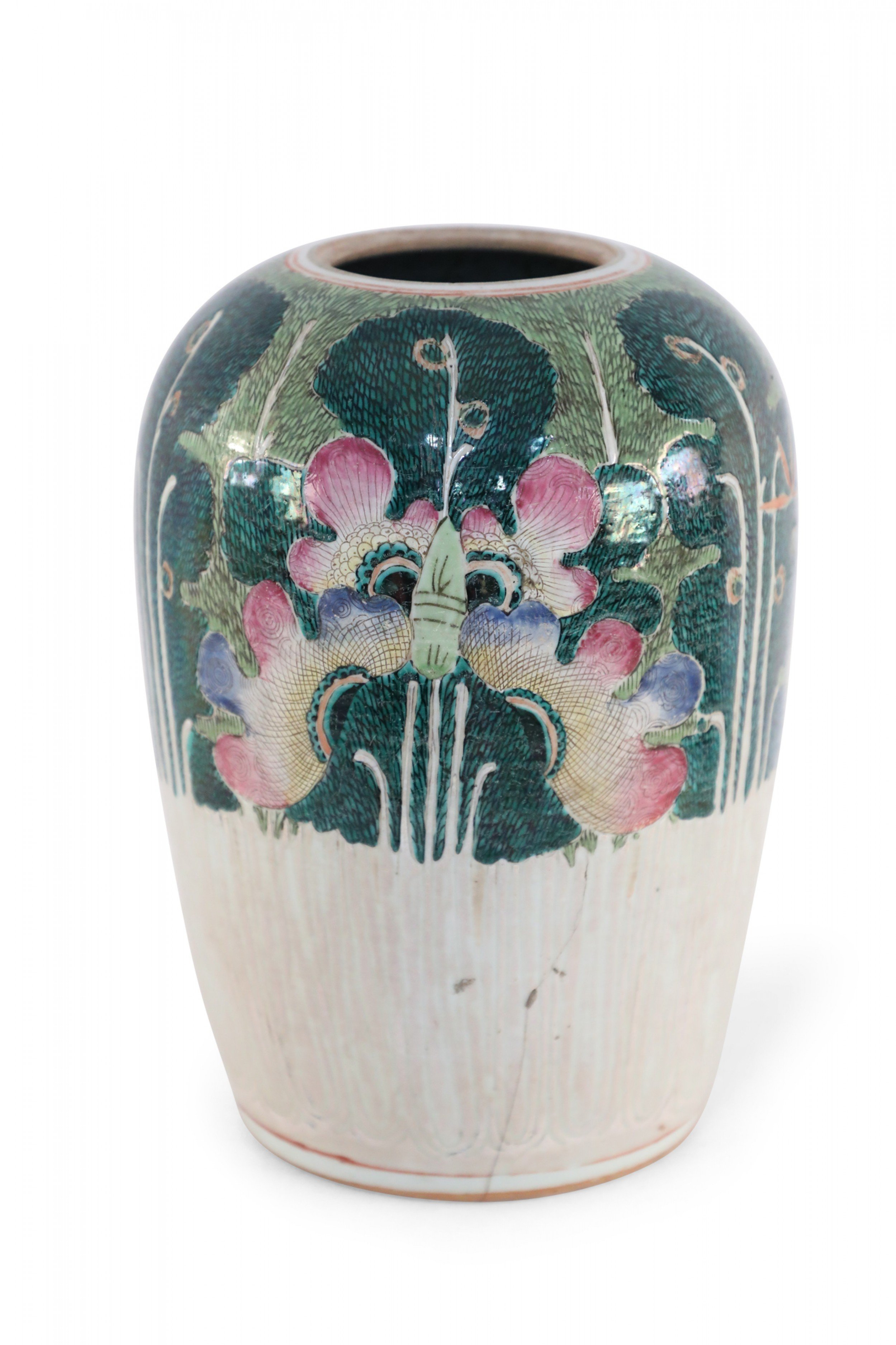 Antique Chinese (Early 20th Century) winter melon-form porcelain vase decorated with an incised, white bottom half that grows into verdant abstracted vegetal and peacock shapes on the top half in hues of green, pink and purple. The base includes a hole..