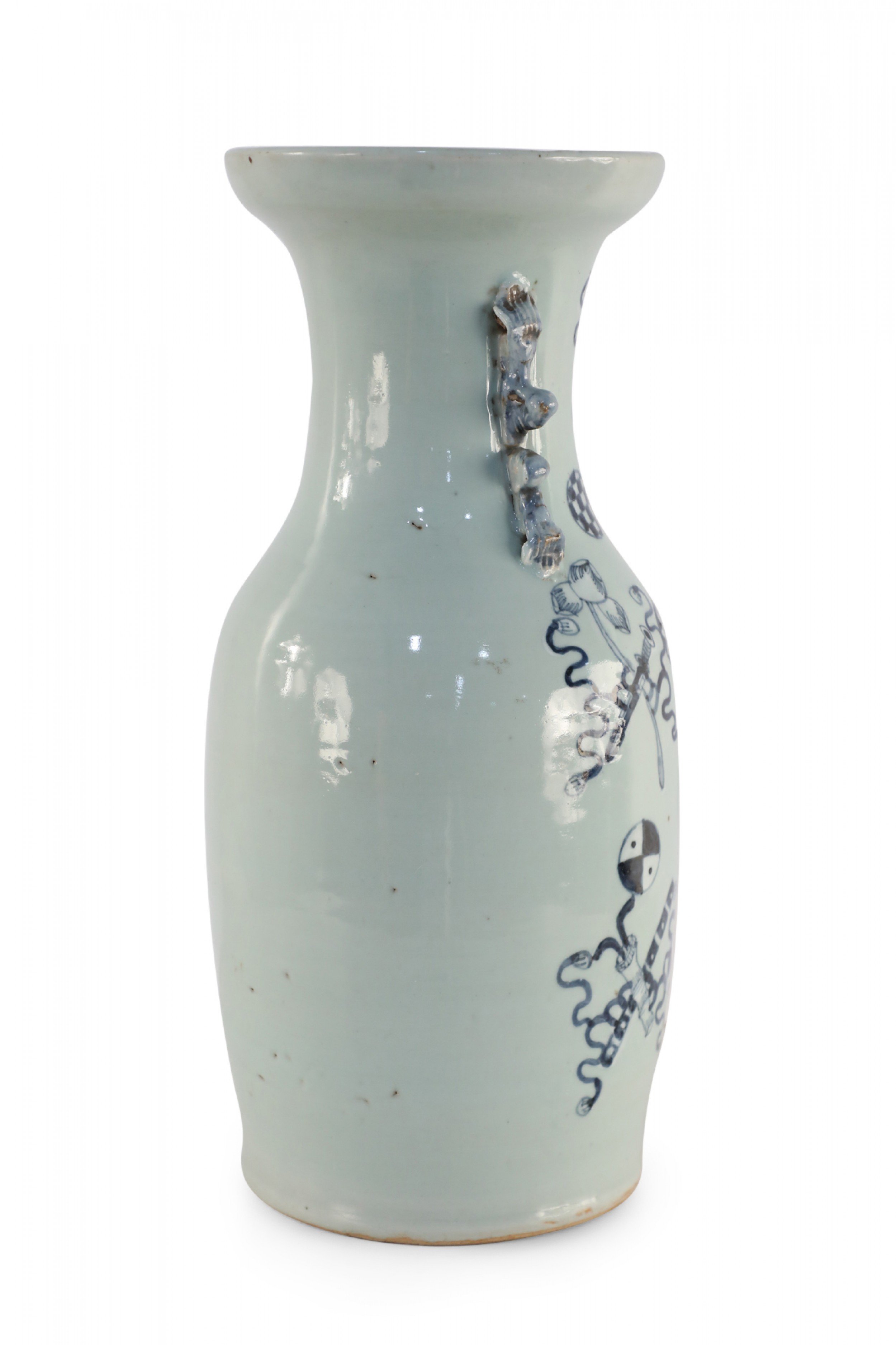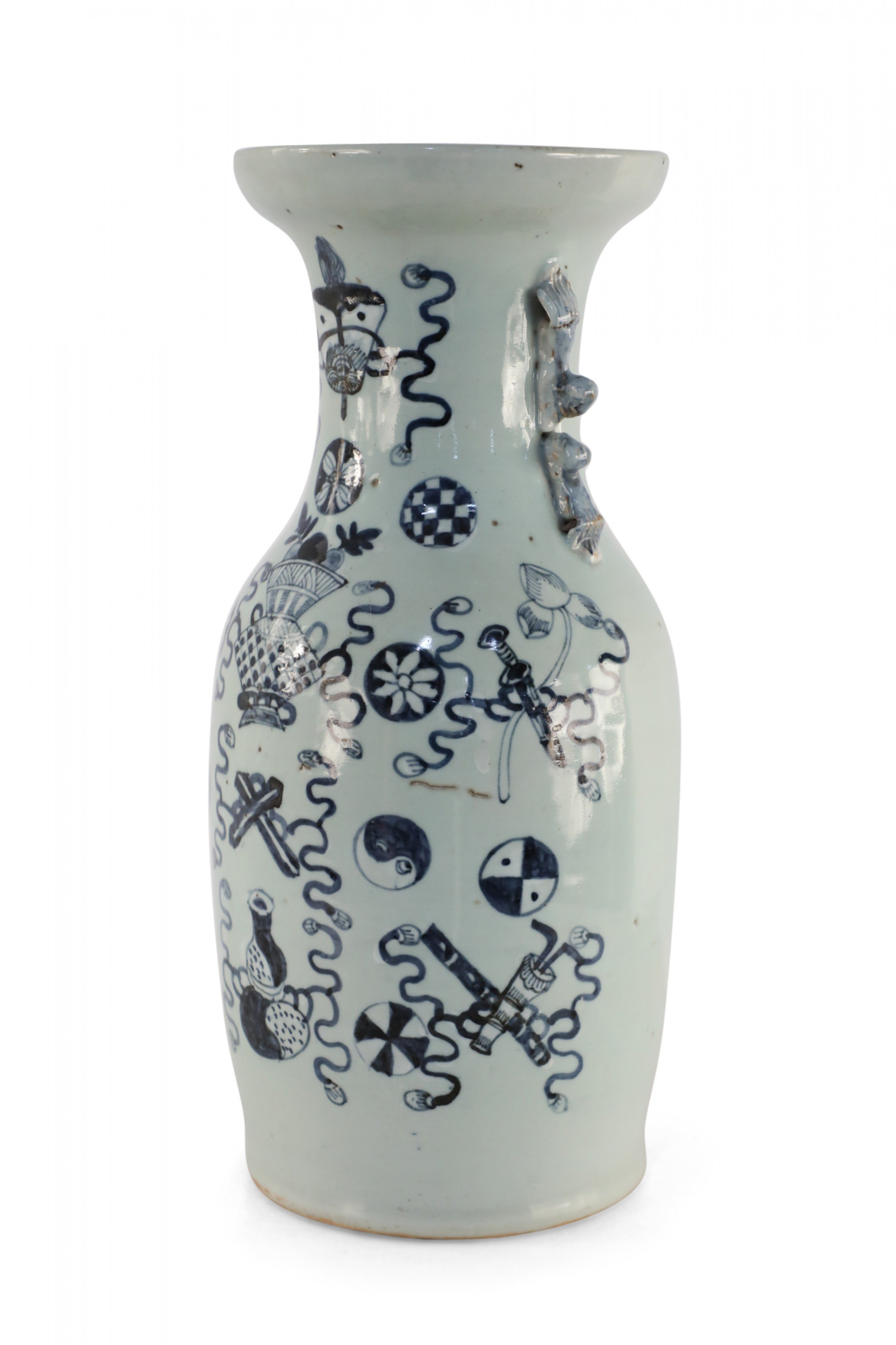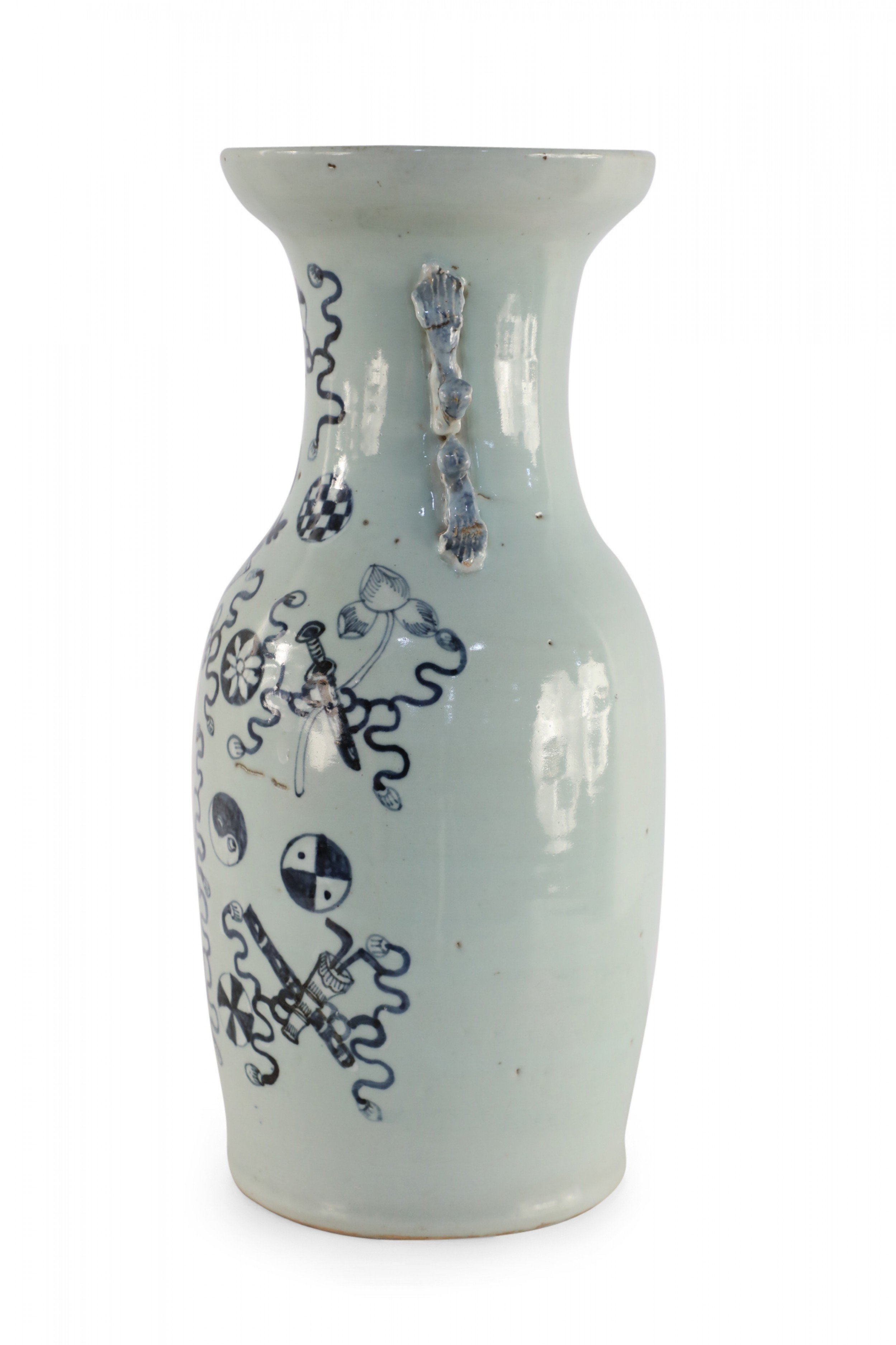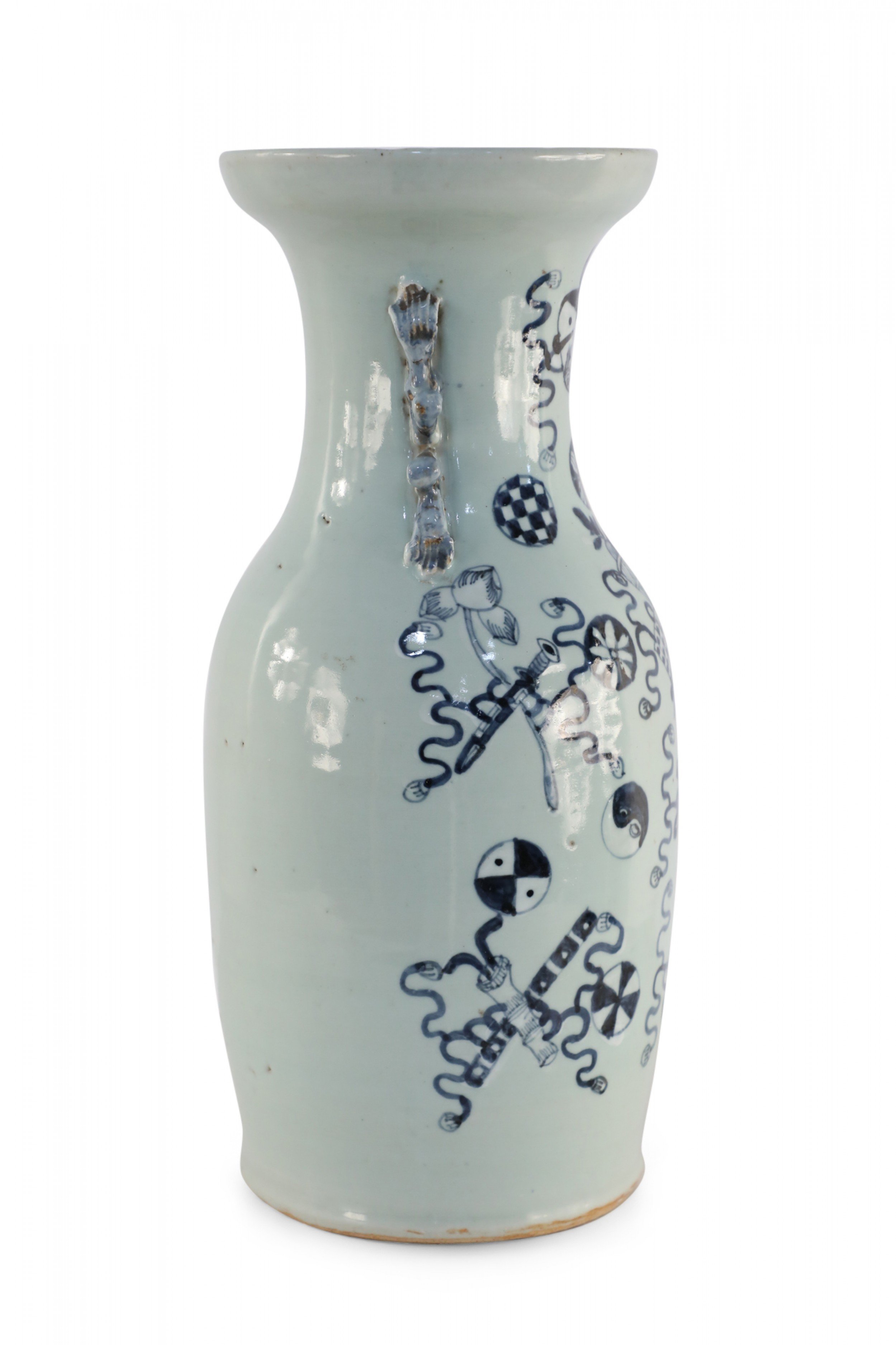 Antique Chinese (Late 19th Century) large, off-white porcelain urn painted with a navy blue pattern featuring Buddhist symbols and other shapes with accented blue scrolled handles..