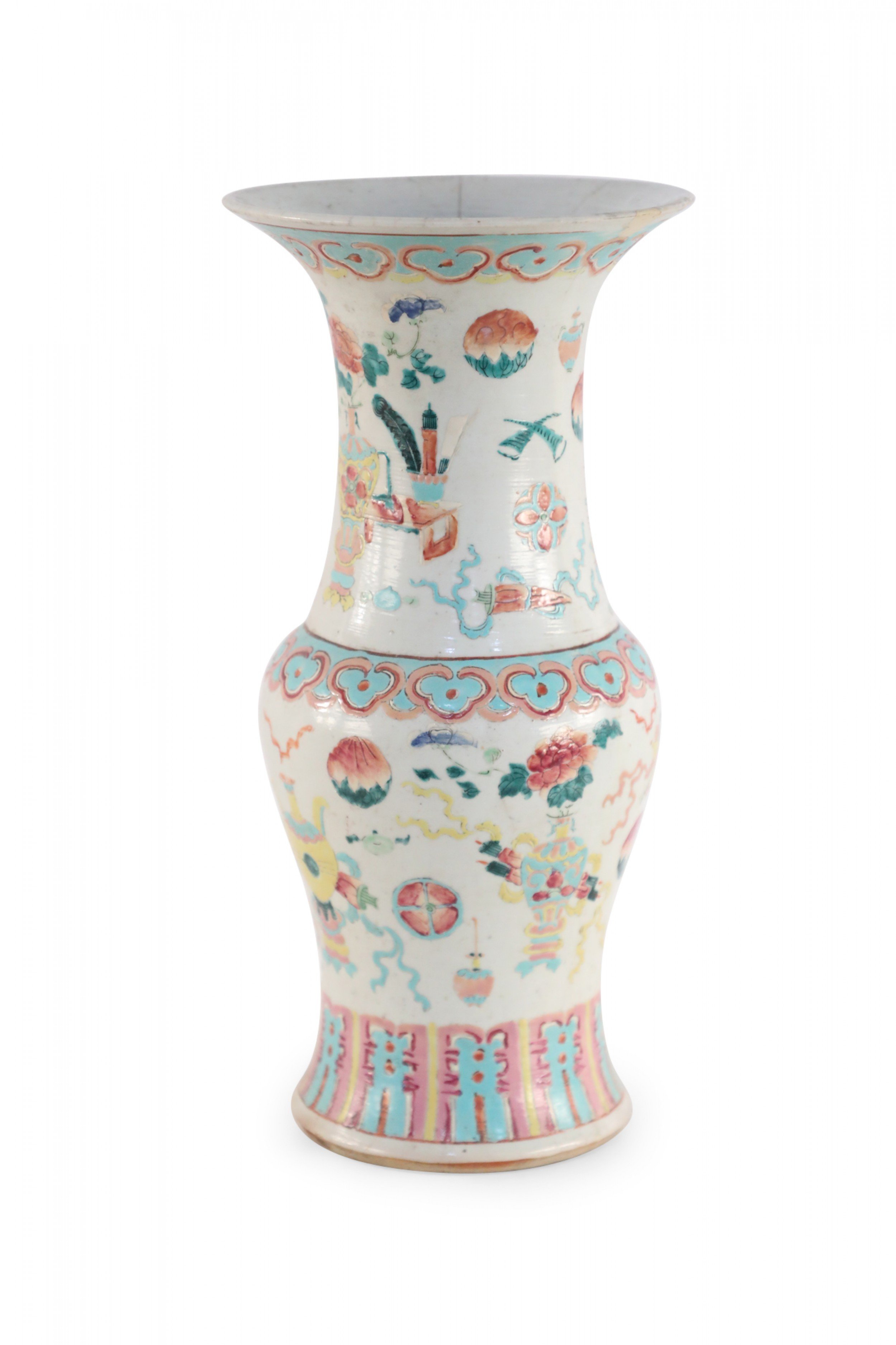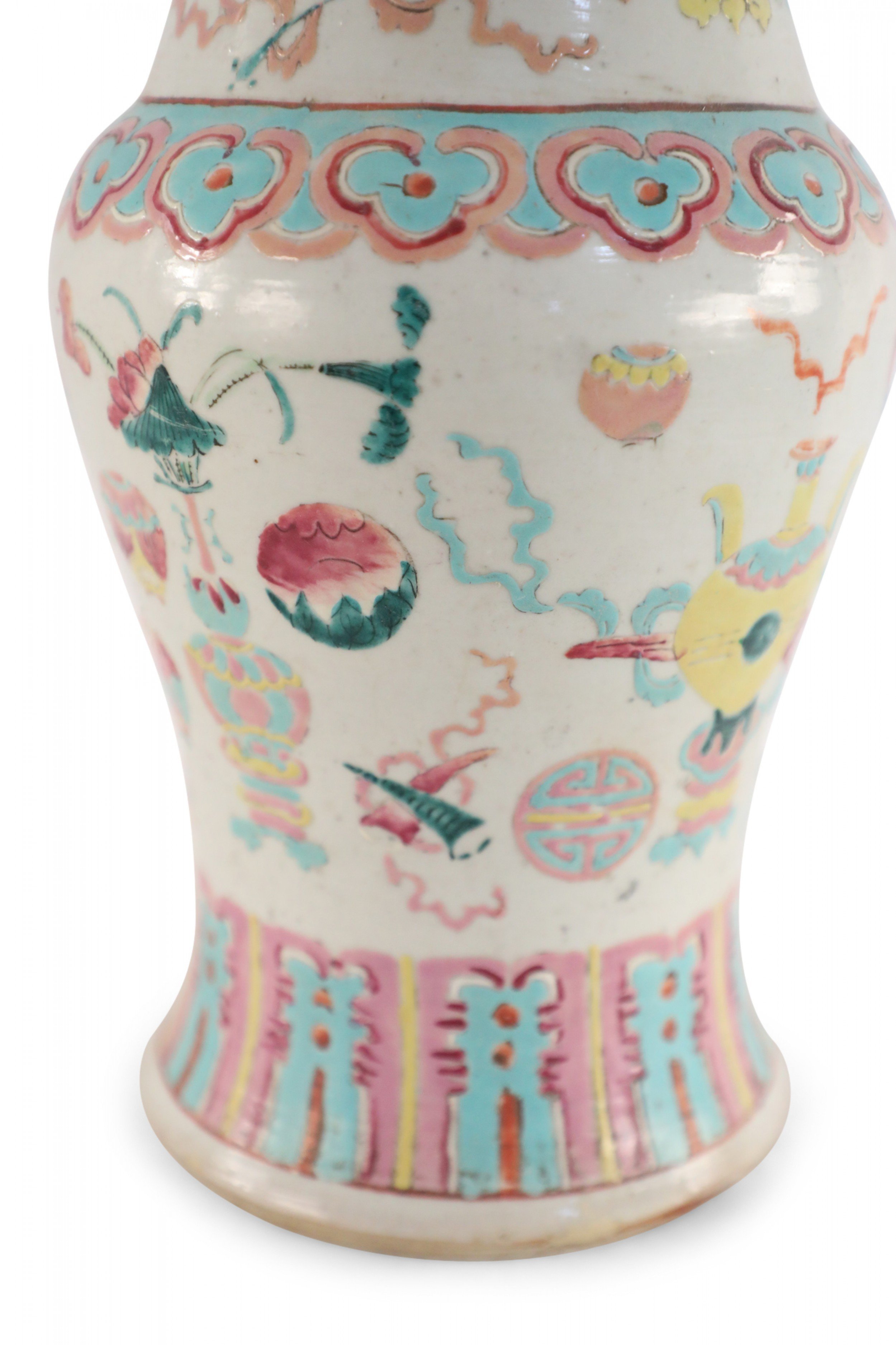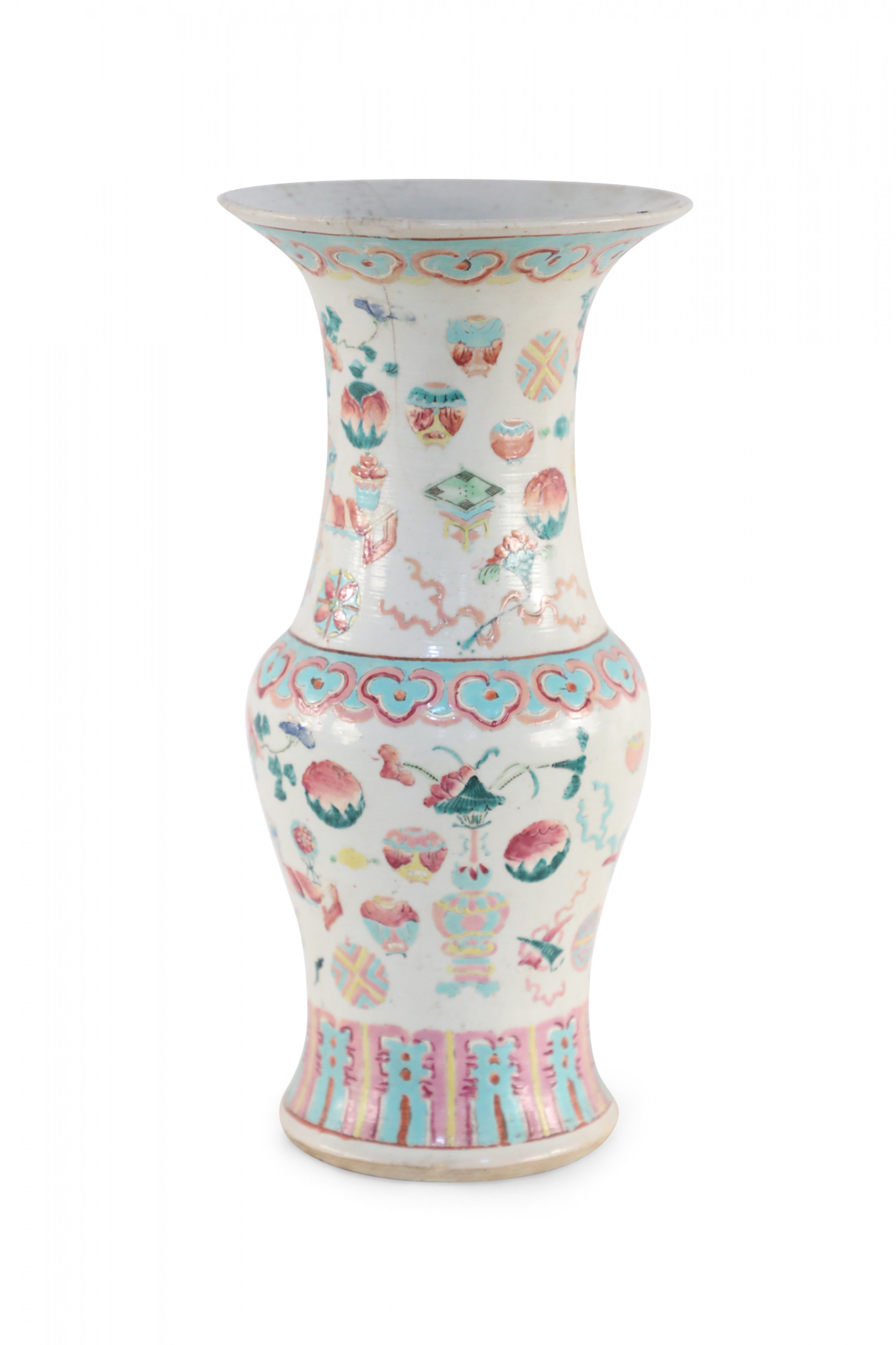 Antique Chinese (Early 20th Century) white porcelain urn painted with pink, light blue, and yellow bogu pattern - a traditional decorative theme that employs items like bronzeware, porcelain, jade pieces, paintings, calligraphy, and bonsai to advocate for elegance and fun. The vase features light blue and pink geometric patterned bands along the top, middle and base.