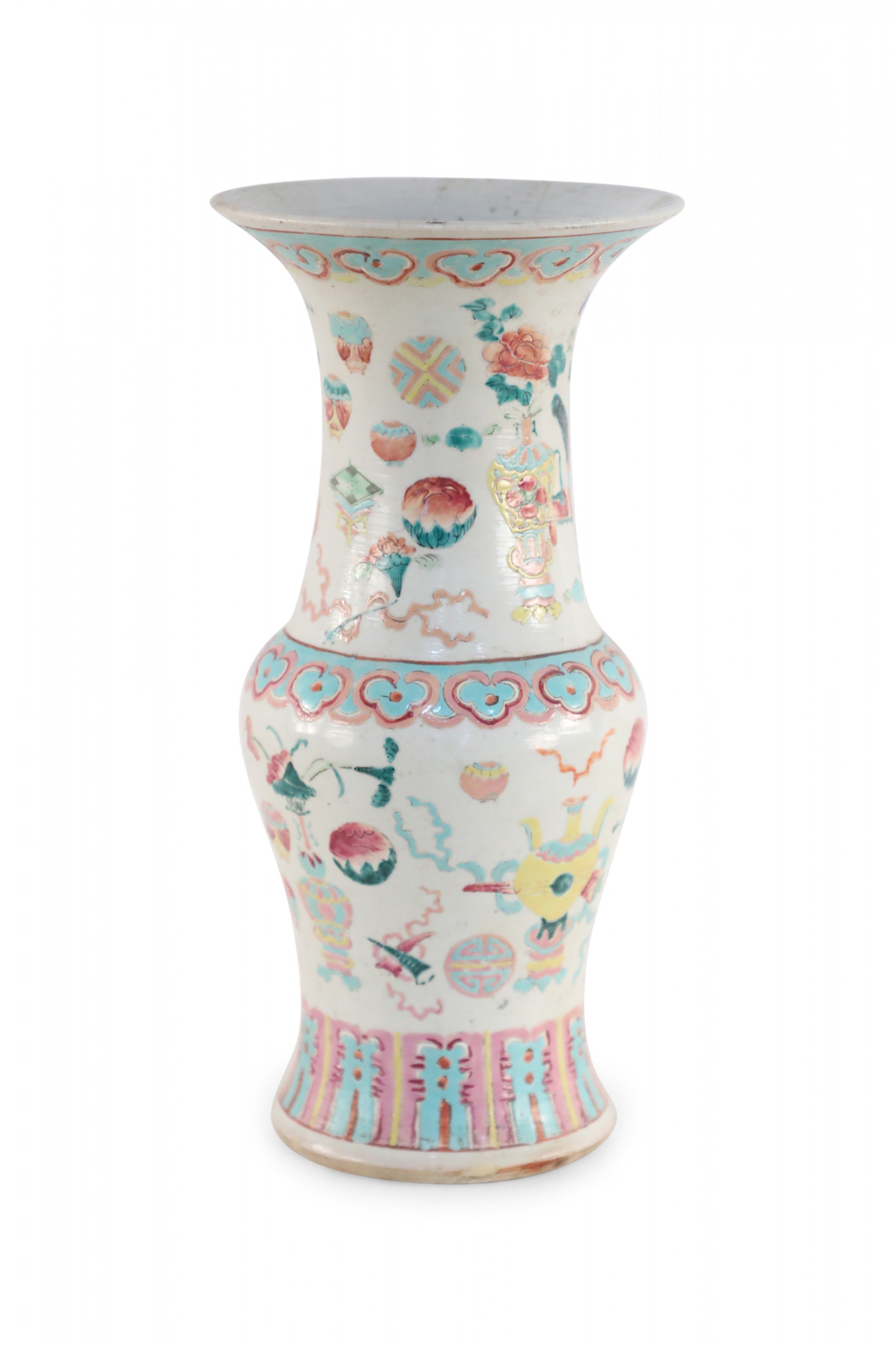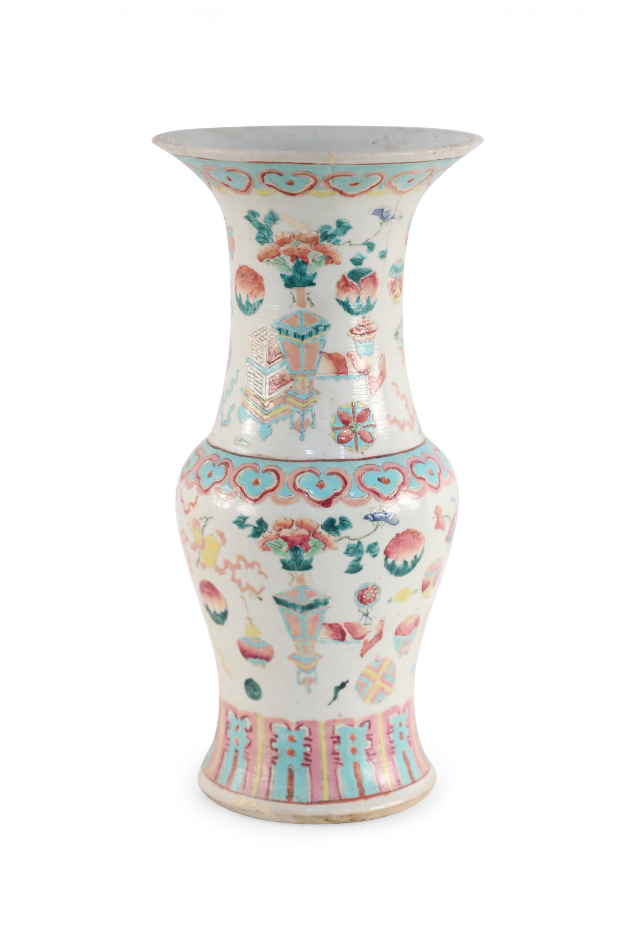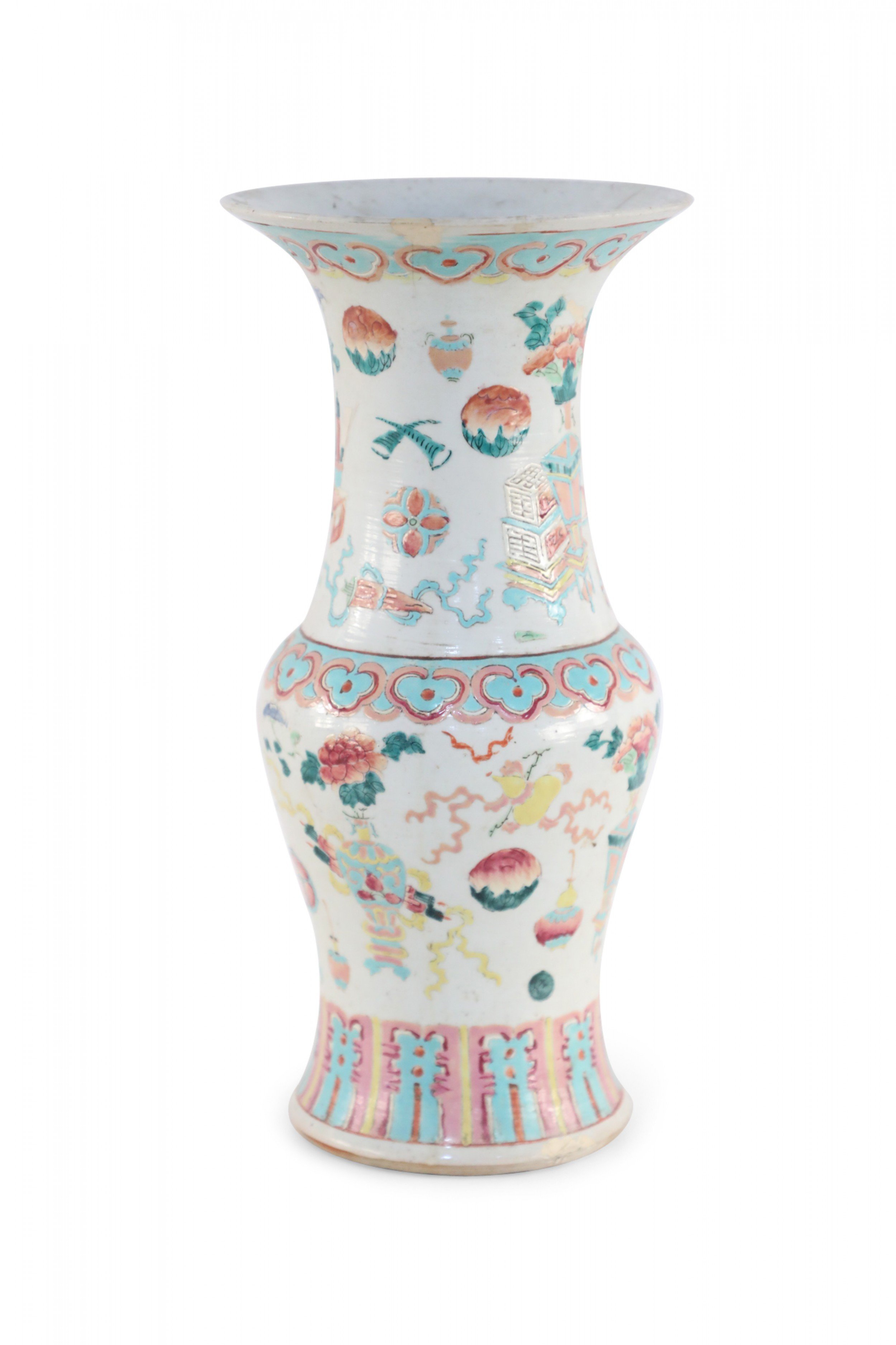 Antique Chinese (Early 20th Century) white porcelain urn painted with pink, light blue, and yellow bogu pattern - a traditional decorative theme that employs items like bronzeware, porcelain, jade pieces, paintings, calligraphy, and bonsai to advocate for elegance and fun. The vase features light blue and pink geometric patterned bands along the top, middle and base.