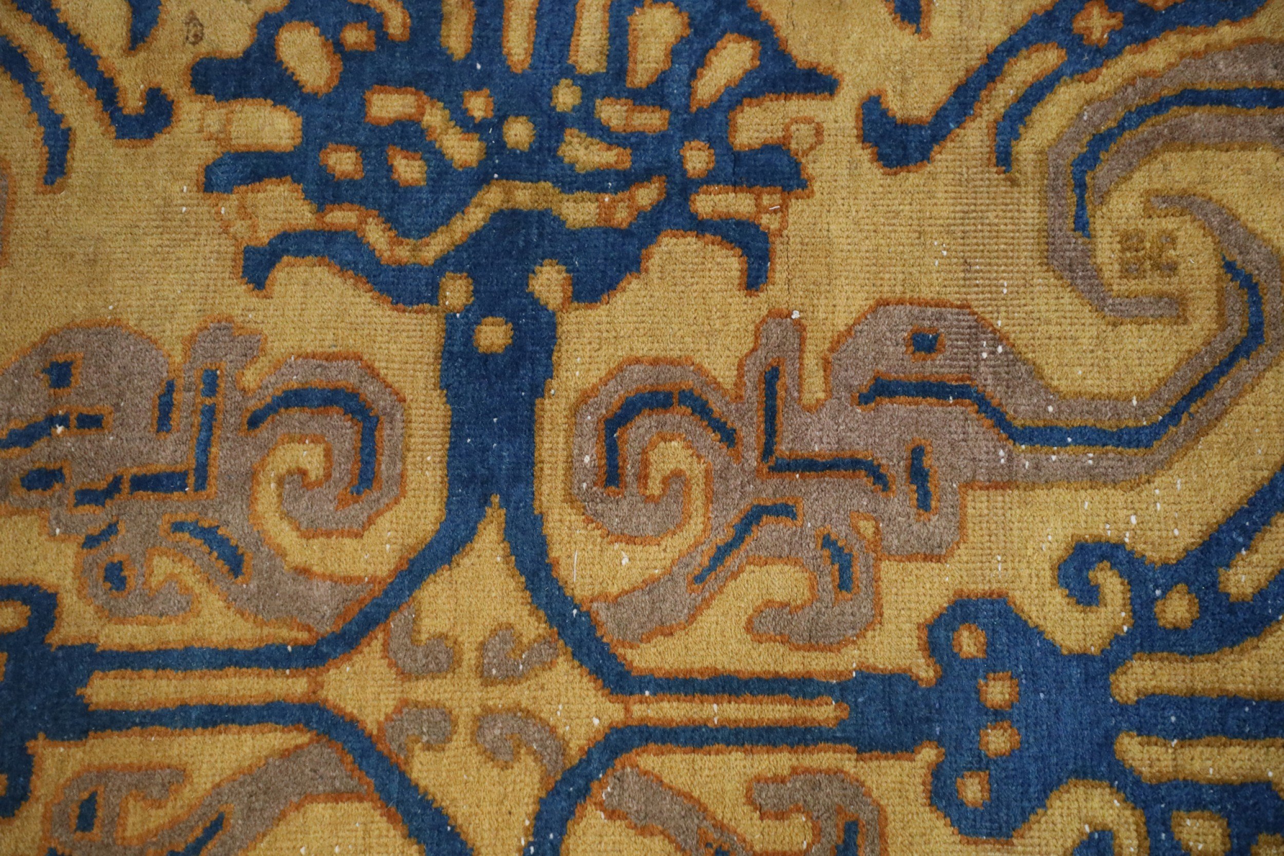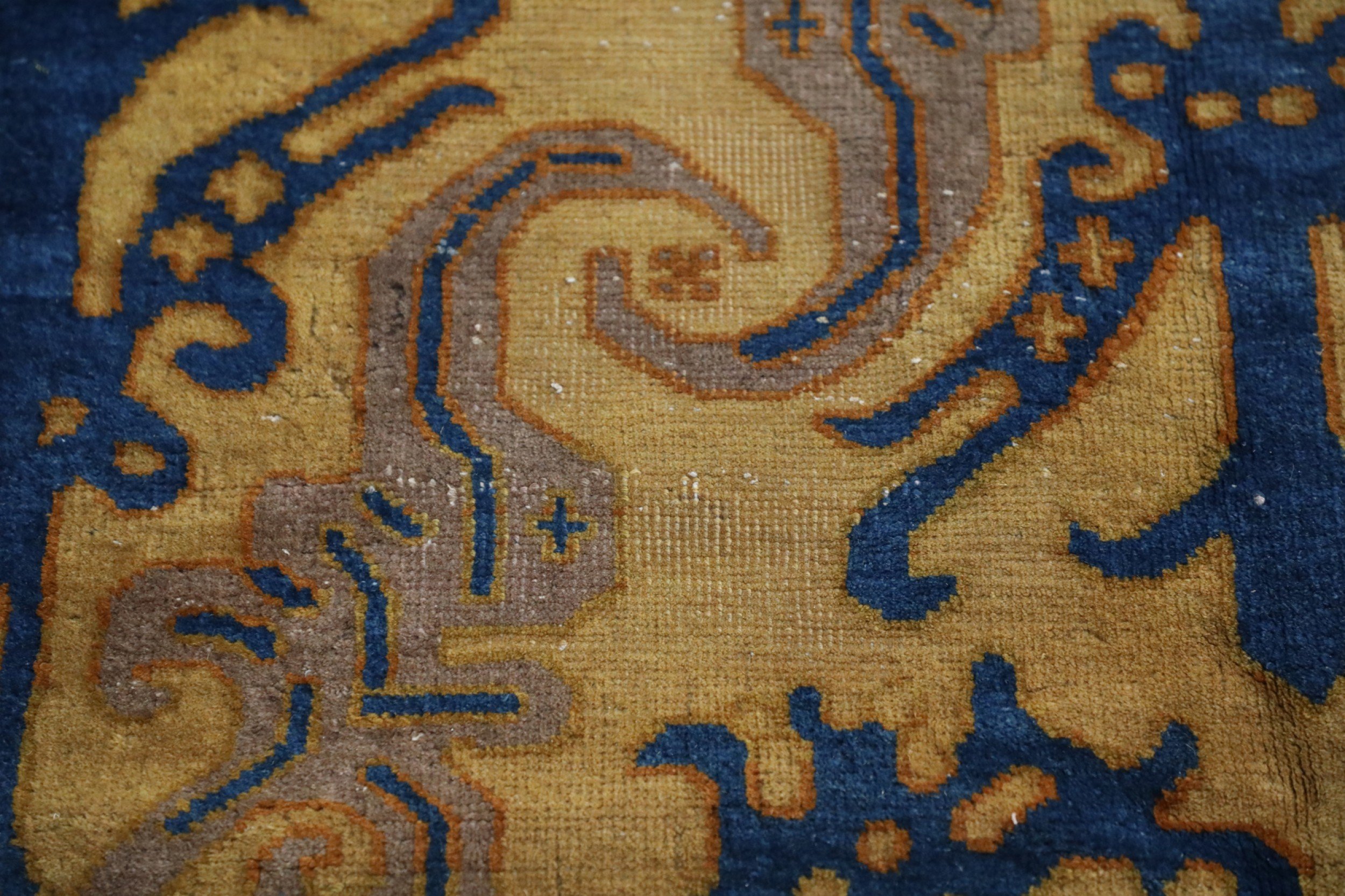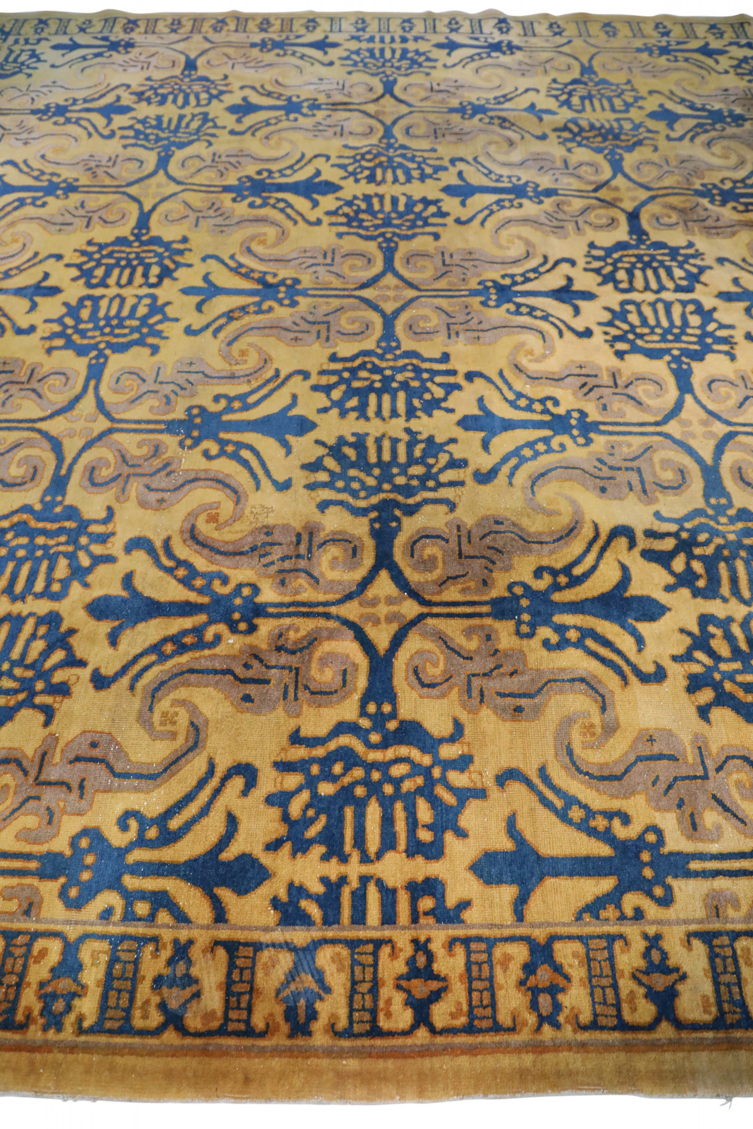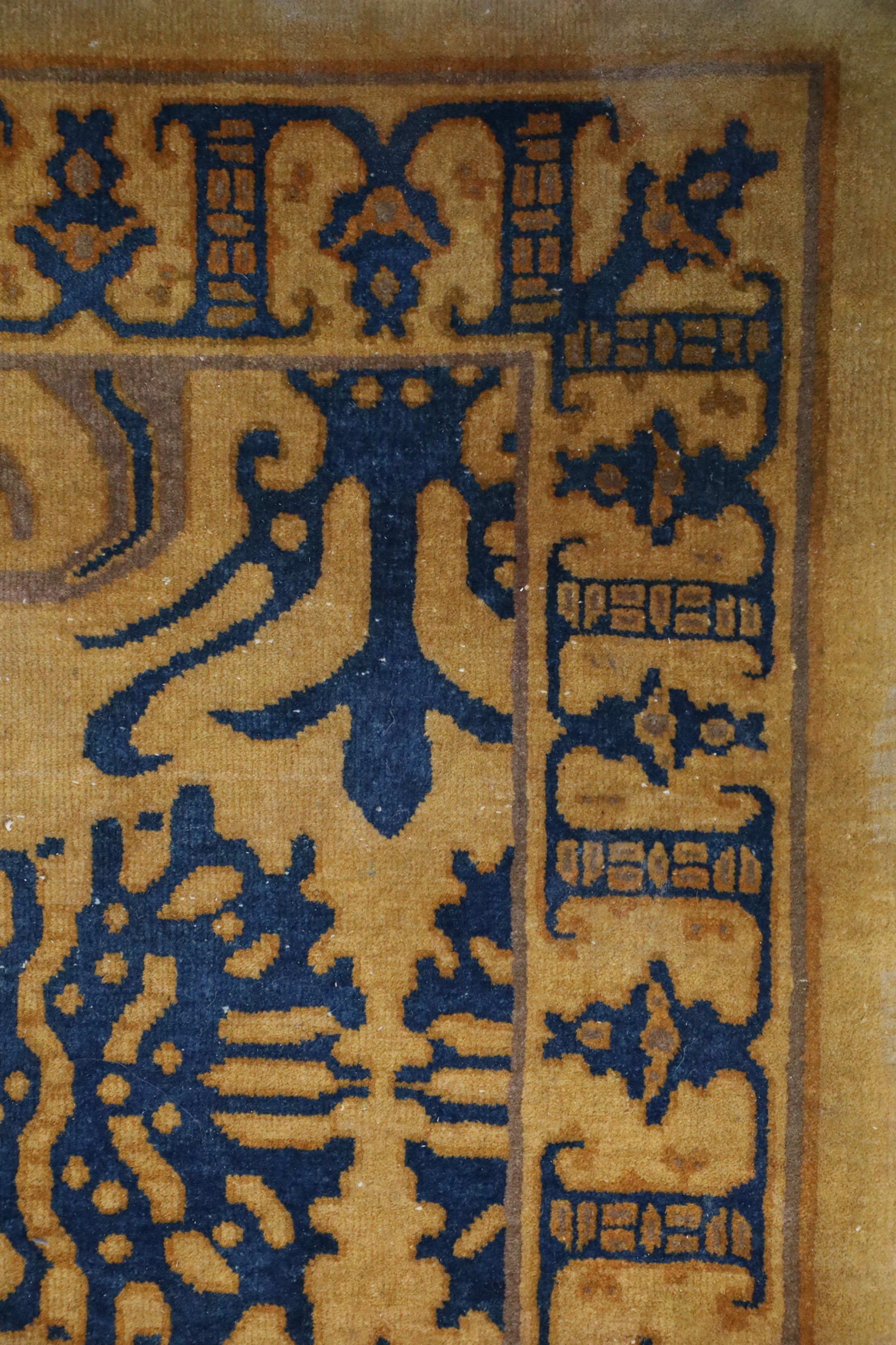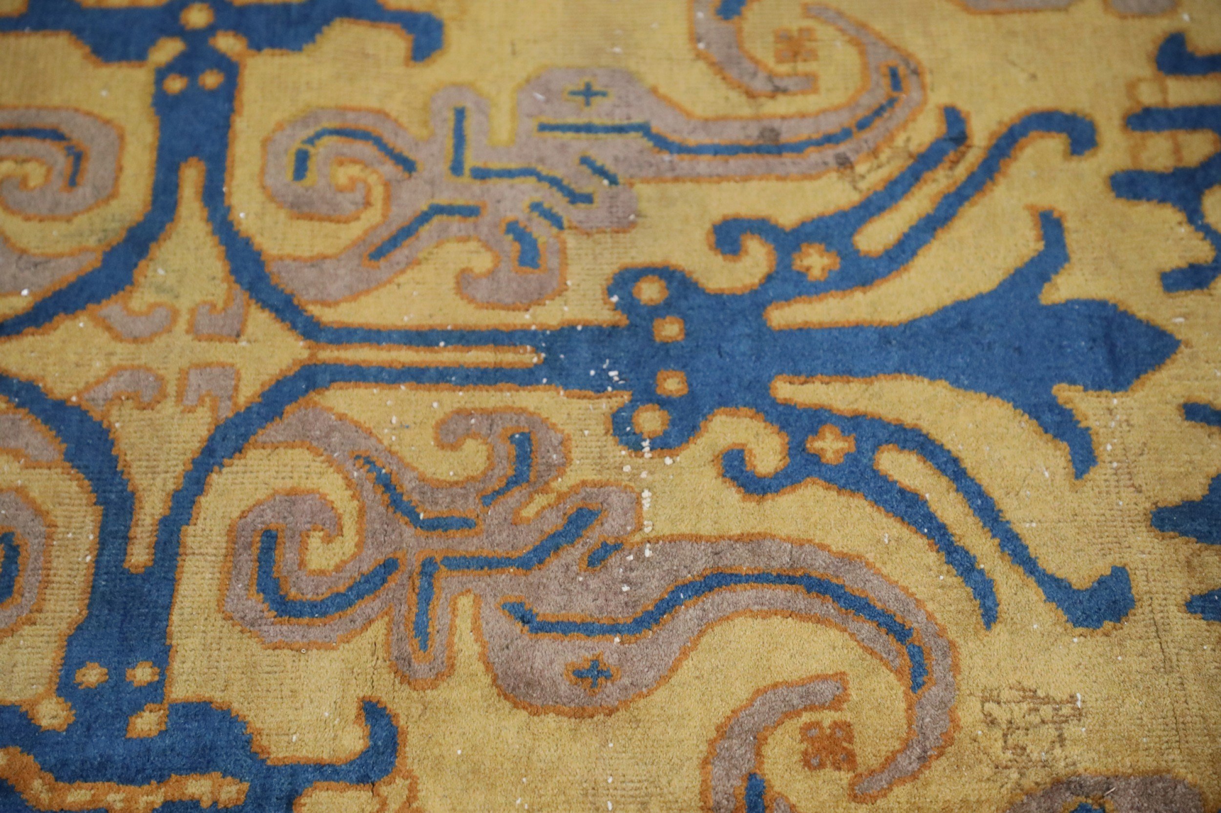Antique Chinese (late 19th century) high pile carpet with a yellow field and blue and ochre details. (11 3/4' x 17 1/3')