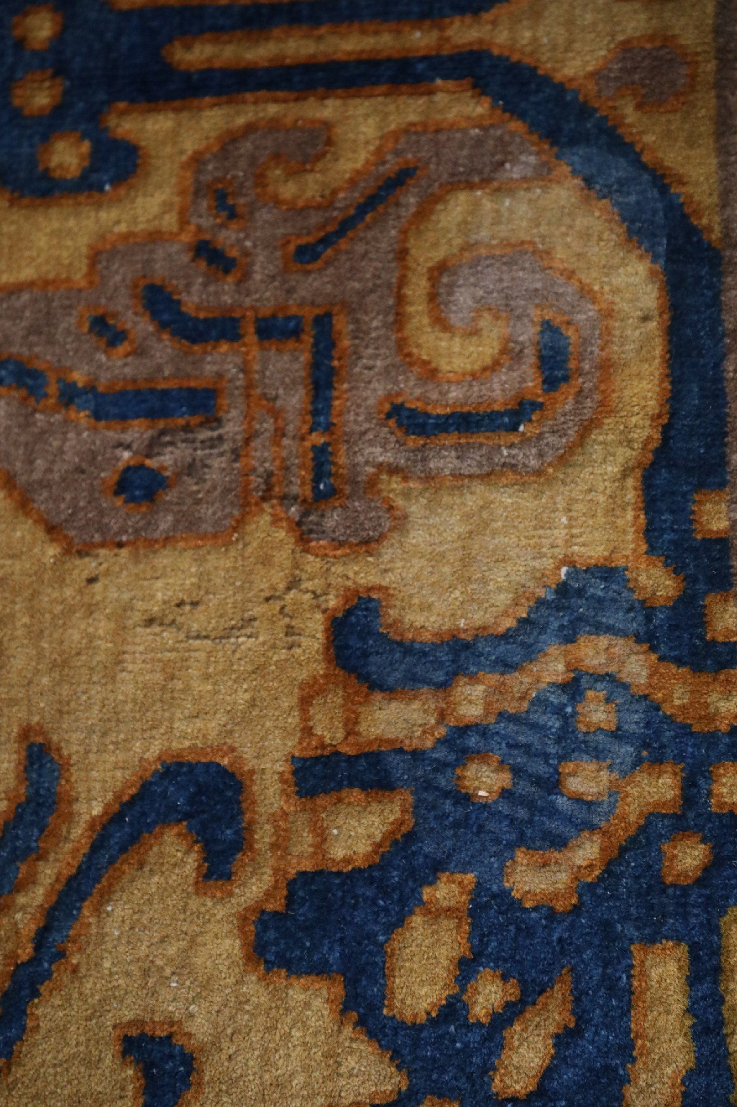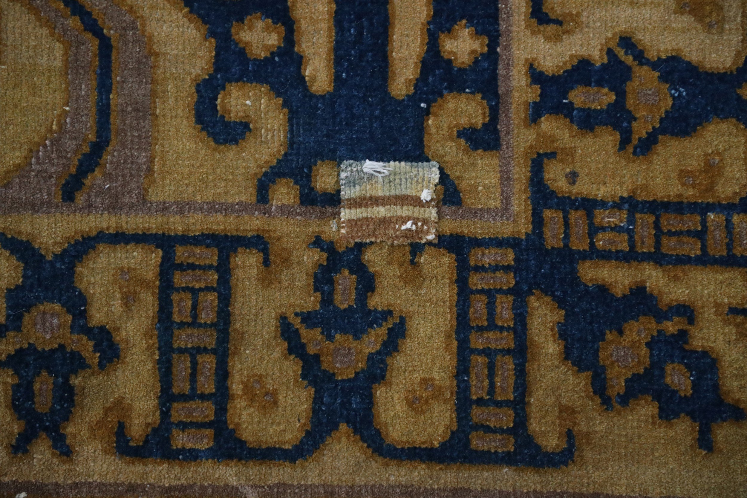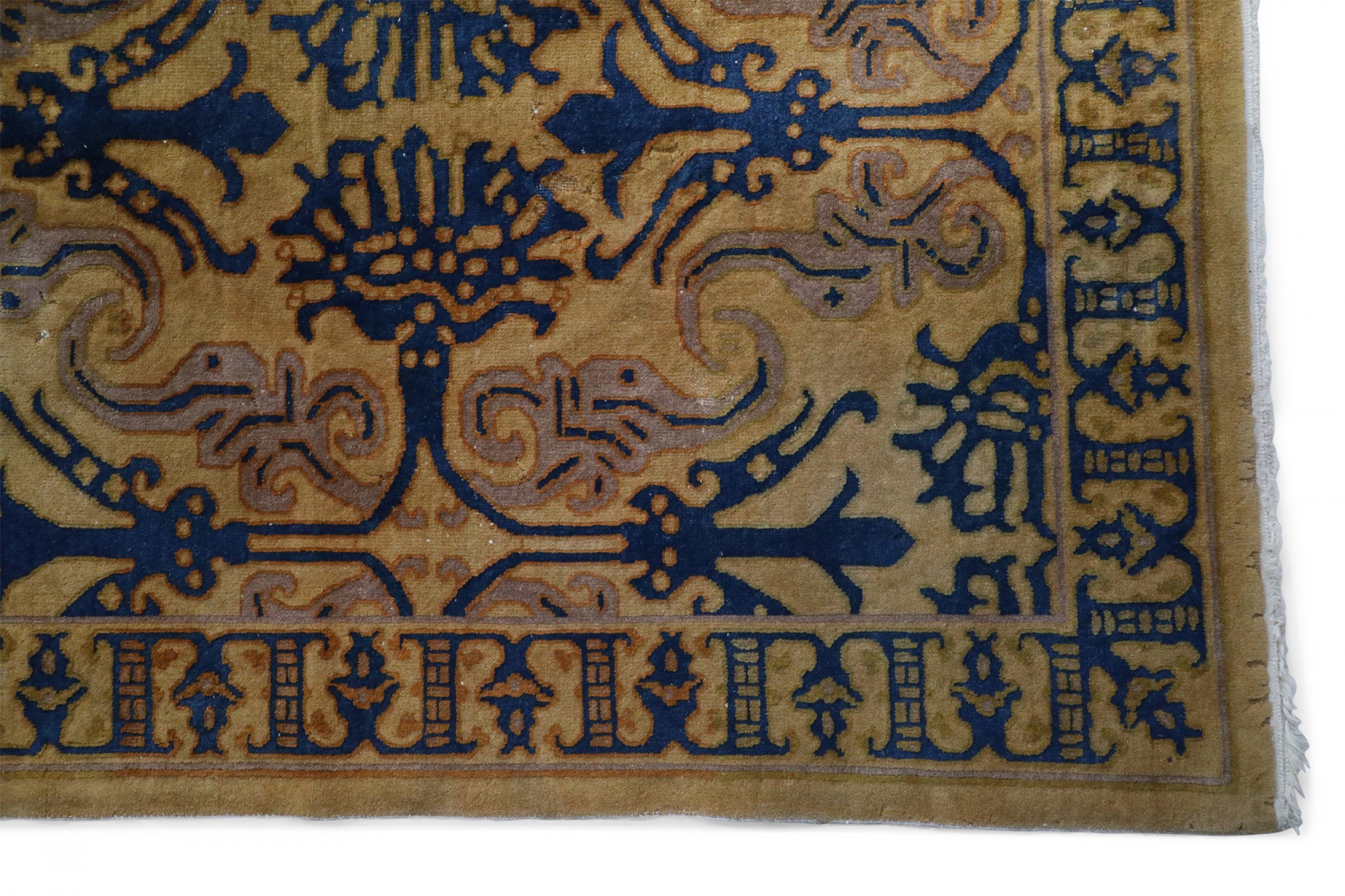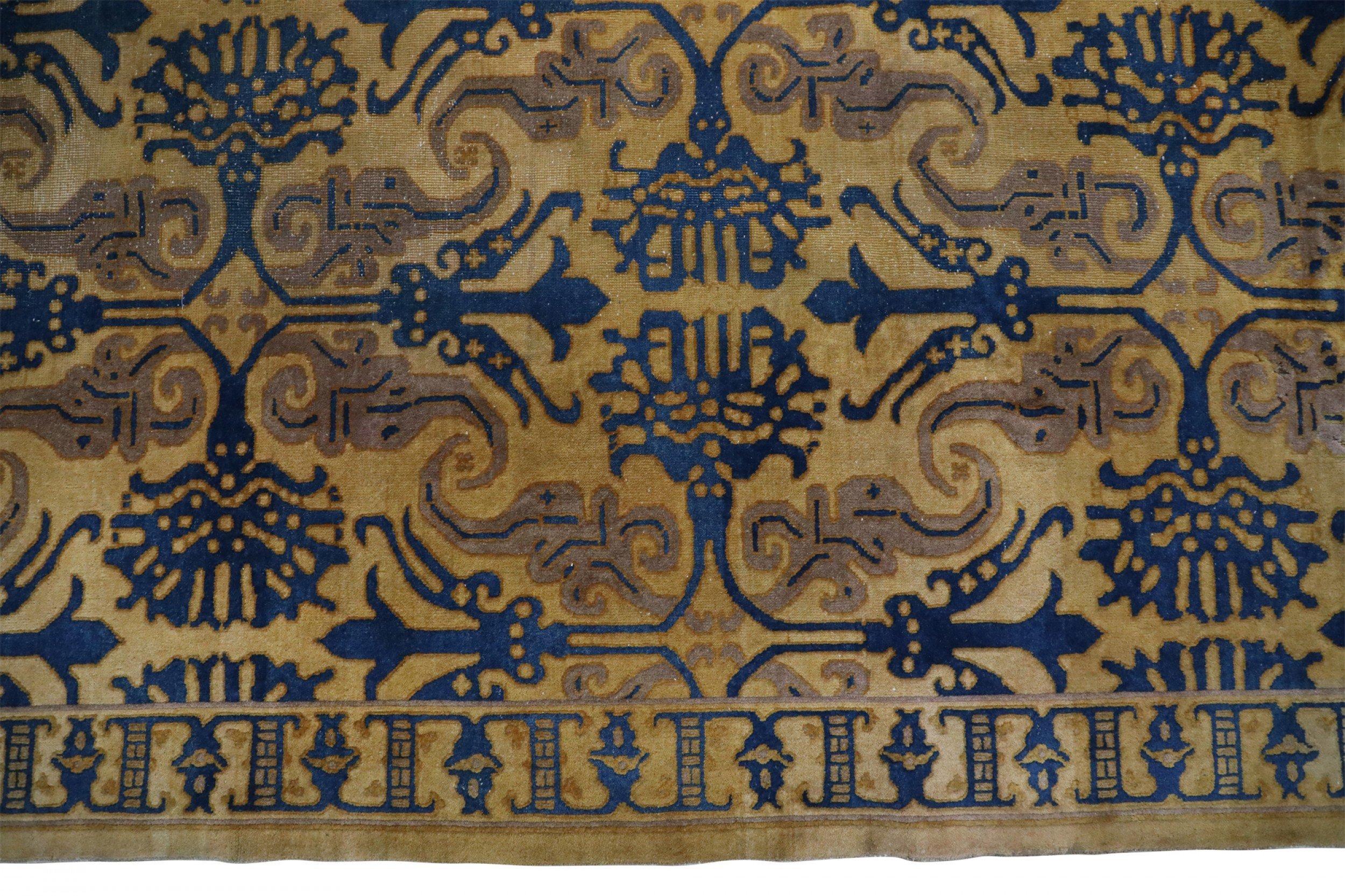Antique Chinese (late 19th century) high pile carpet with a yellow field and blue and ochre details. (11 3/4' x 17 1/3')