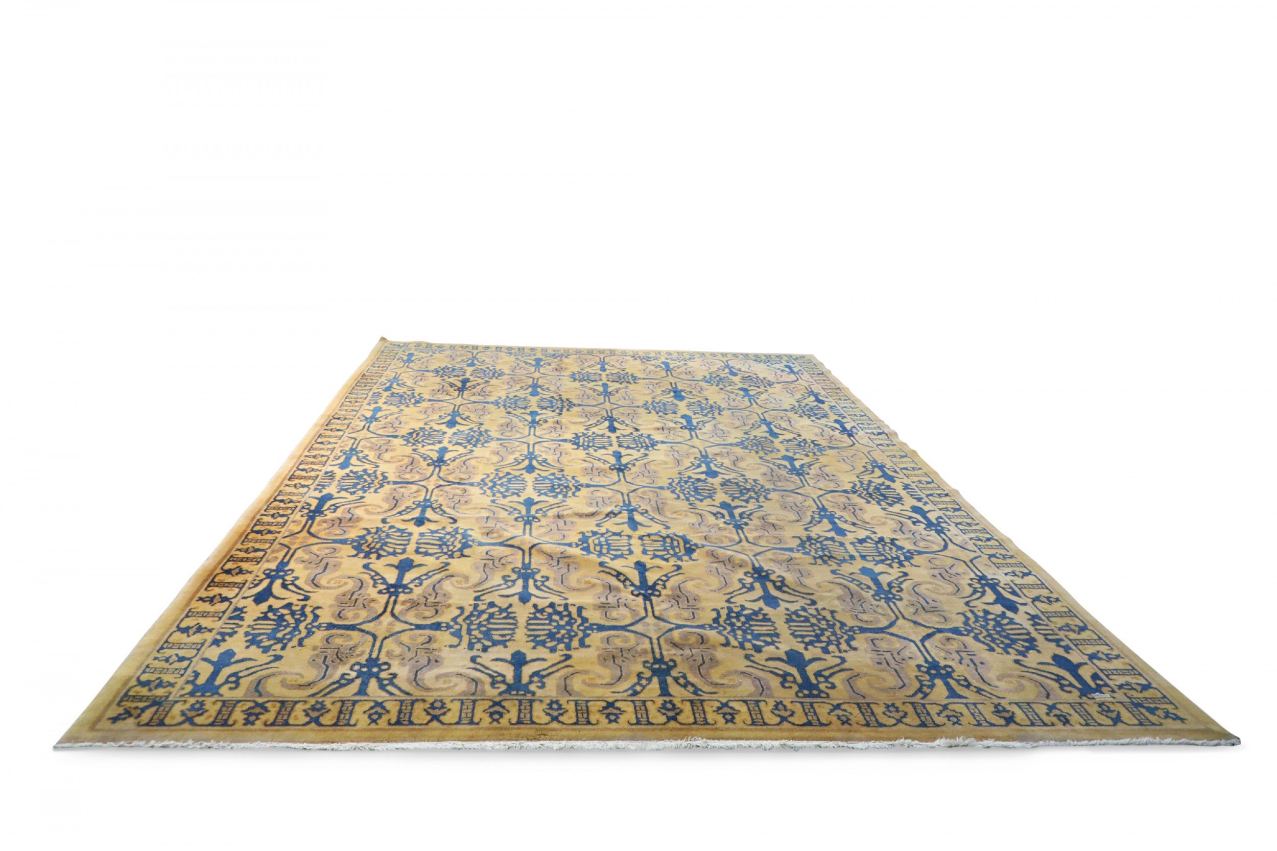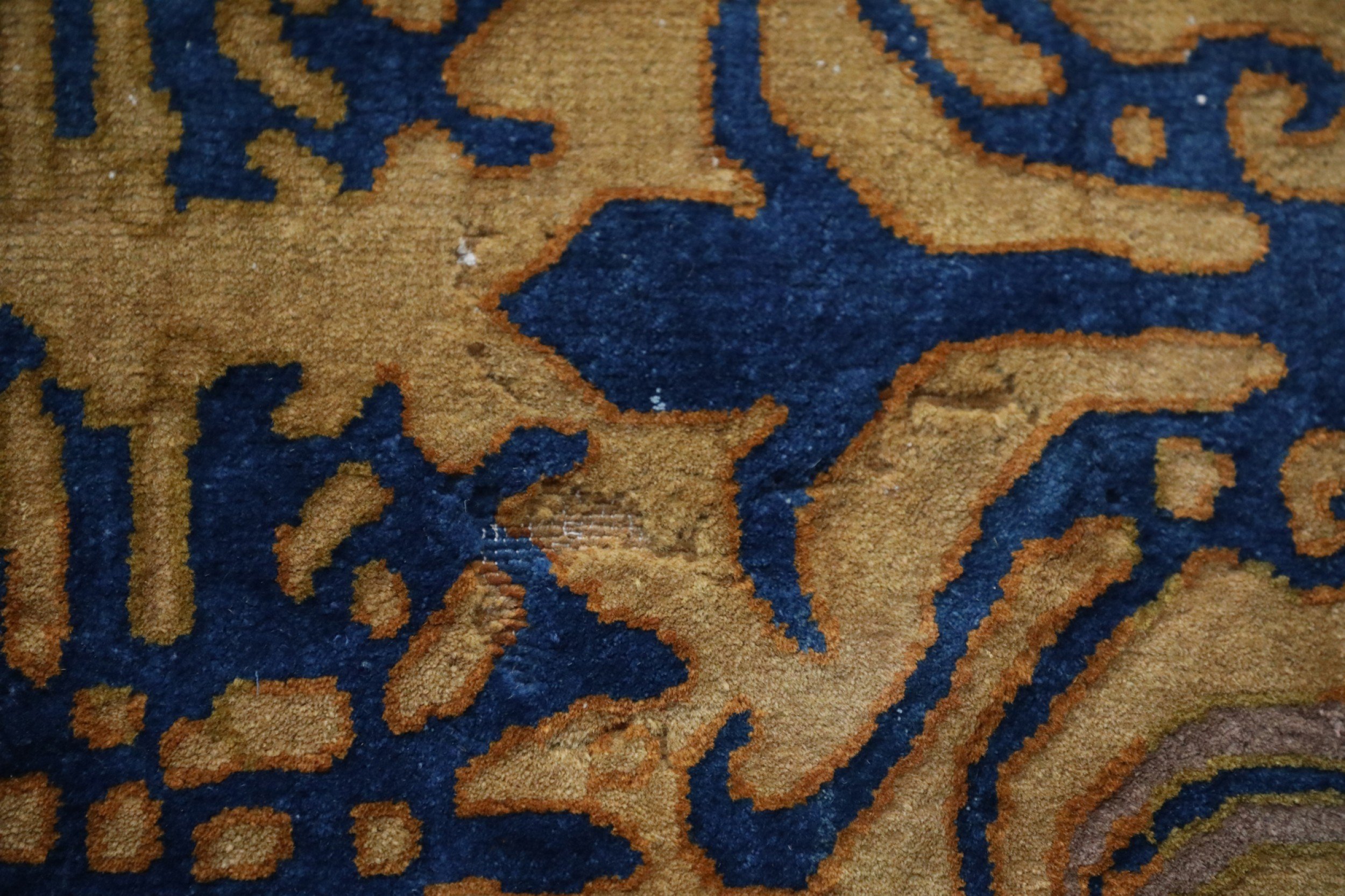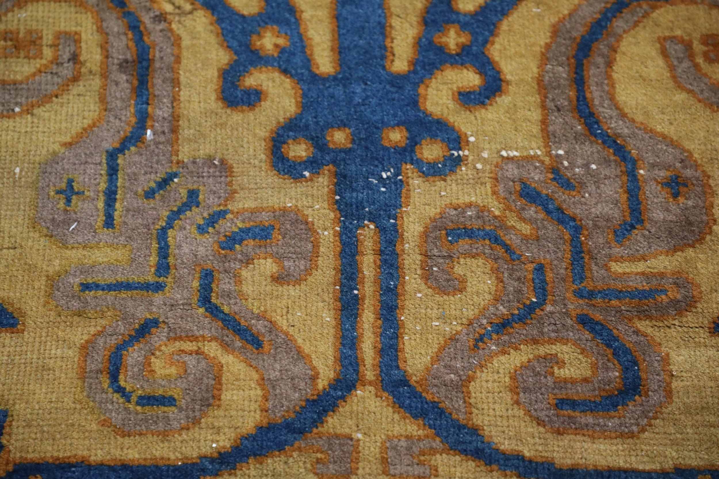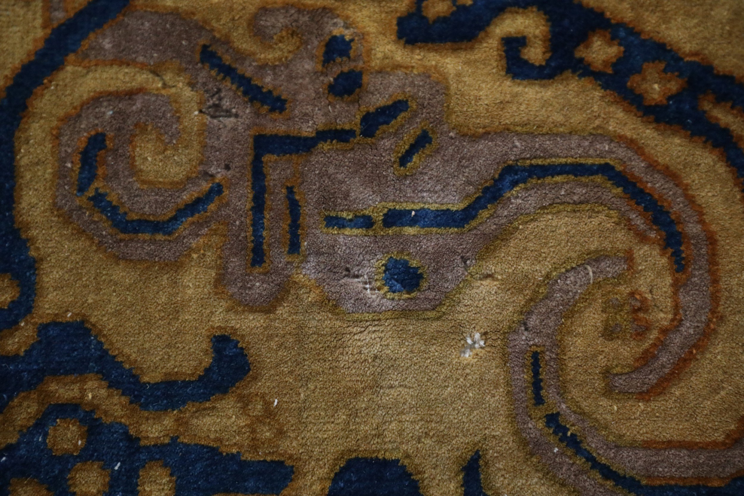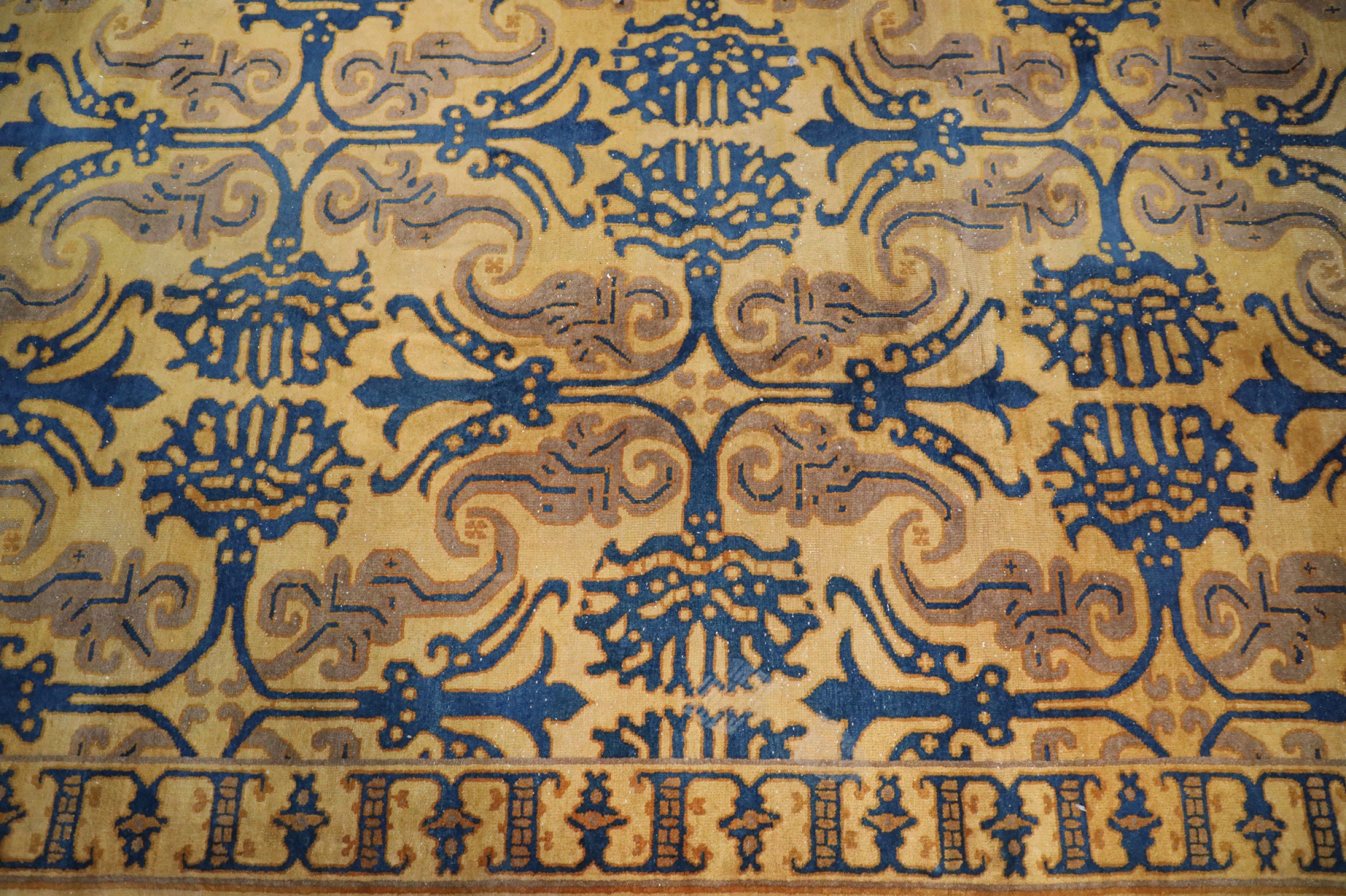 Antique Chinese (late 19th century) high pile carpet with a yellow field and blue and ochre details. (11 3/4' x 17 1/3')