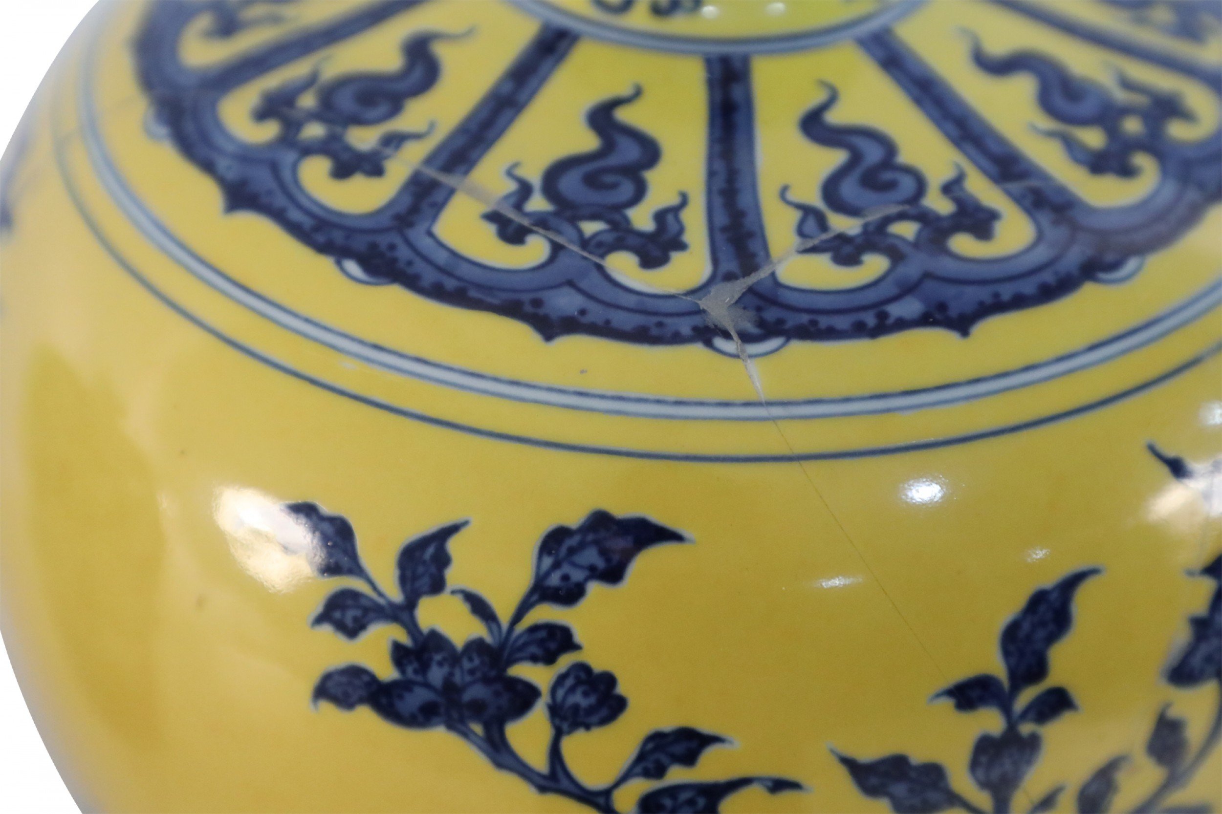 Antique Chinese (19th Century) yellow porcelain Meiping vase decorated with blue florals and geometric bands around the top and the base (mark on bottom, see photos)..