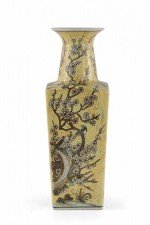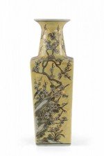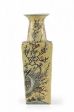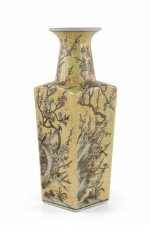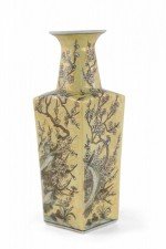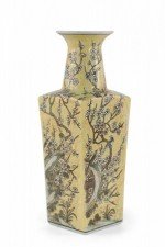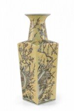 Chinese yellow porcelain sleeve vase with cherry blossom branches and birds in a pale neutral palette, wrapping all four sides and growing up the neck..