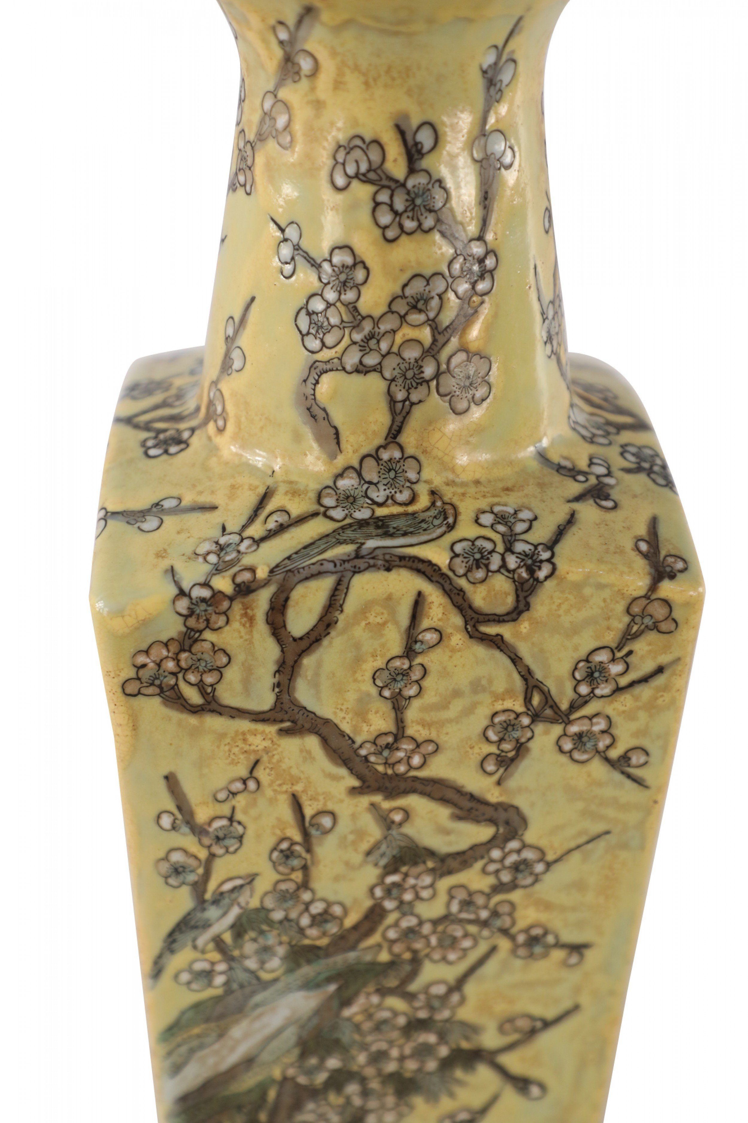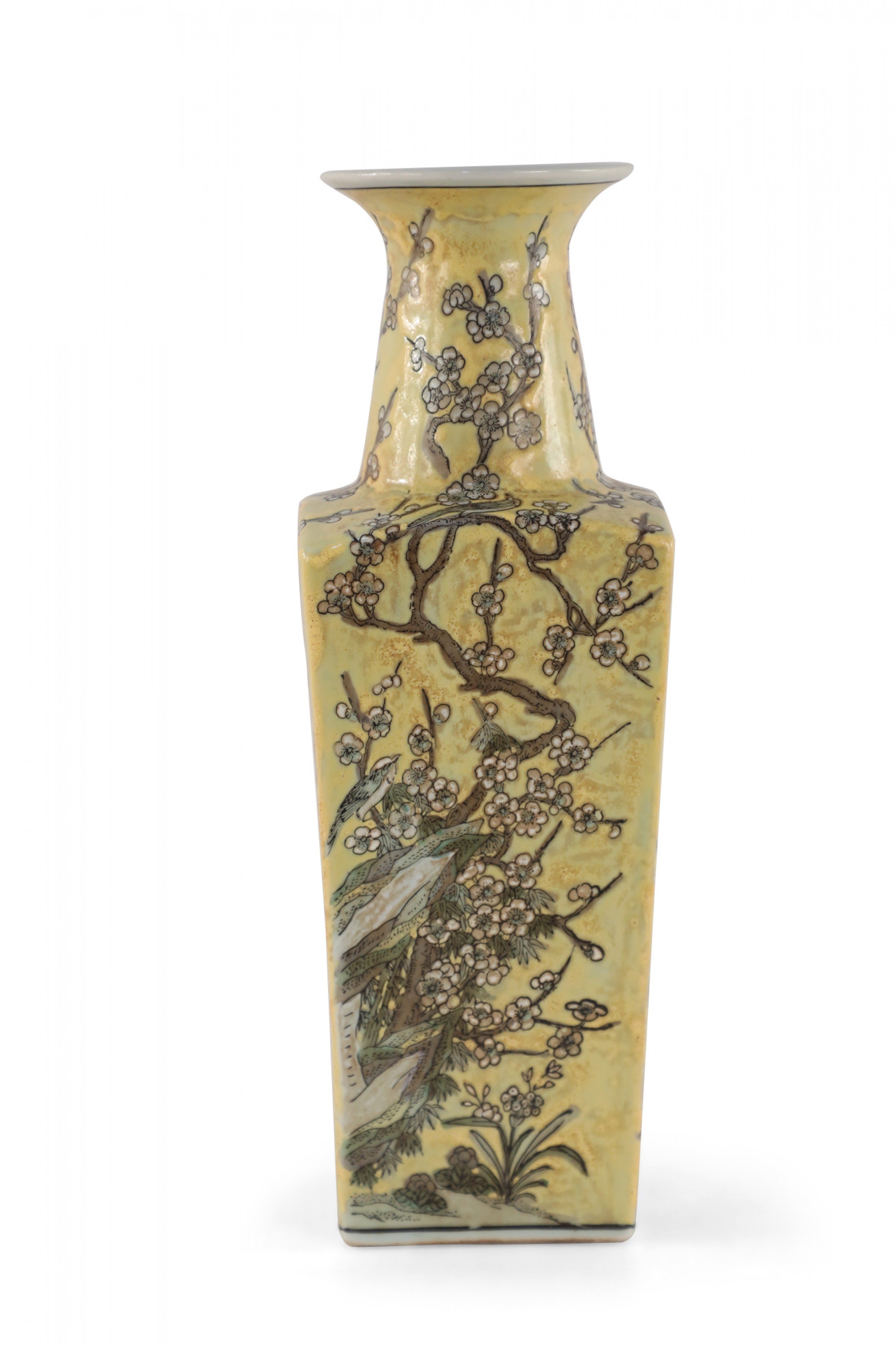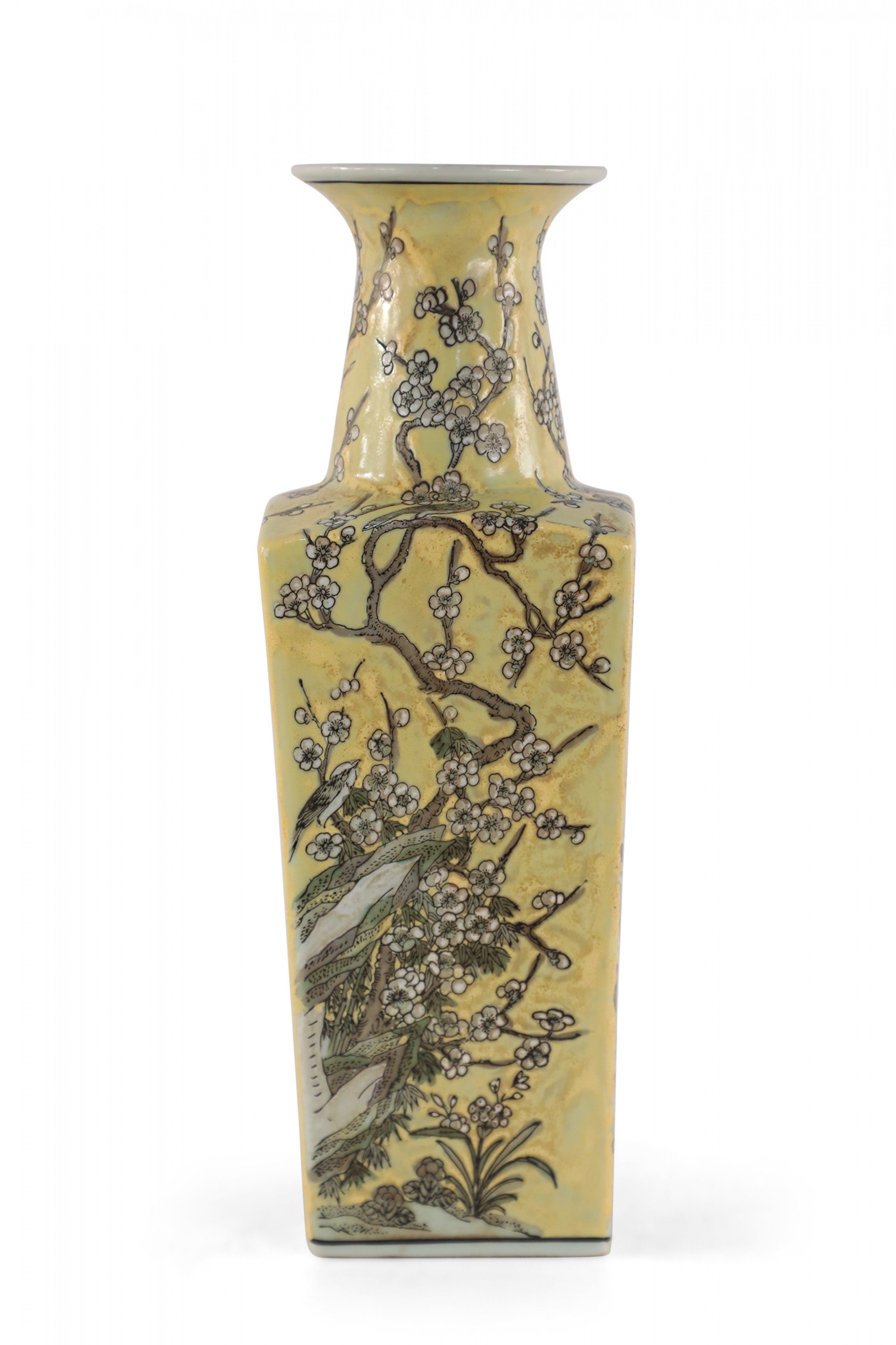 Chinese yellow porcelain sleeve vase with cherry blossom branches and birds in a pale neutral palette, wrapping all four sides and growing up the neck.