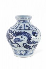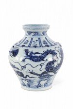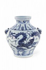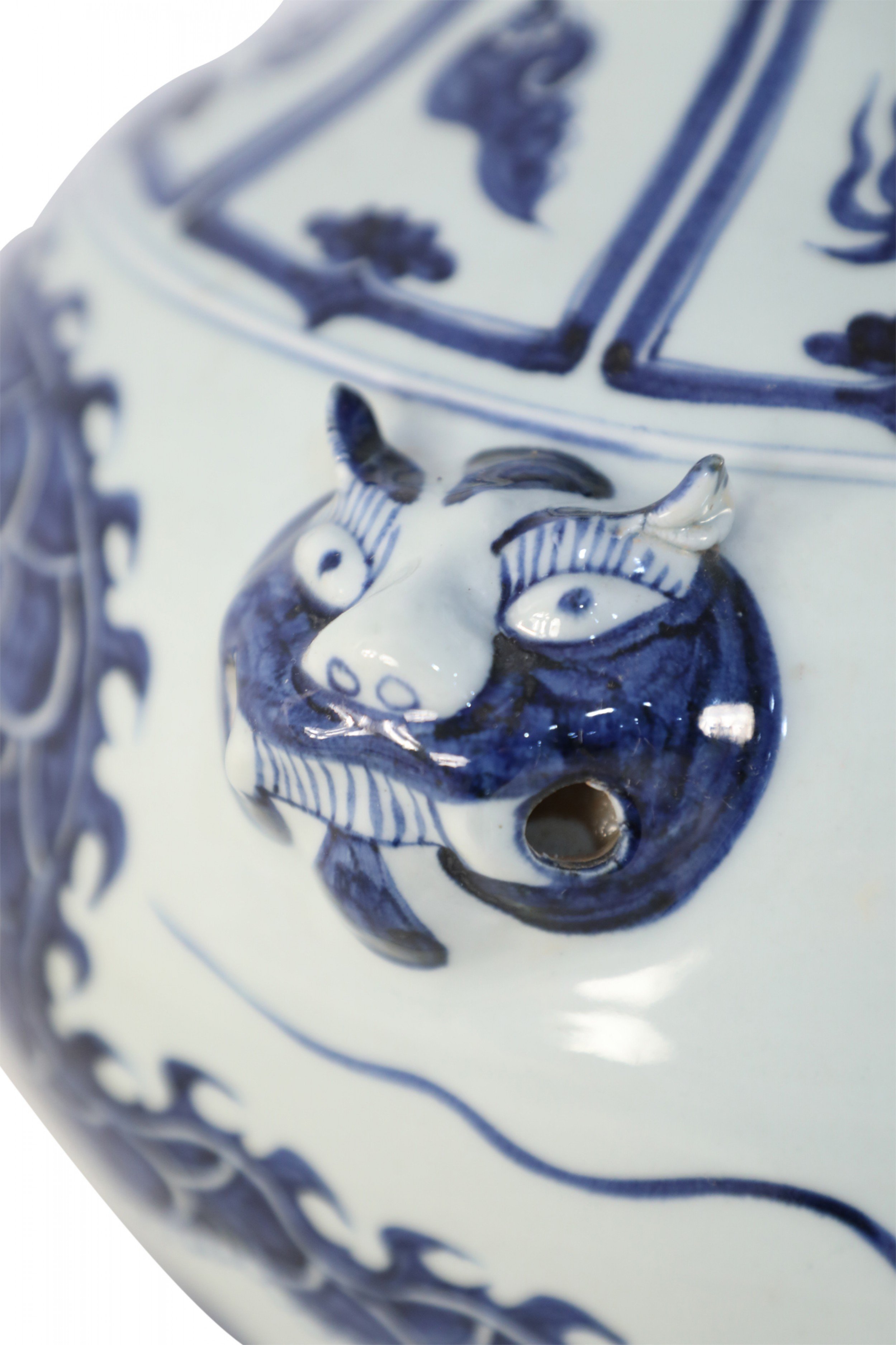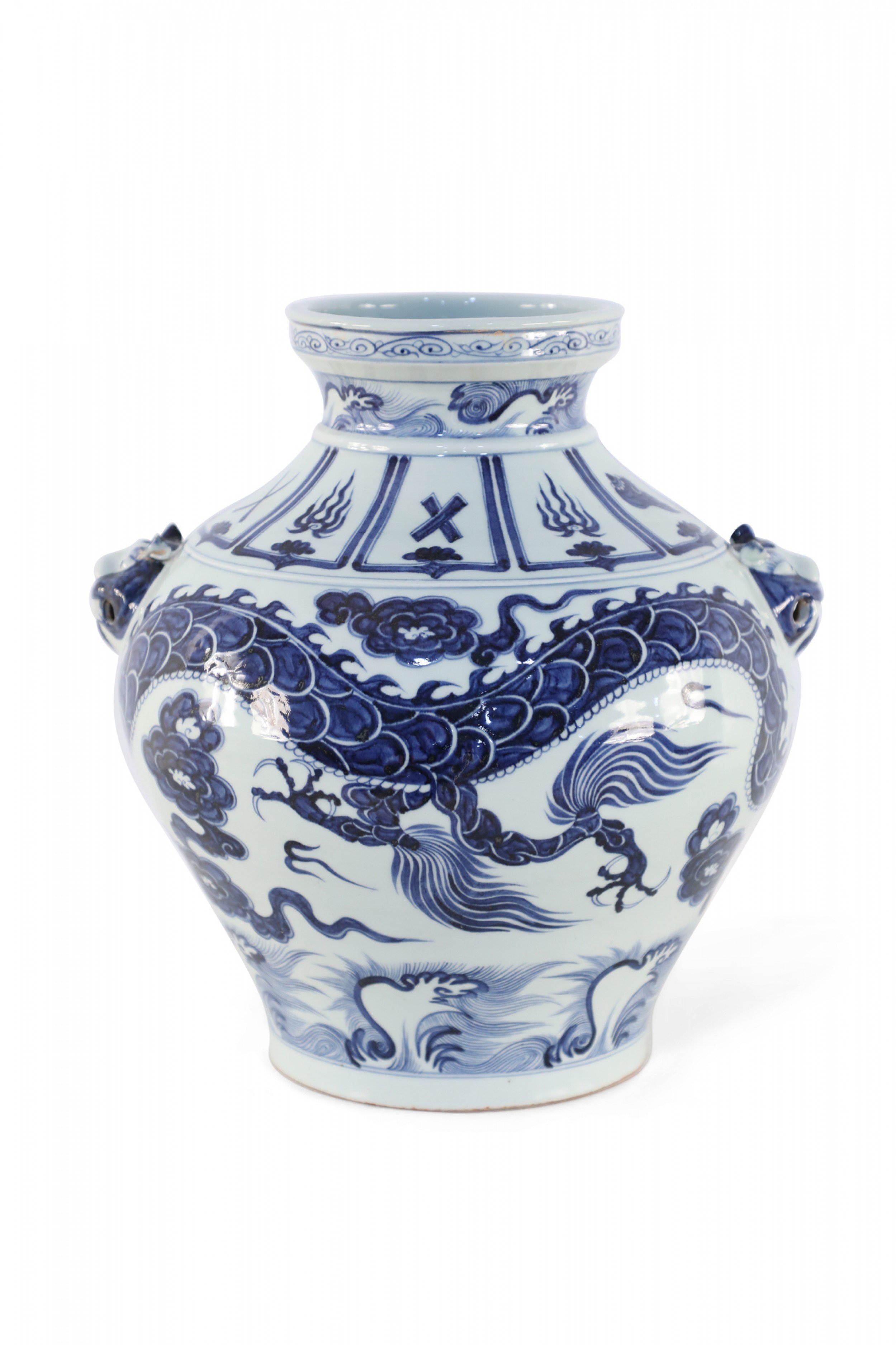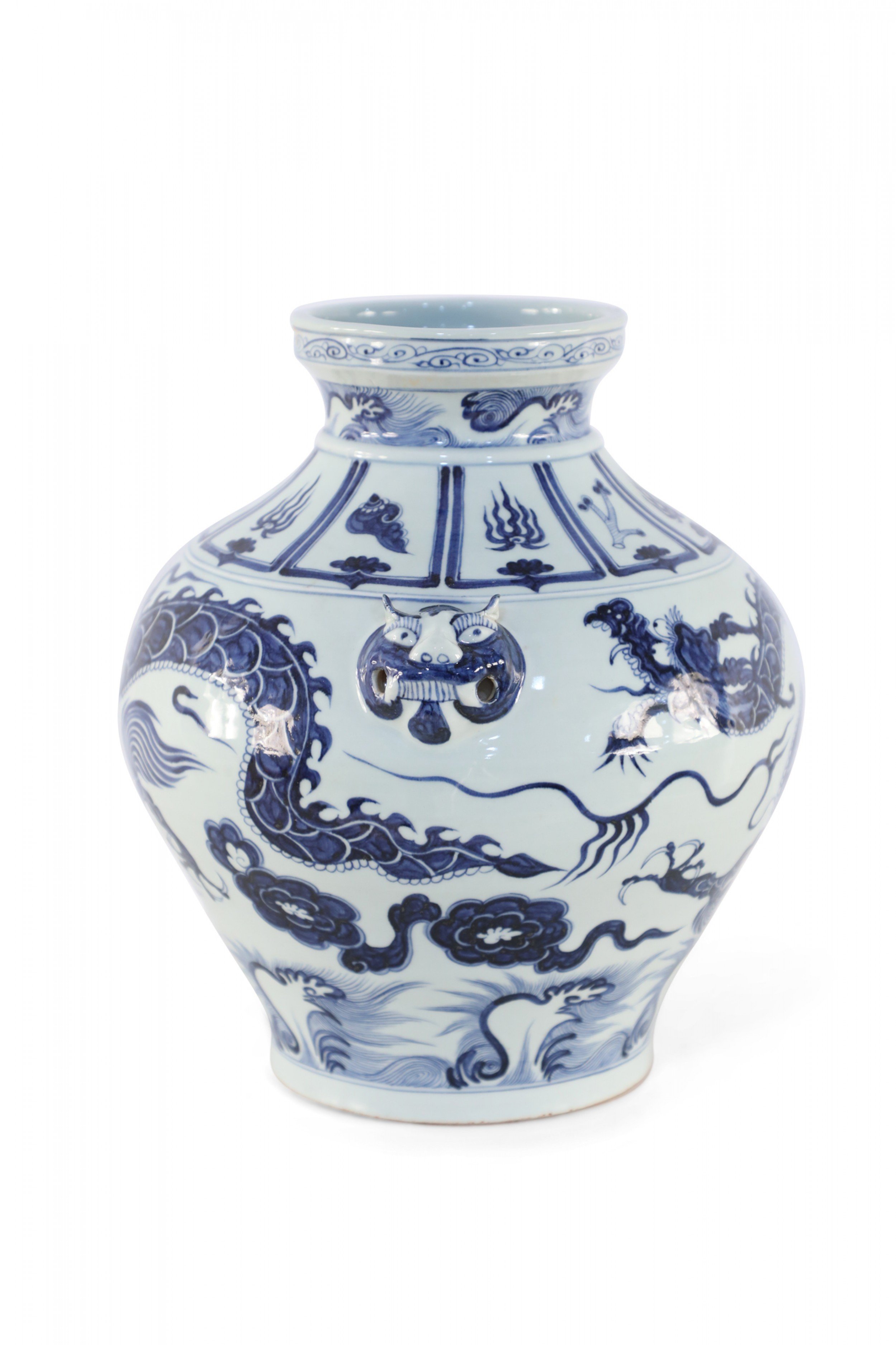 Chinese (late 19th Century) bulbous, white porcelain pot crafted in the Yuan Dynasty style, wrapped in a large scaled blue dragon on the body and decorative symbols around the neck, and accented with foo dog doorknocker ornamentation along the sides.