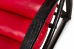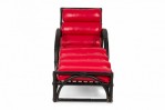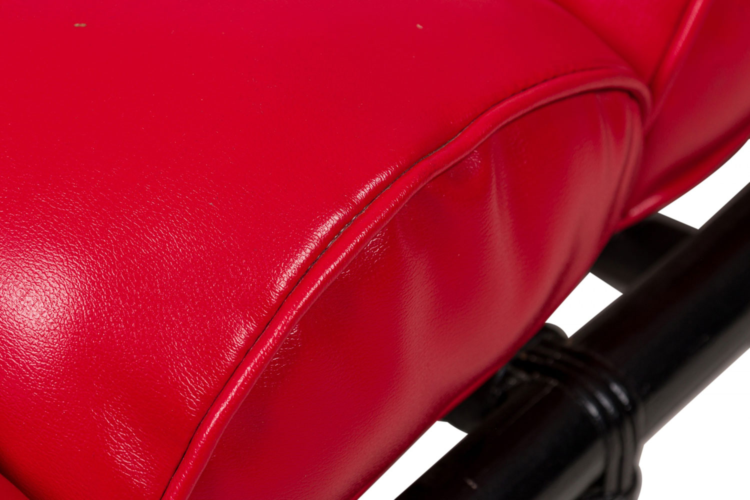 Contemporary chaise lounge with a black painted split reed and rattan frame with arch-shaped arms and a channeled red vinyl upholstered removable cushion..