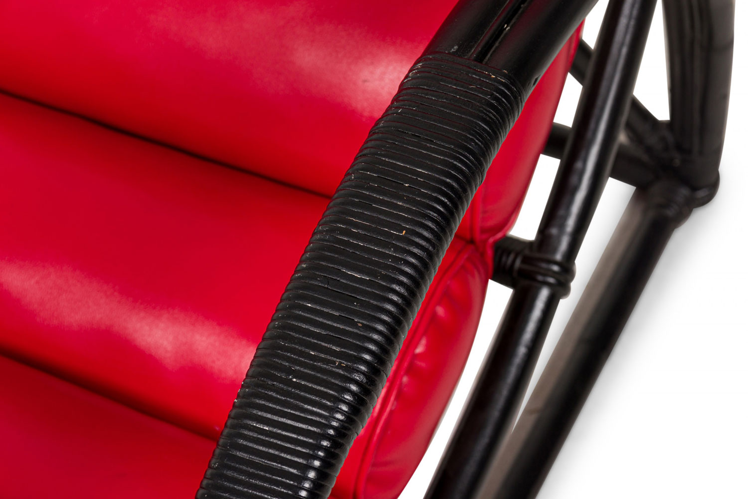 Contemporary Black Painted Split Reed, Rattan, and Channeled Red Vinyl Chaise Lounge