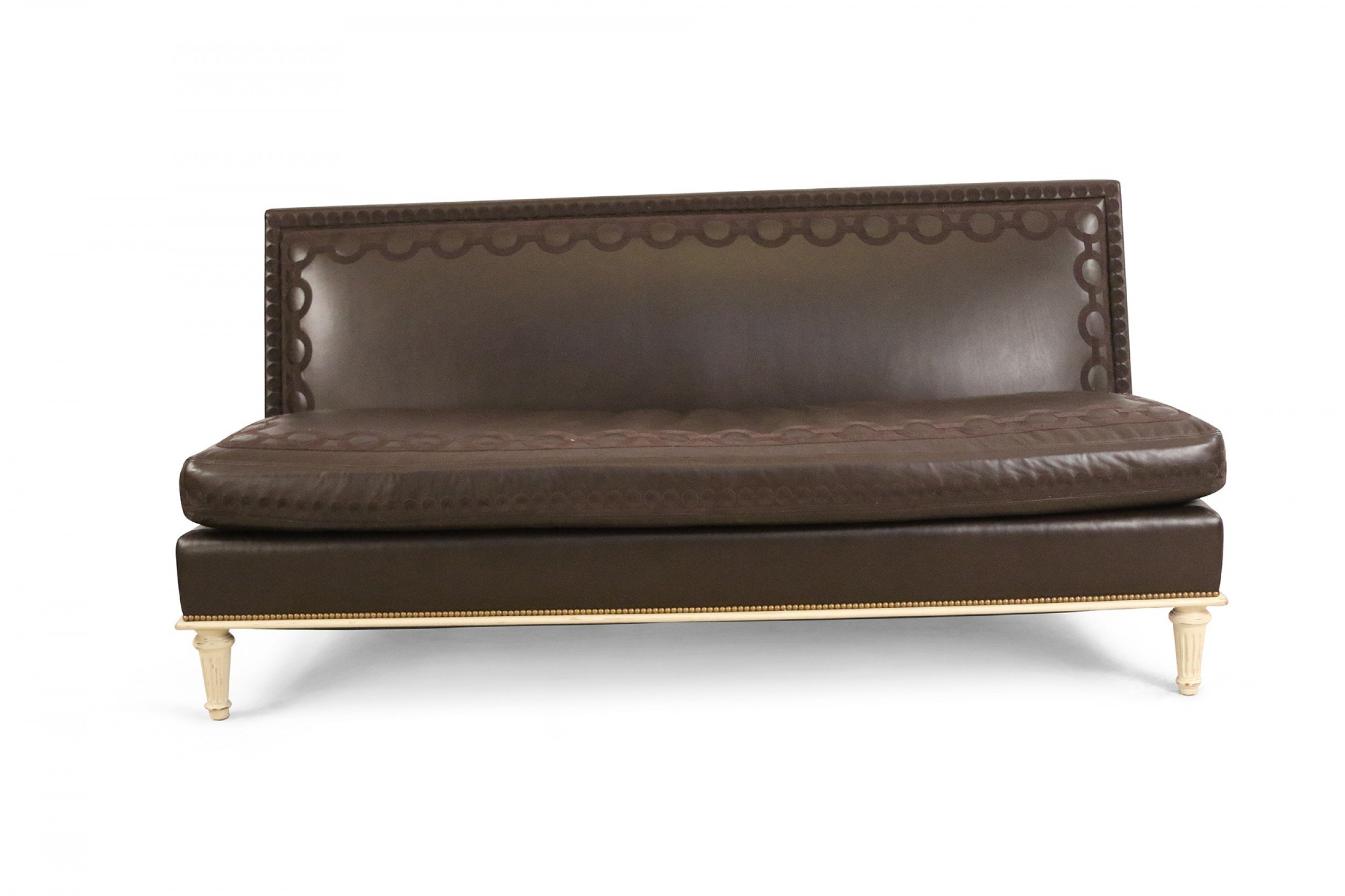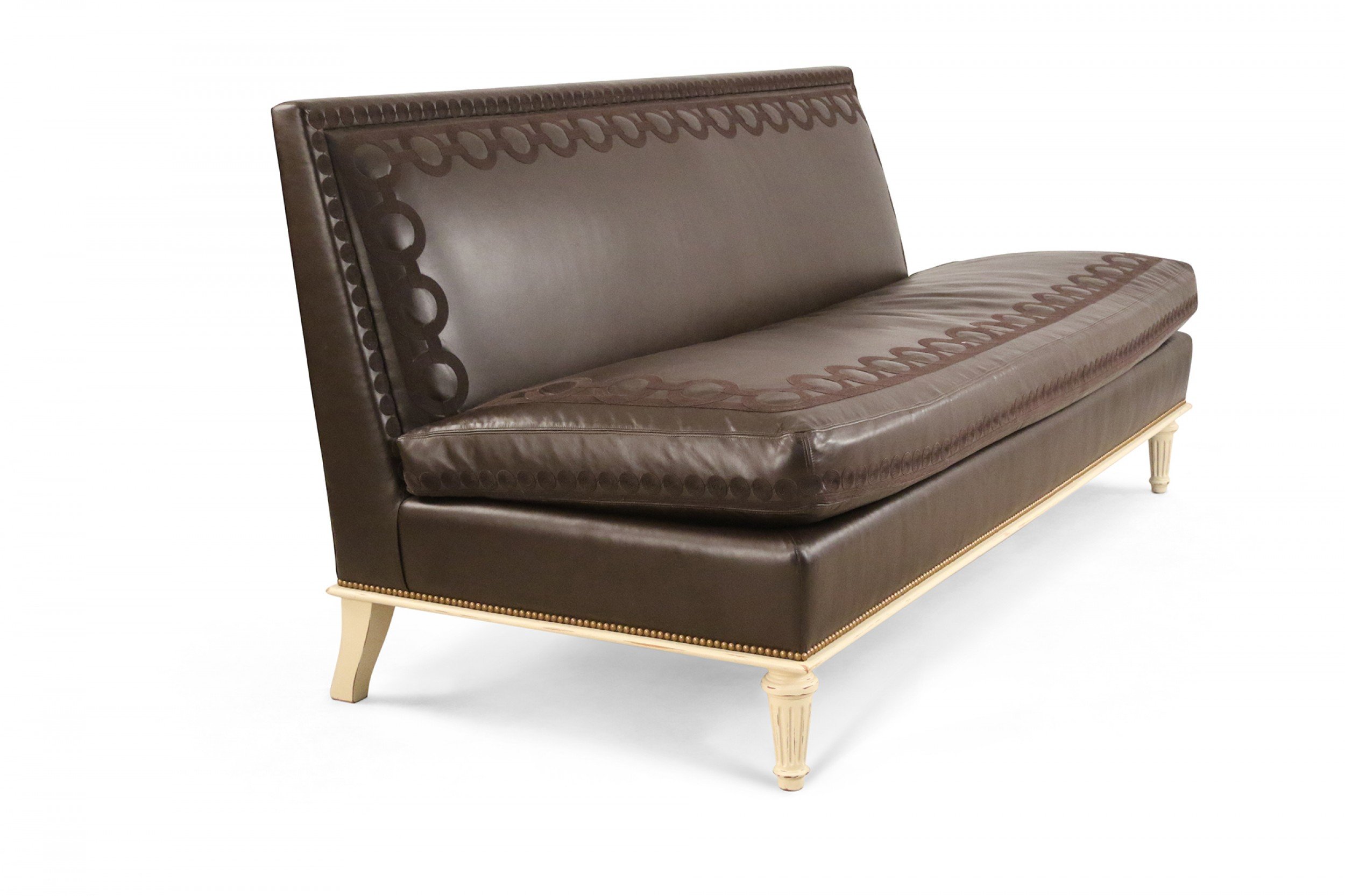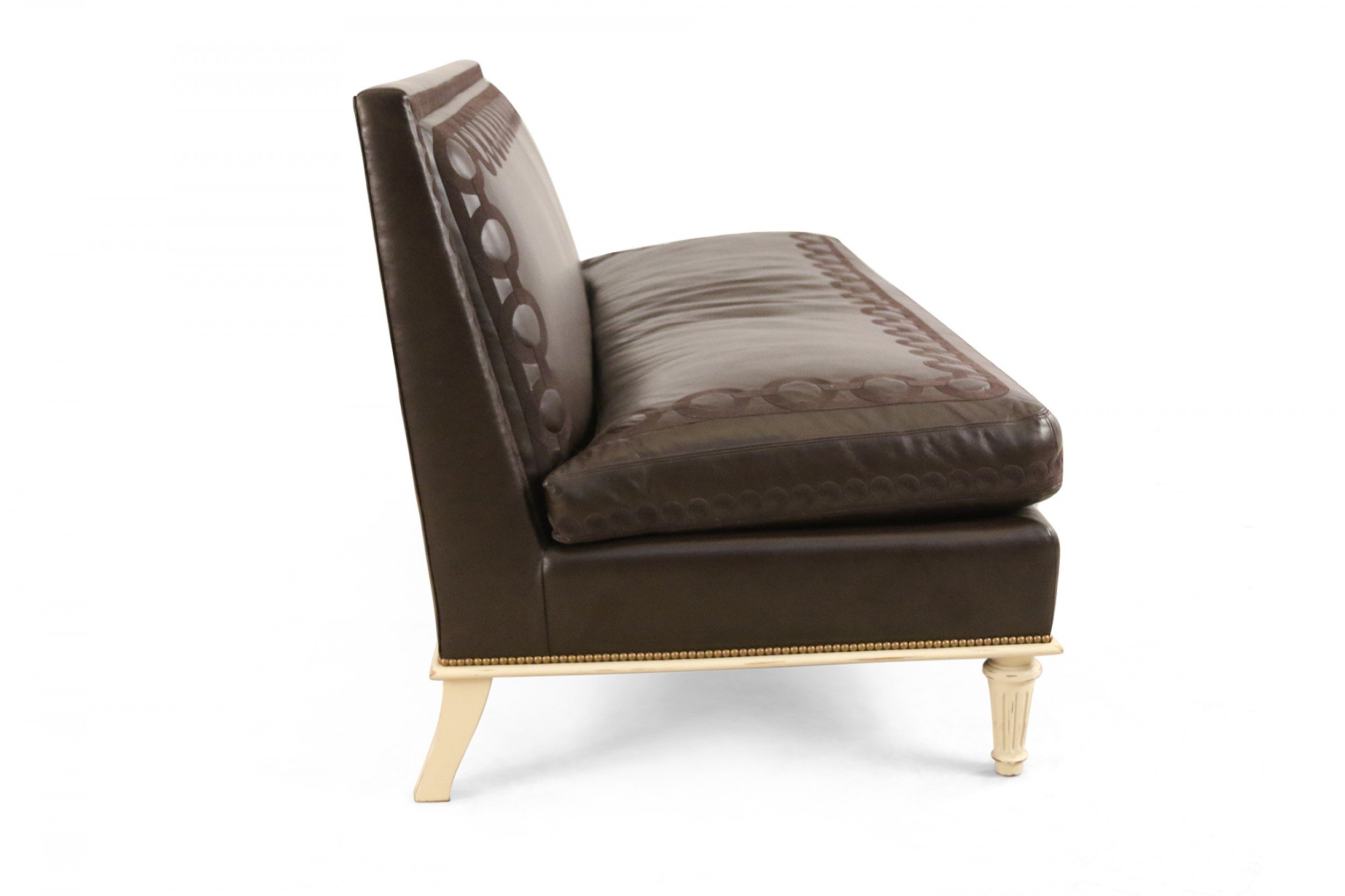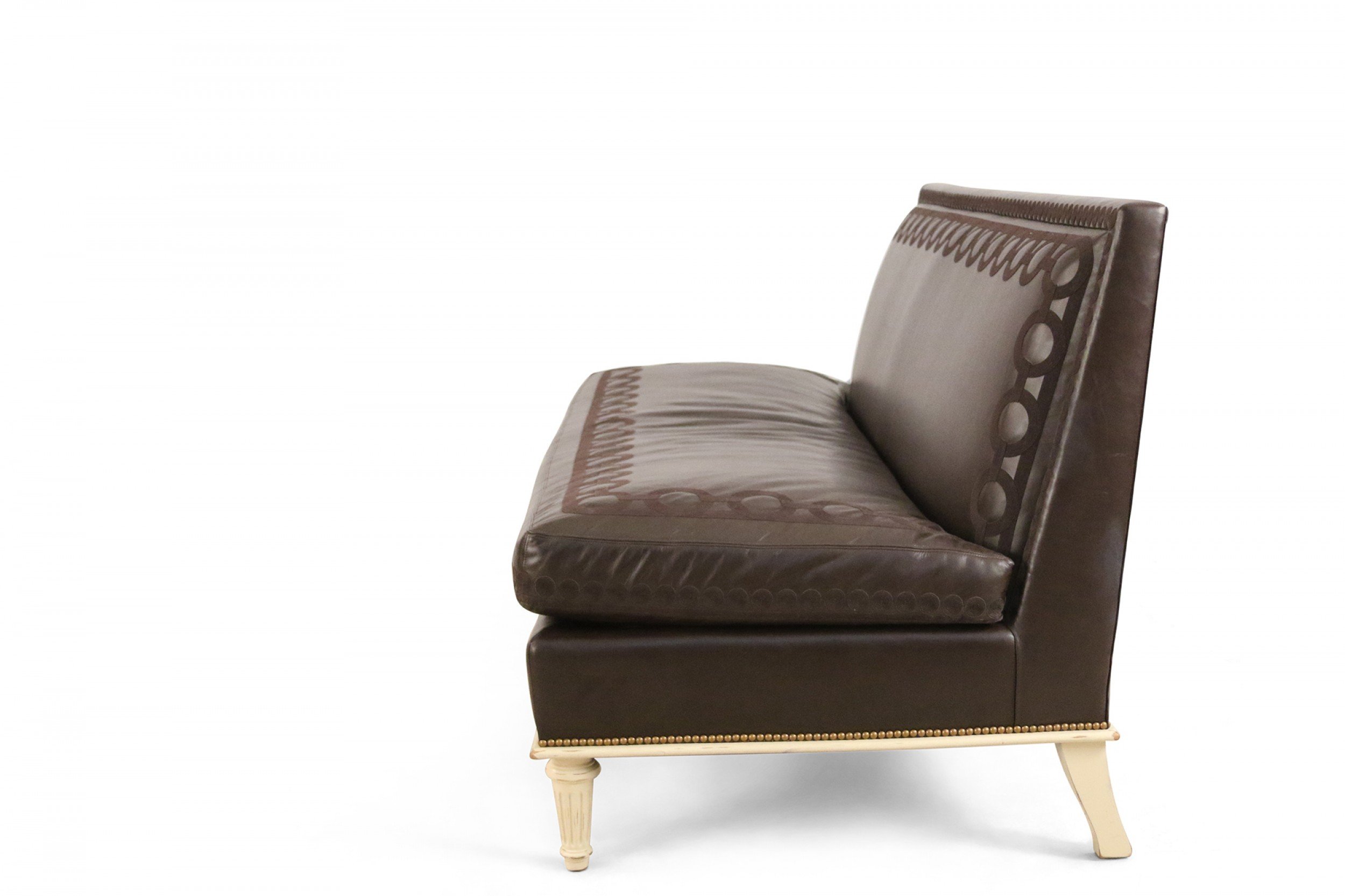 Contemporary brown leather 3-seat sofa with embroidered circular trim along the seat and back and carved white painted wooden legs..