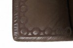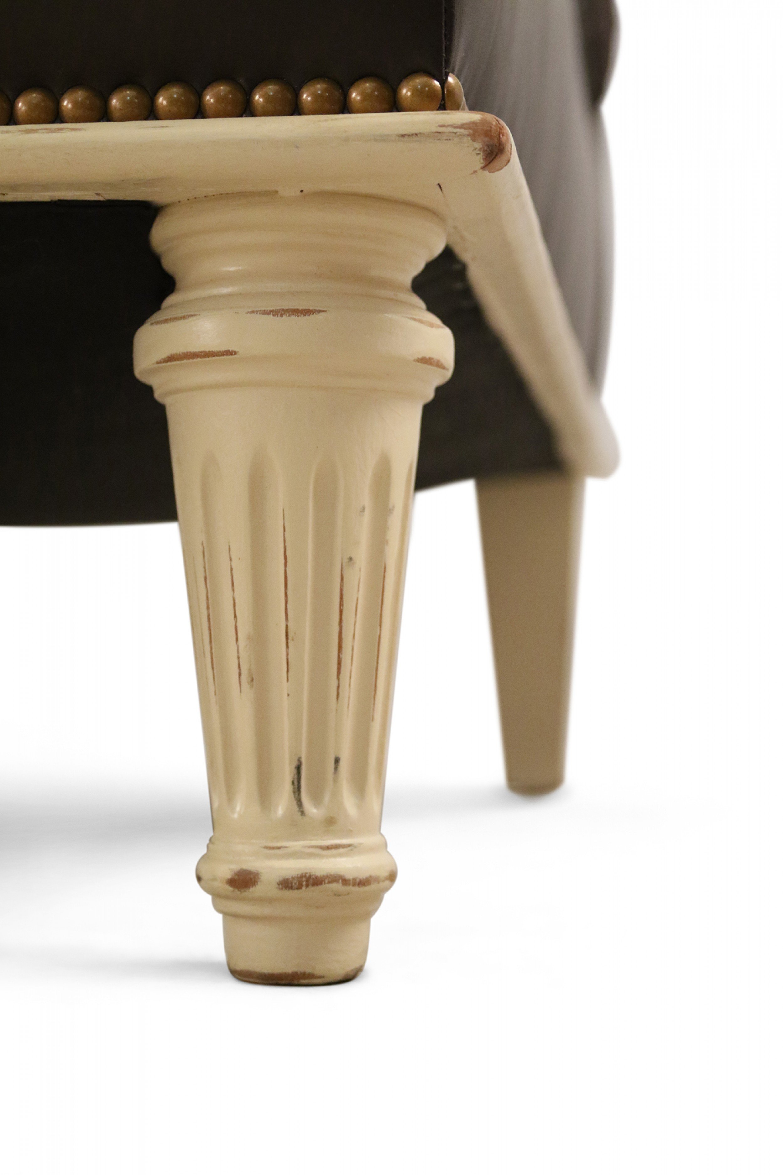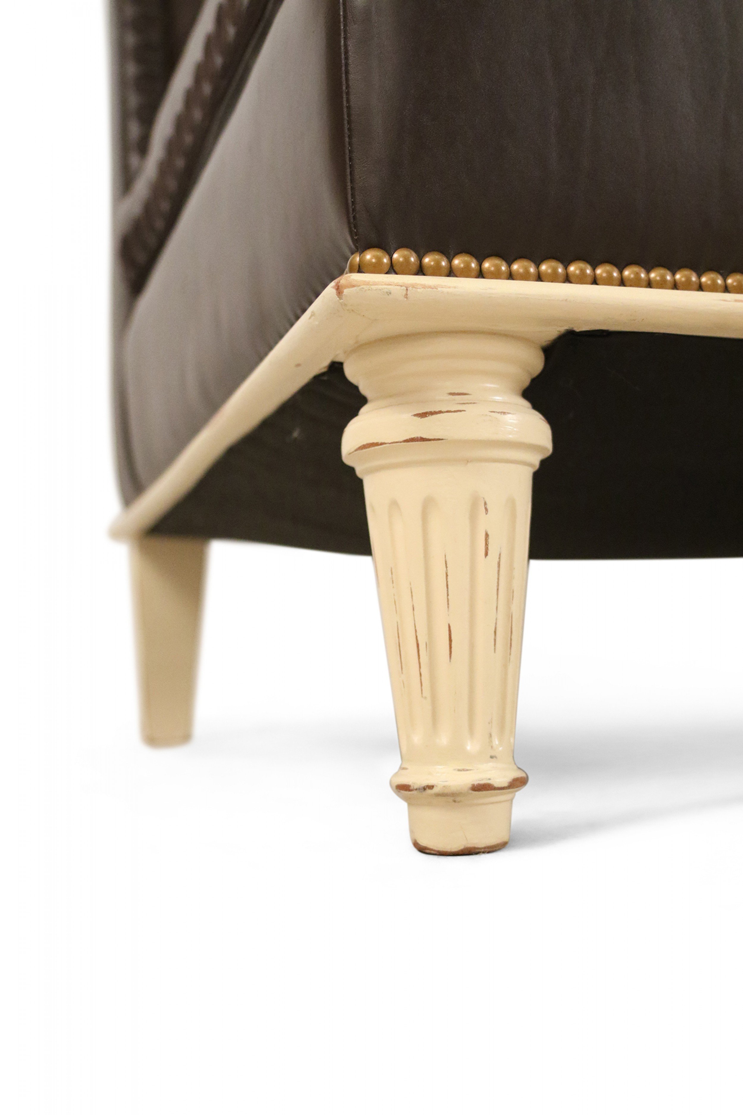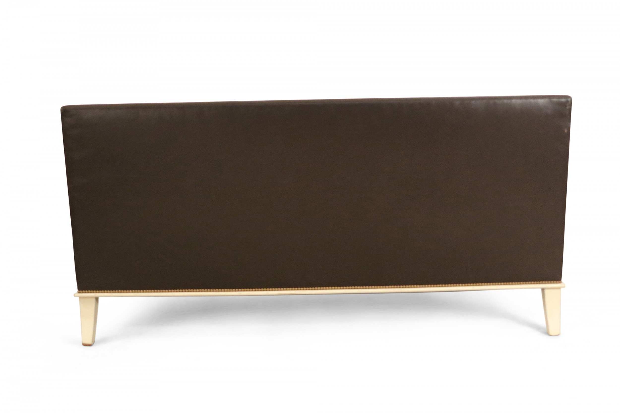Contemporary brown leather 3-seat sofa with embroidered circular trim along the seat and back and carved white painted wooden legs..