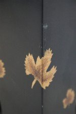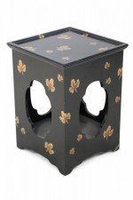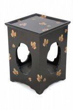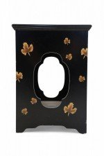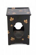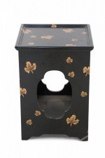 Chinese black lacquer, square side table distinguished by quatrefoil-shaped cutouts on all sides and a gold maple leaf motif throughout