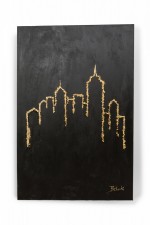 Contemporary abstract painting featuring the New York City skyline created with gold leaf against a black acrylic painted background on rectangular canvas. ("Golden New York," BARBARA KISKOVSKI).