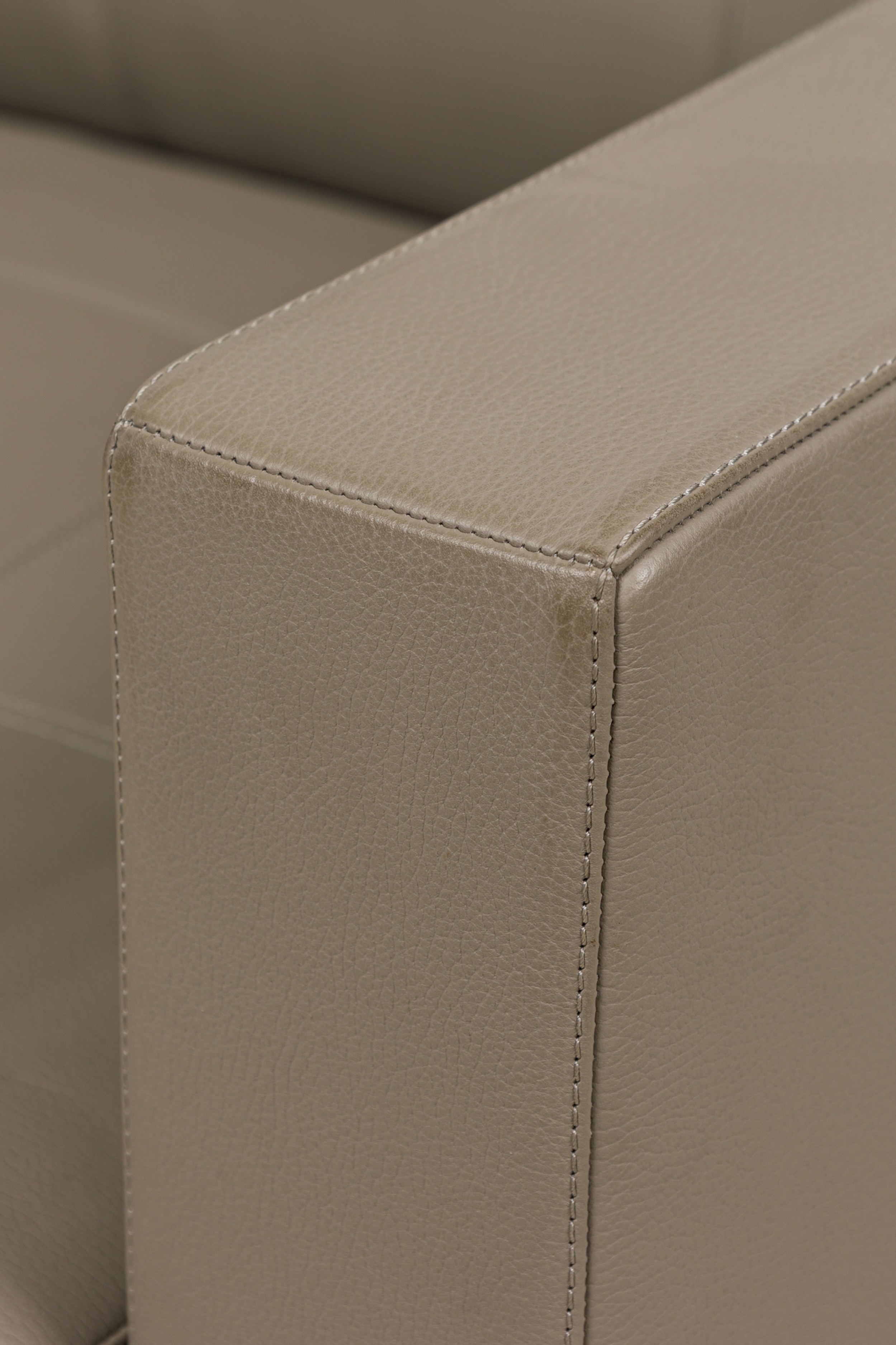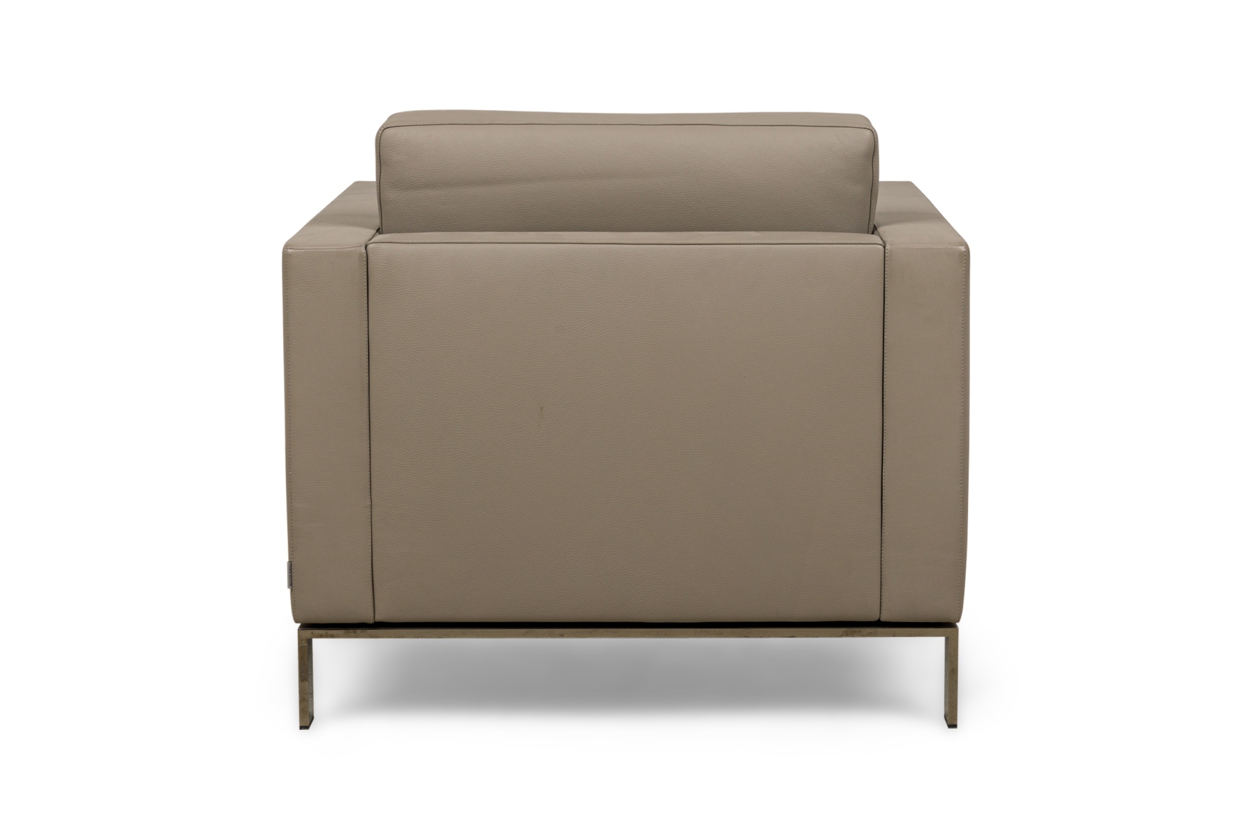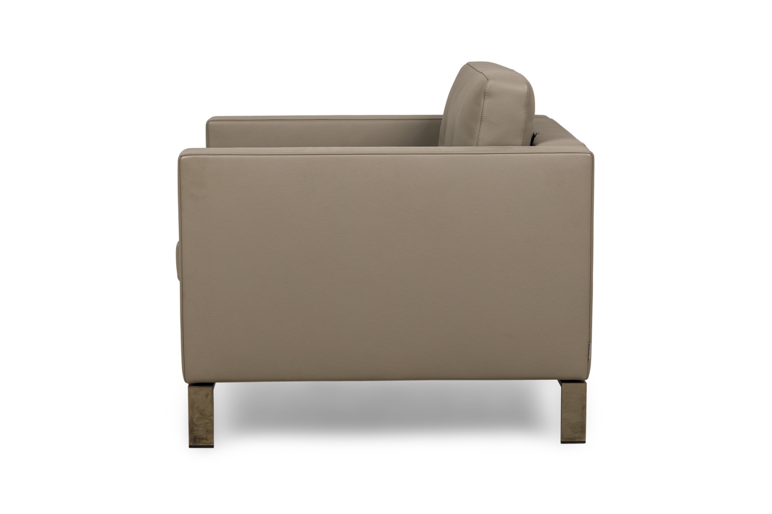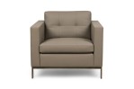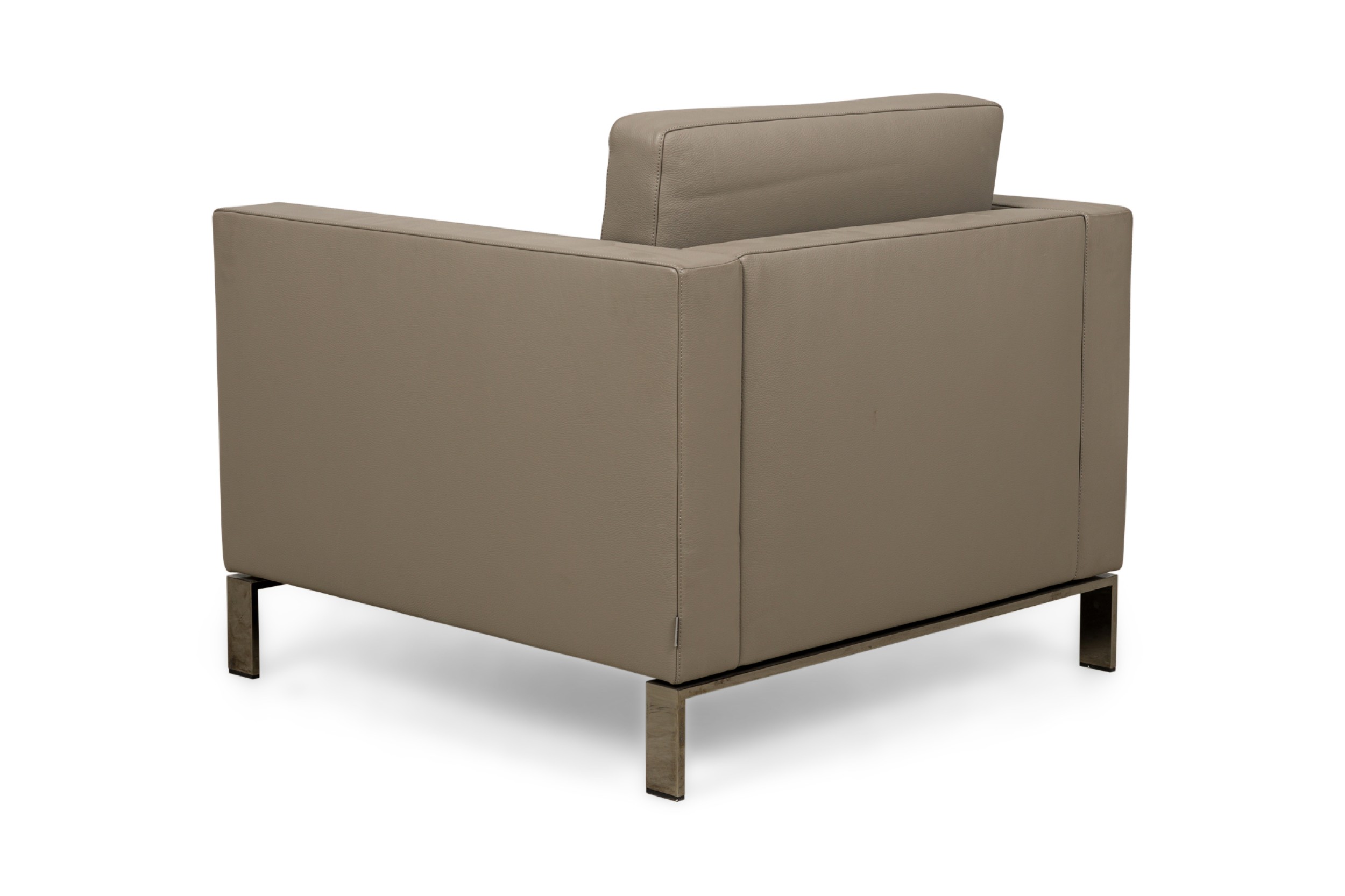 Contemporary "Foster" square back lounge /arm chair with tufted stone gray leather upholstery and silver metal legs (Similar chair without tufting: MTL009A).