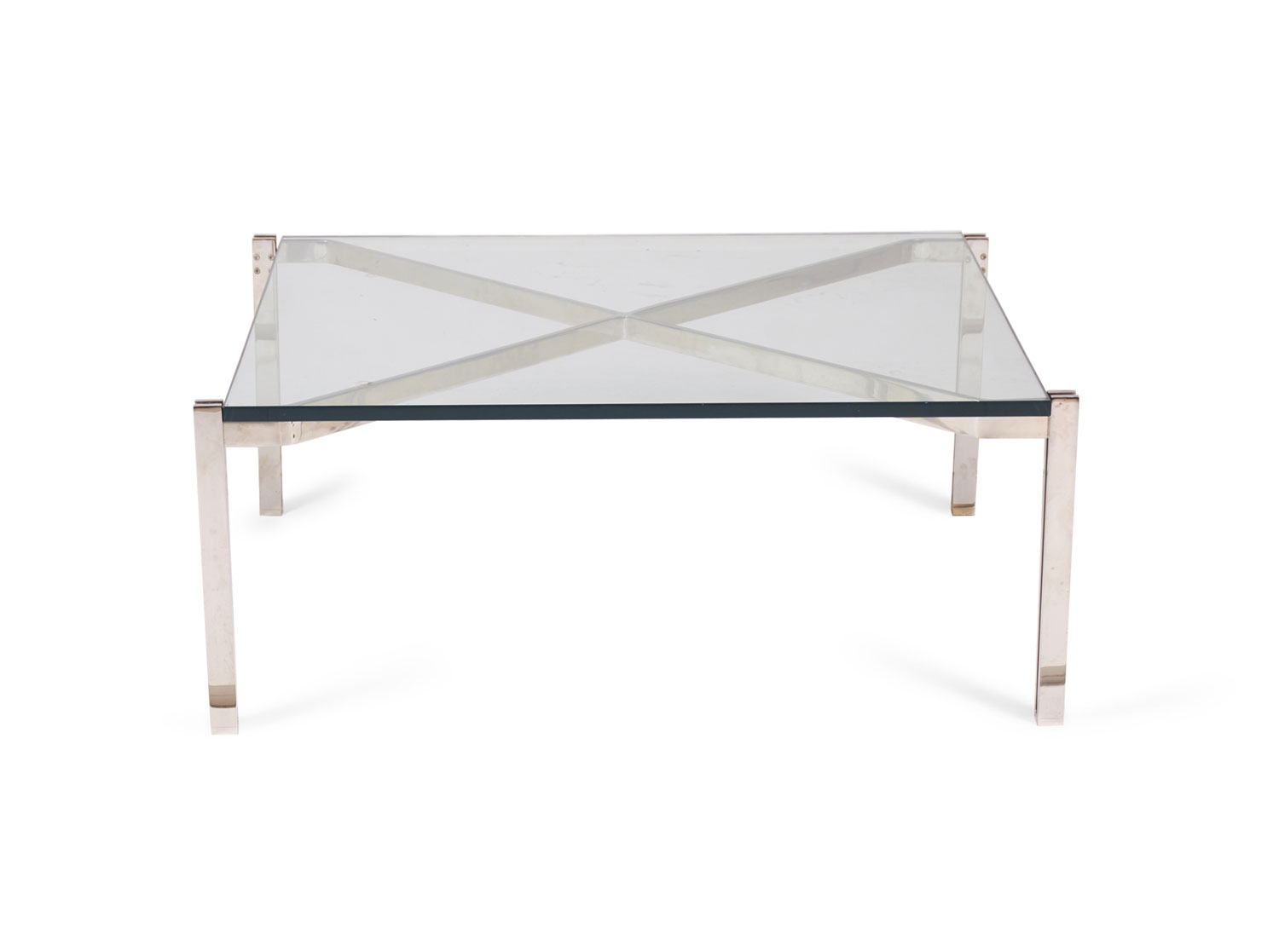Contemporary Italian Modernist Style coffee table with a stainless steel X-shaped base supporting an inset clear glass table top. (manner of B&B Italia or Cappelli).