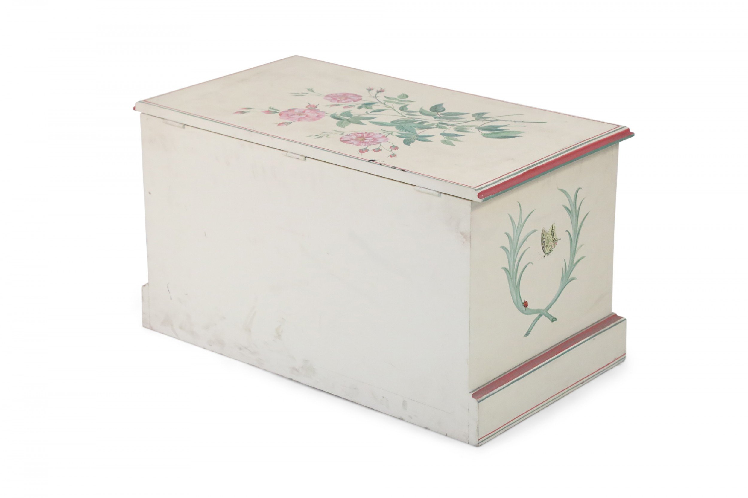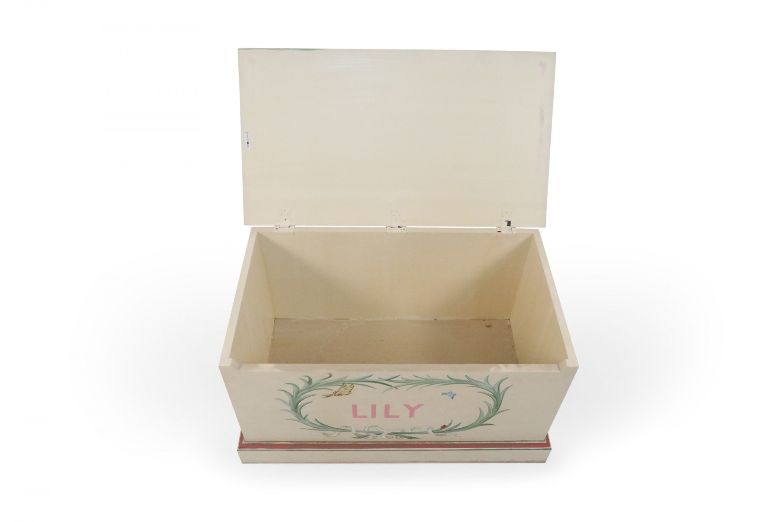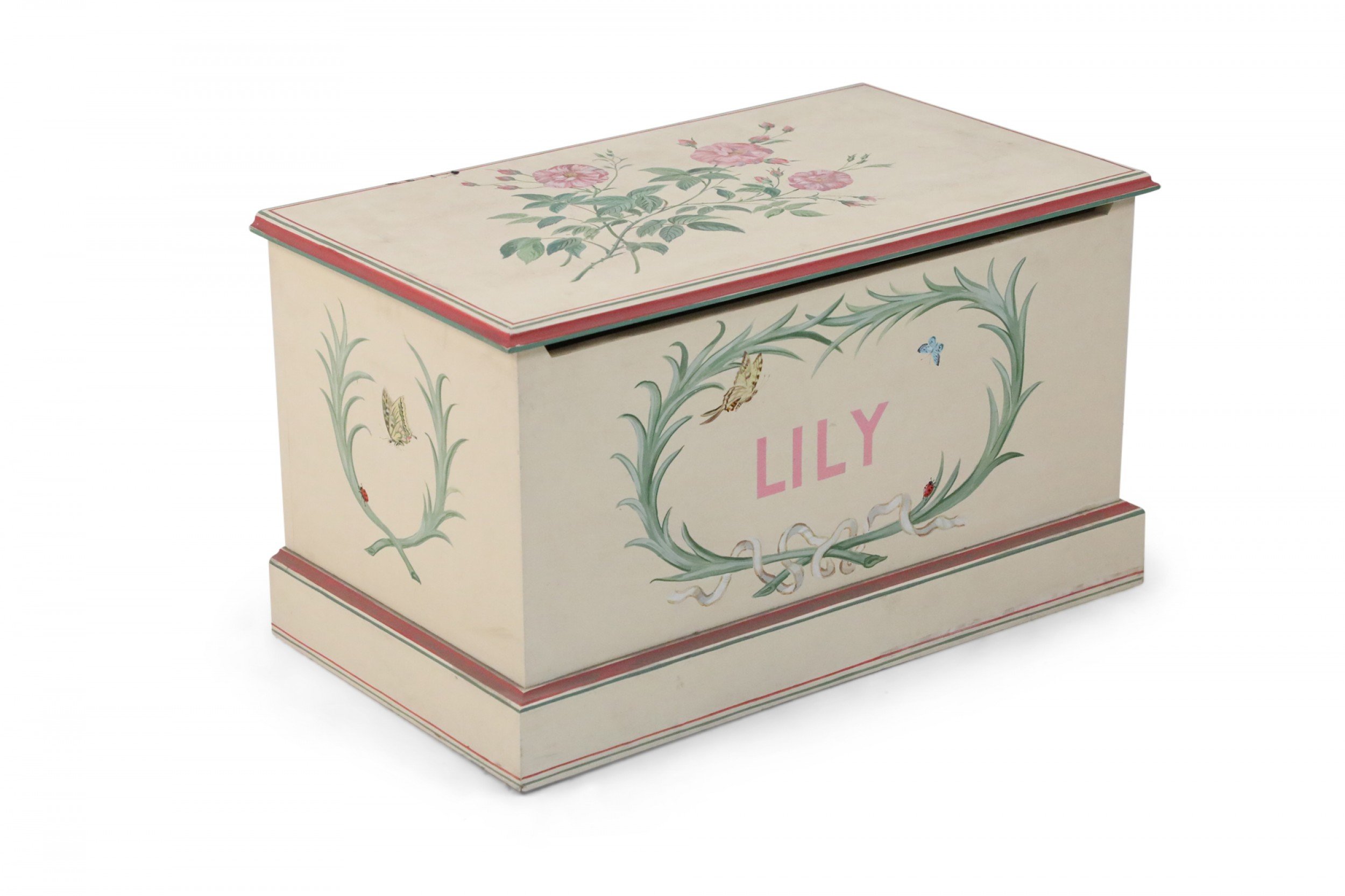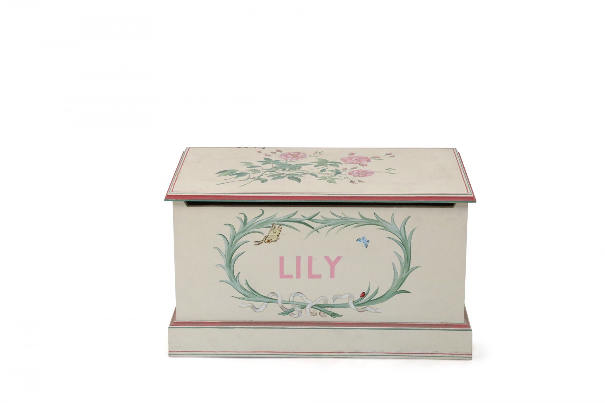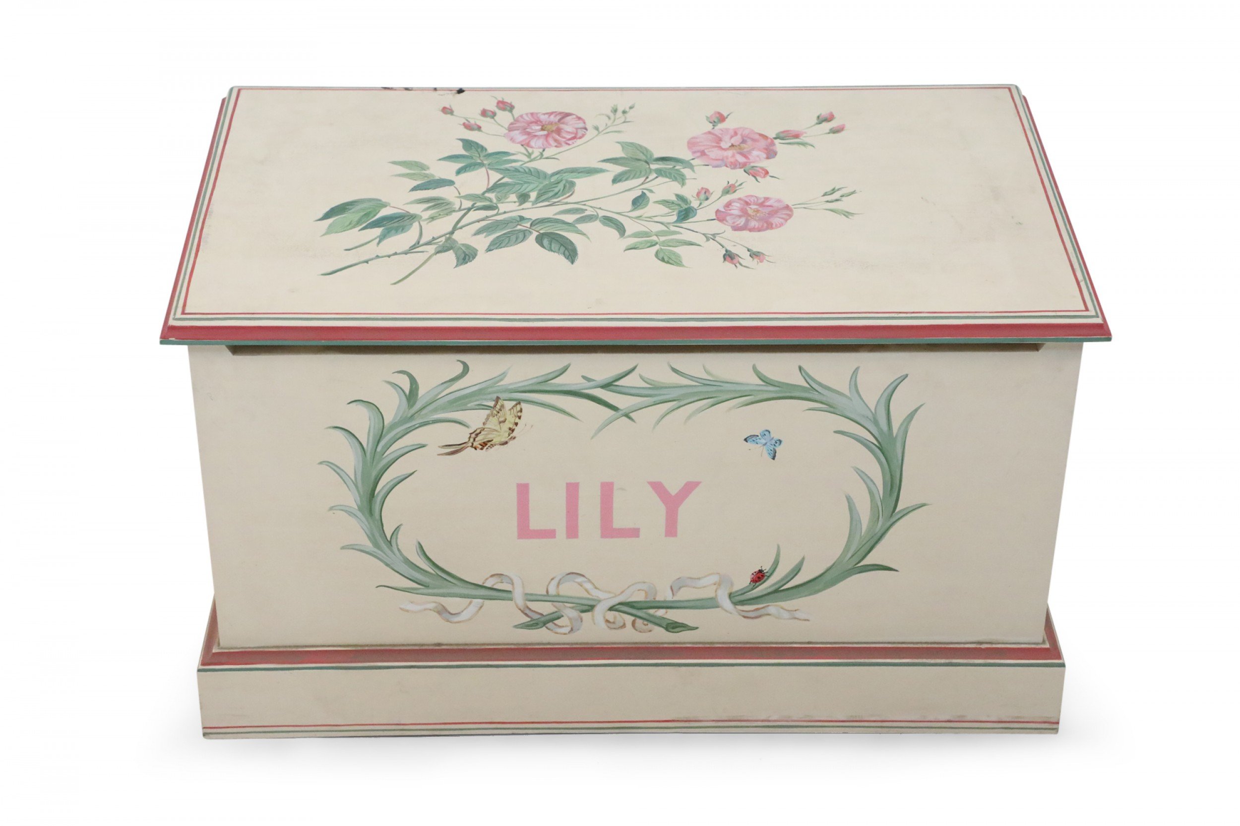 Contemporary American Country style beige painted wooden floor trunk painted with red and green trim, and decorations of florals, laurels, butterflies and ladybugs on the top, front and sides, along with the name "Lily"" on the front..