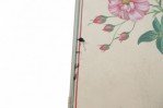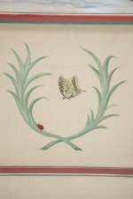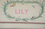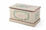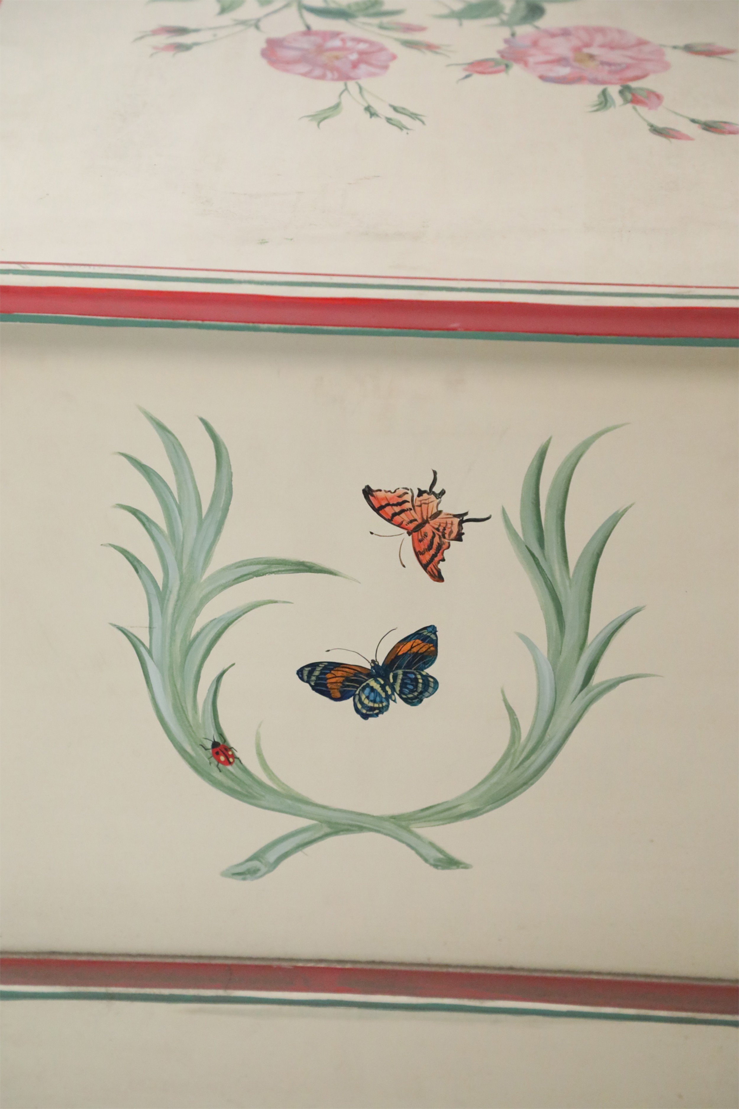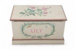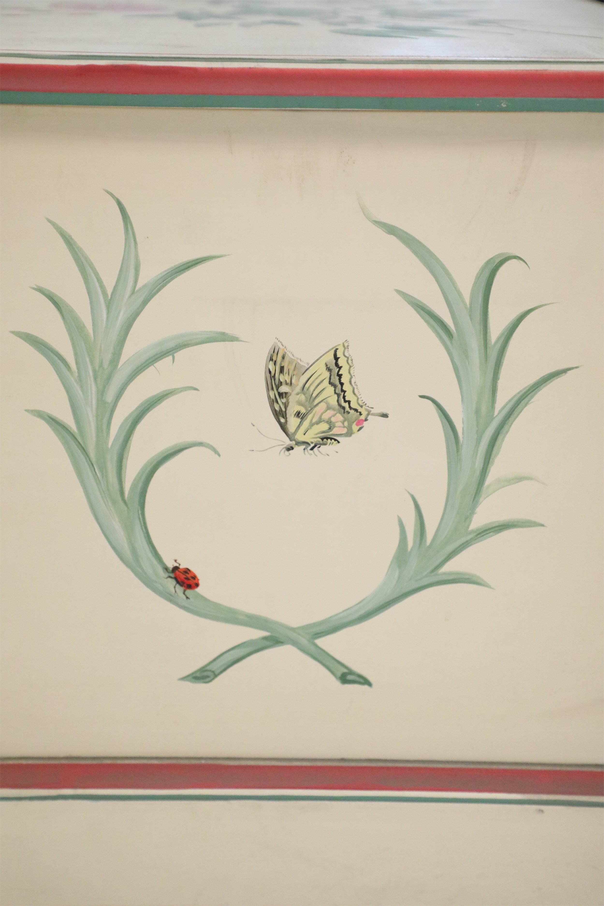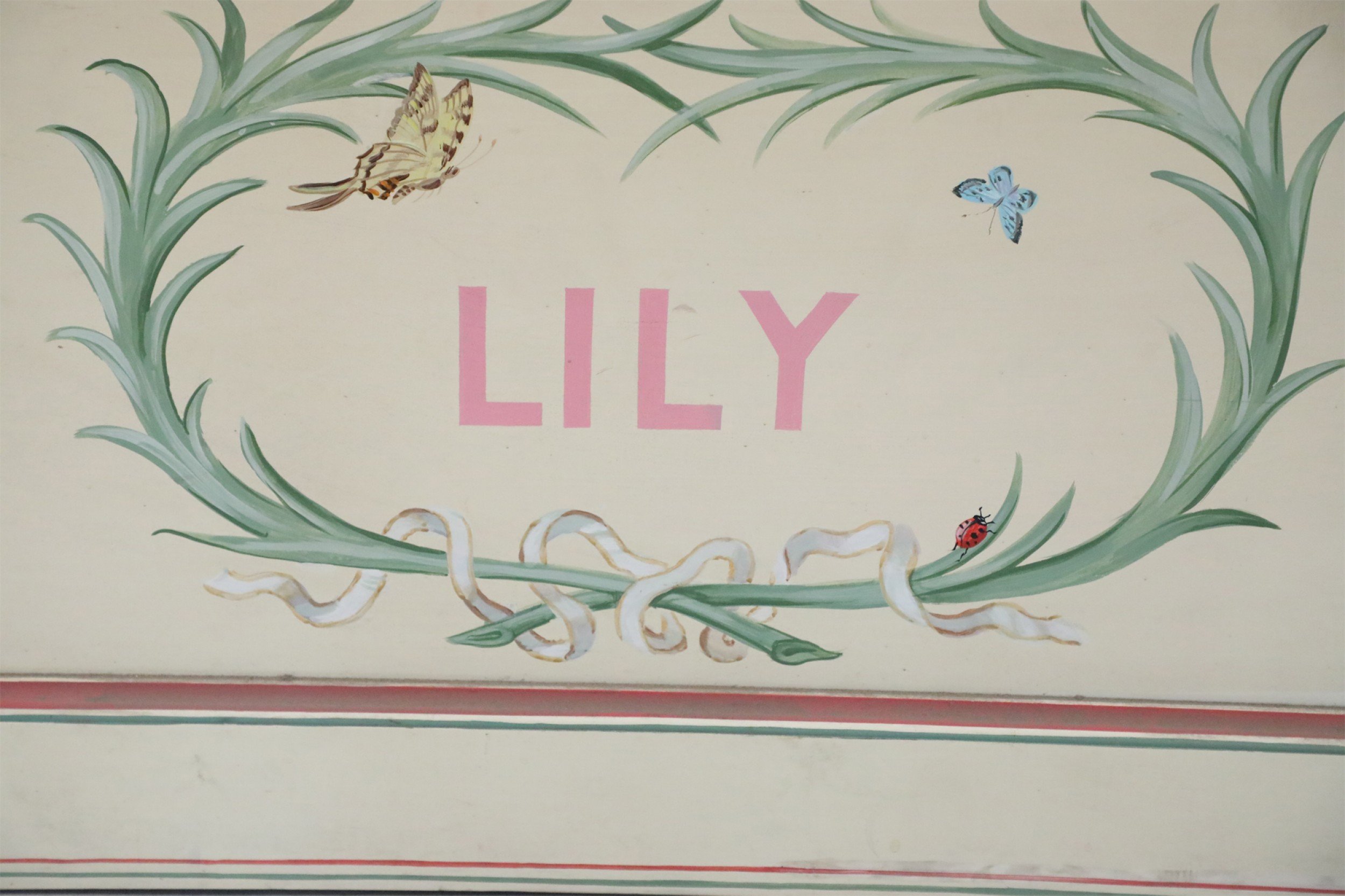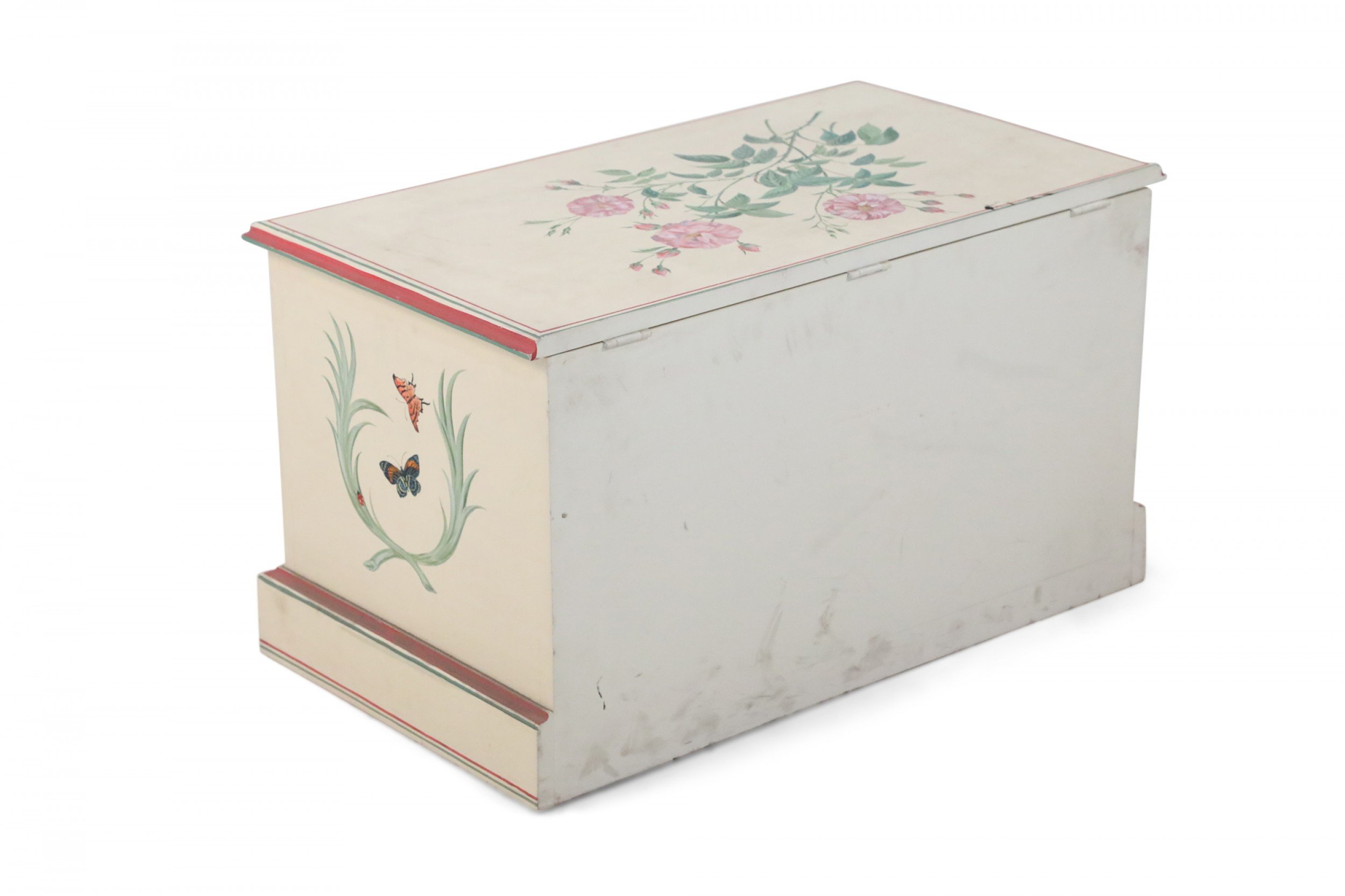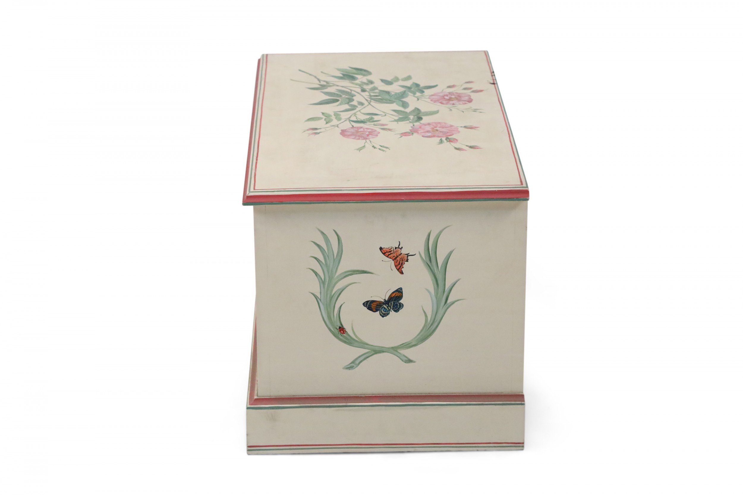 Contemporary American Country style beige painted wooden floor trunk painted with red and green trim, and decorations of florals, laurels, butterflies and ladybugs on the top, front and sides, along with the name "Lily"" on the front..