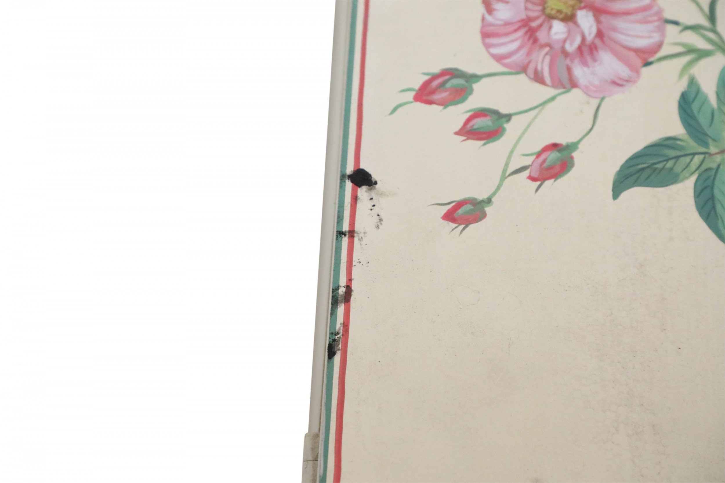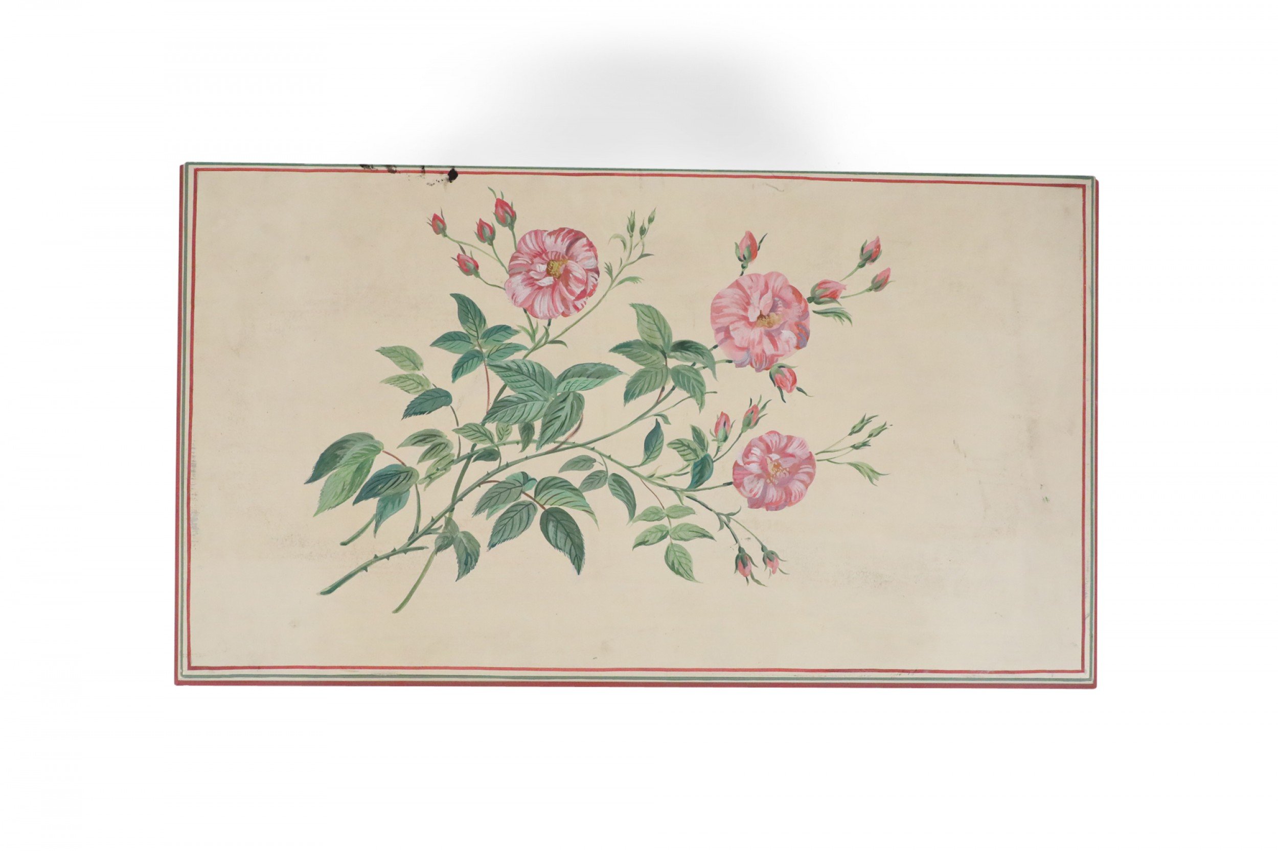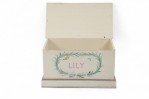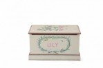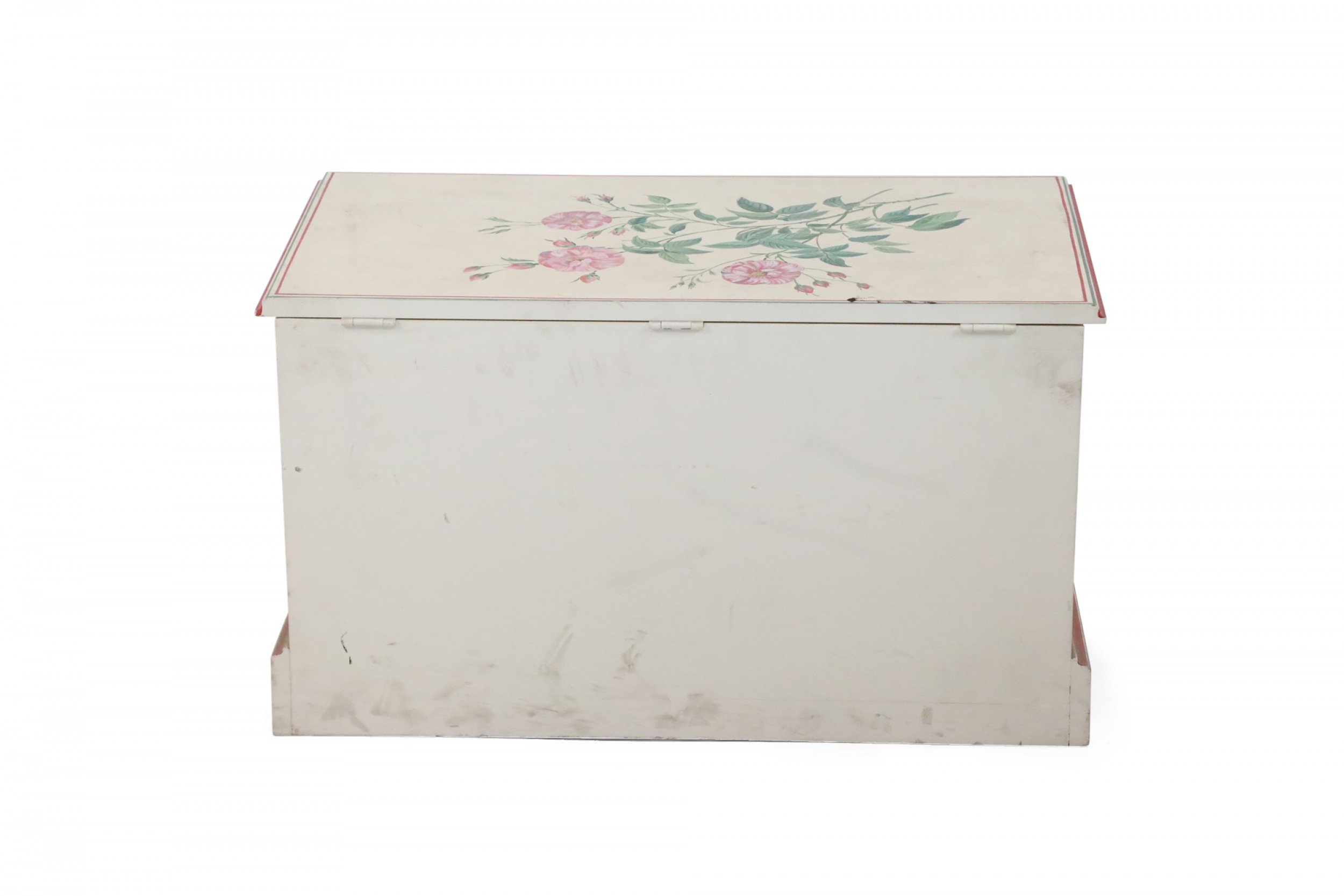 Contemporary American Country style beige painted wooden floor trunk painted with red and green trim, and decorations of florals, laurels, butterflies and ladybugs on the top, front and sides, along with the name "Lily"" on the front.