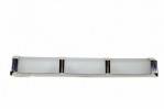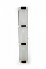 Contemporary trapezoidal wall sconce with three sections made of frosted glass separated by silver metal bands.