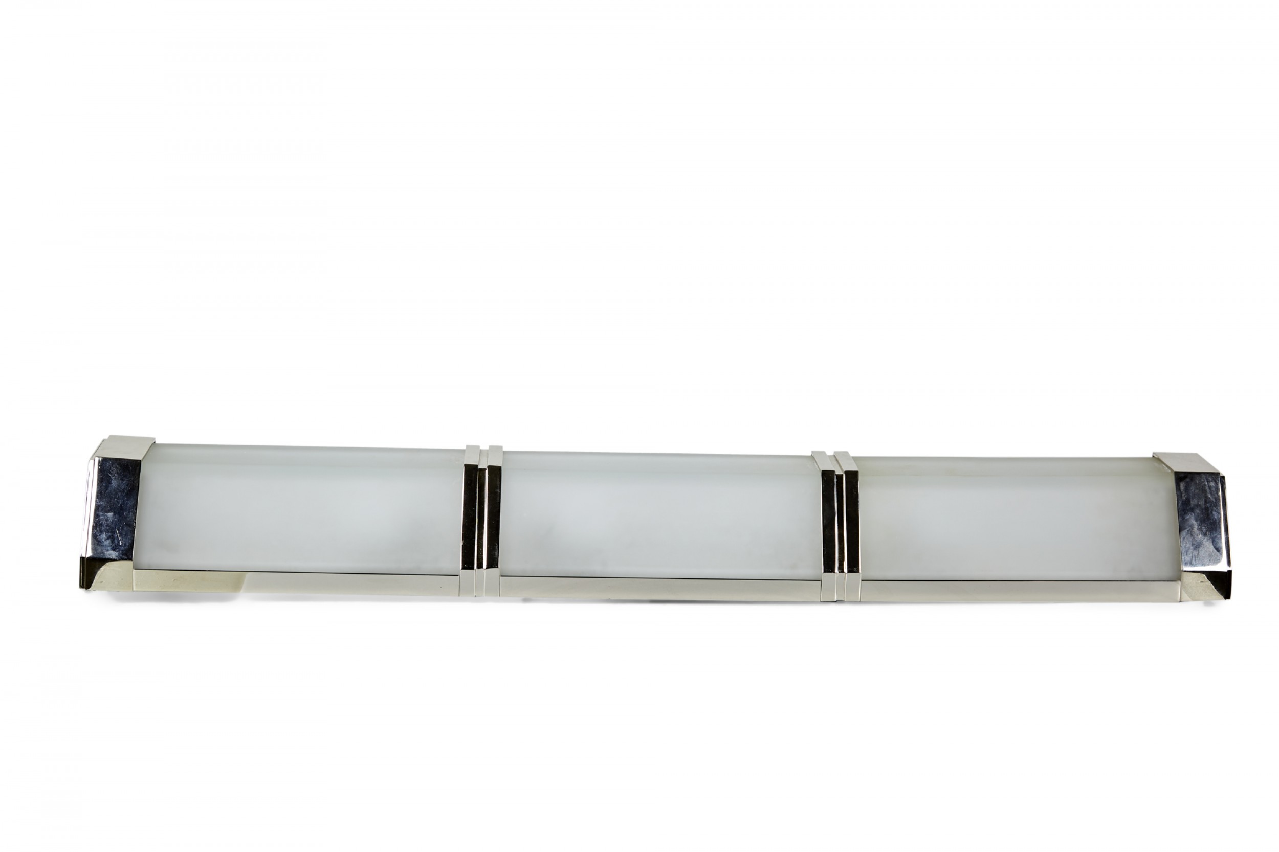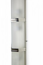 Contemporary trapezoidal wall sconce with three sections made of frosted glass separated by silver metal bands..
