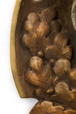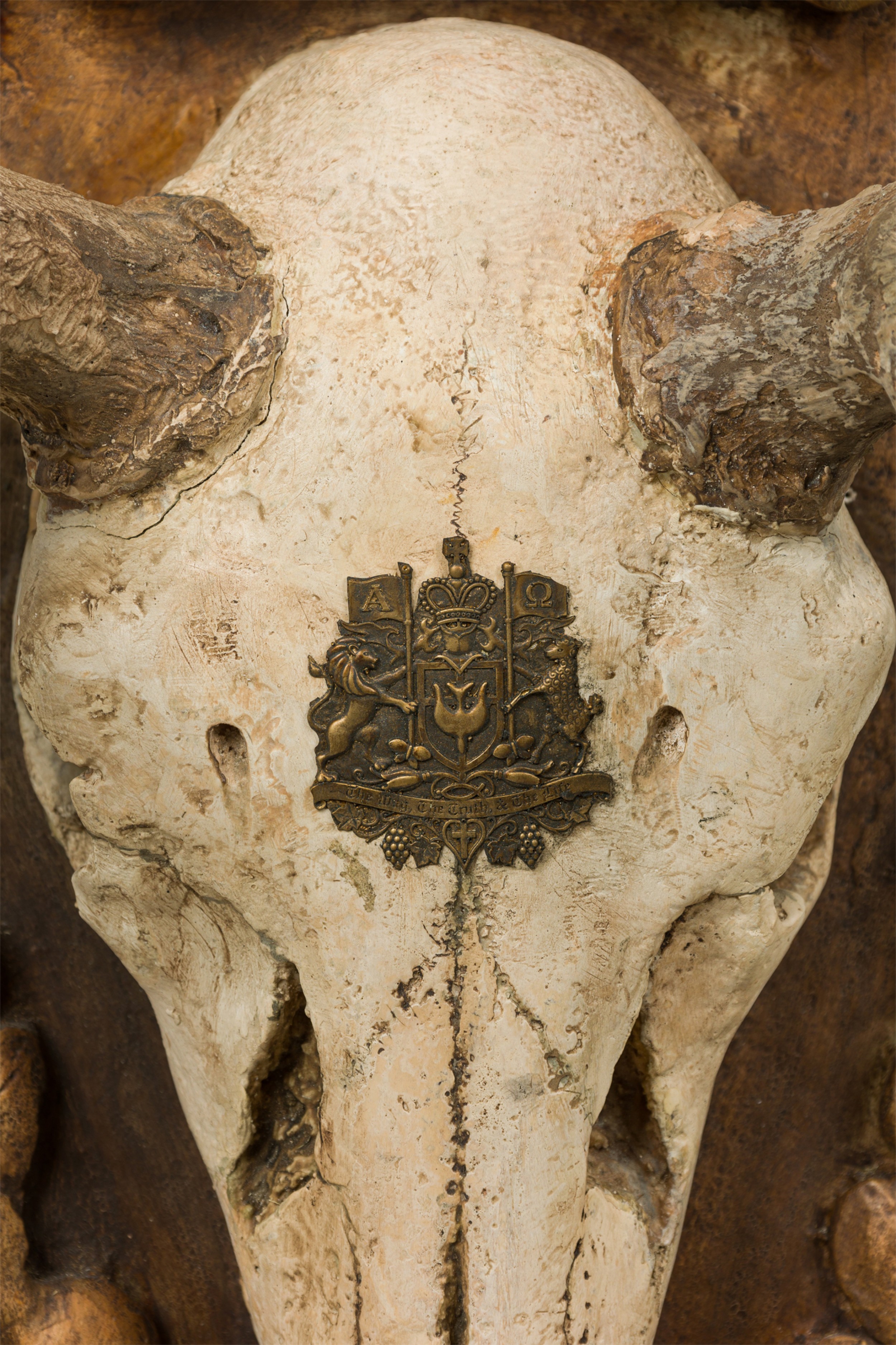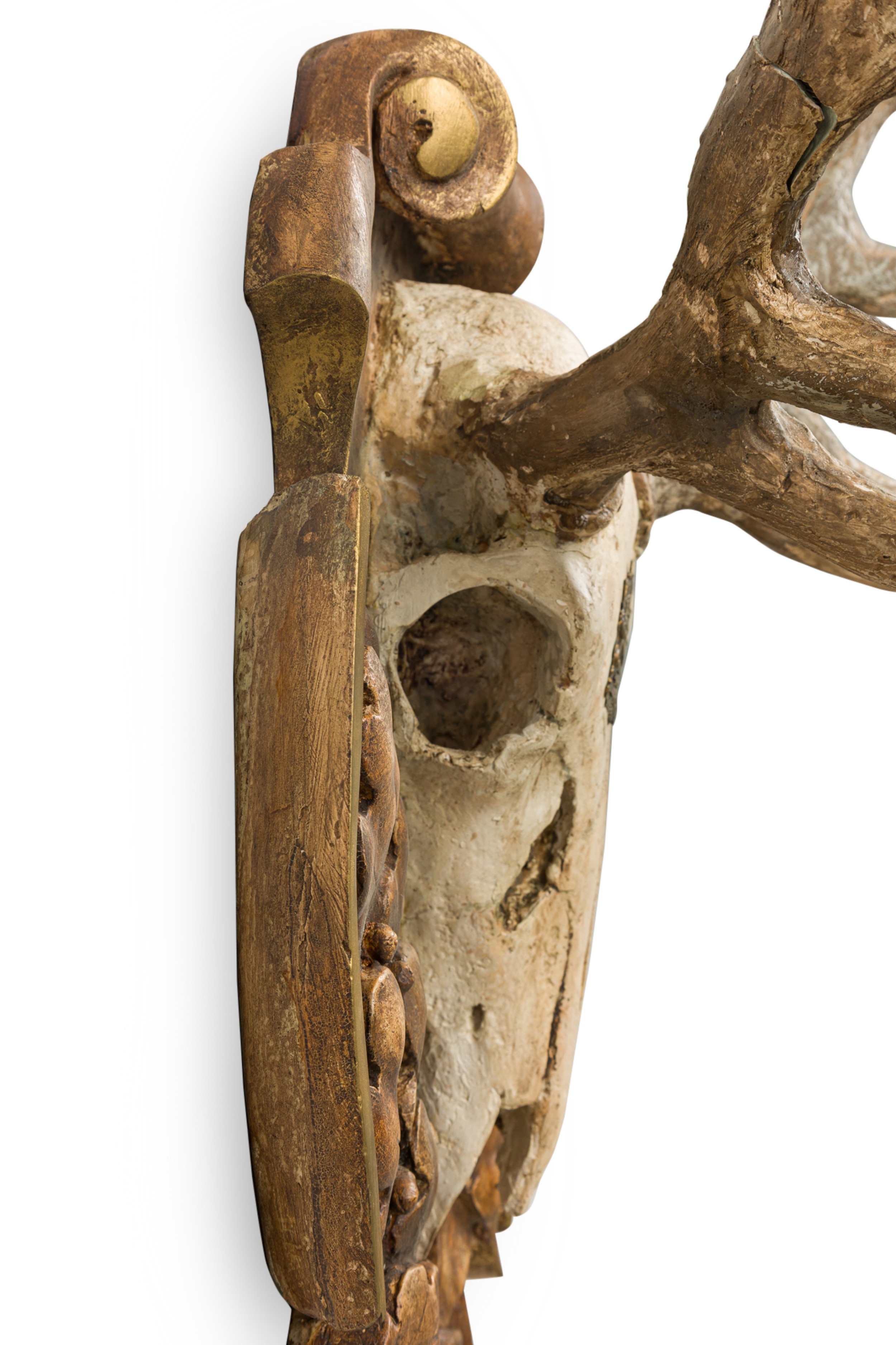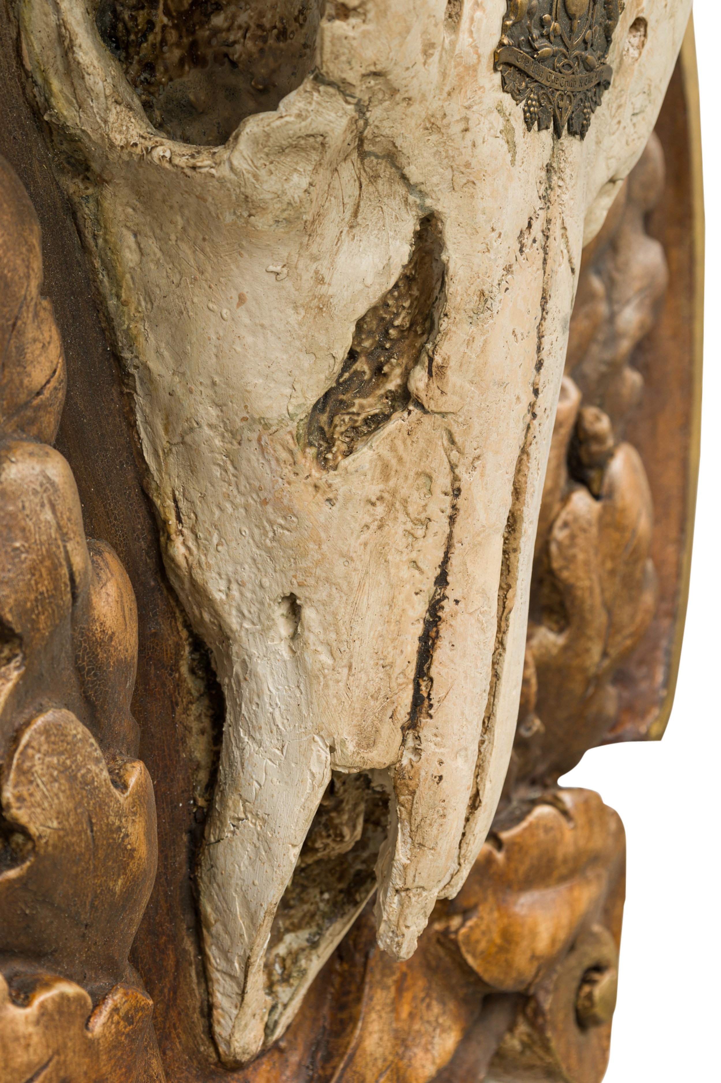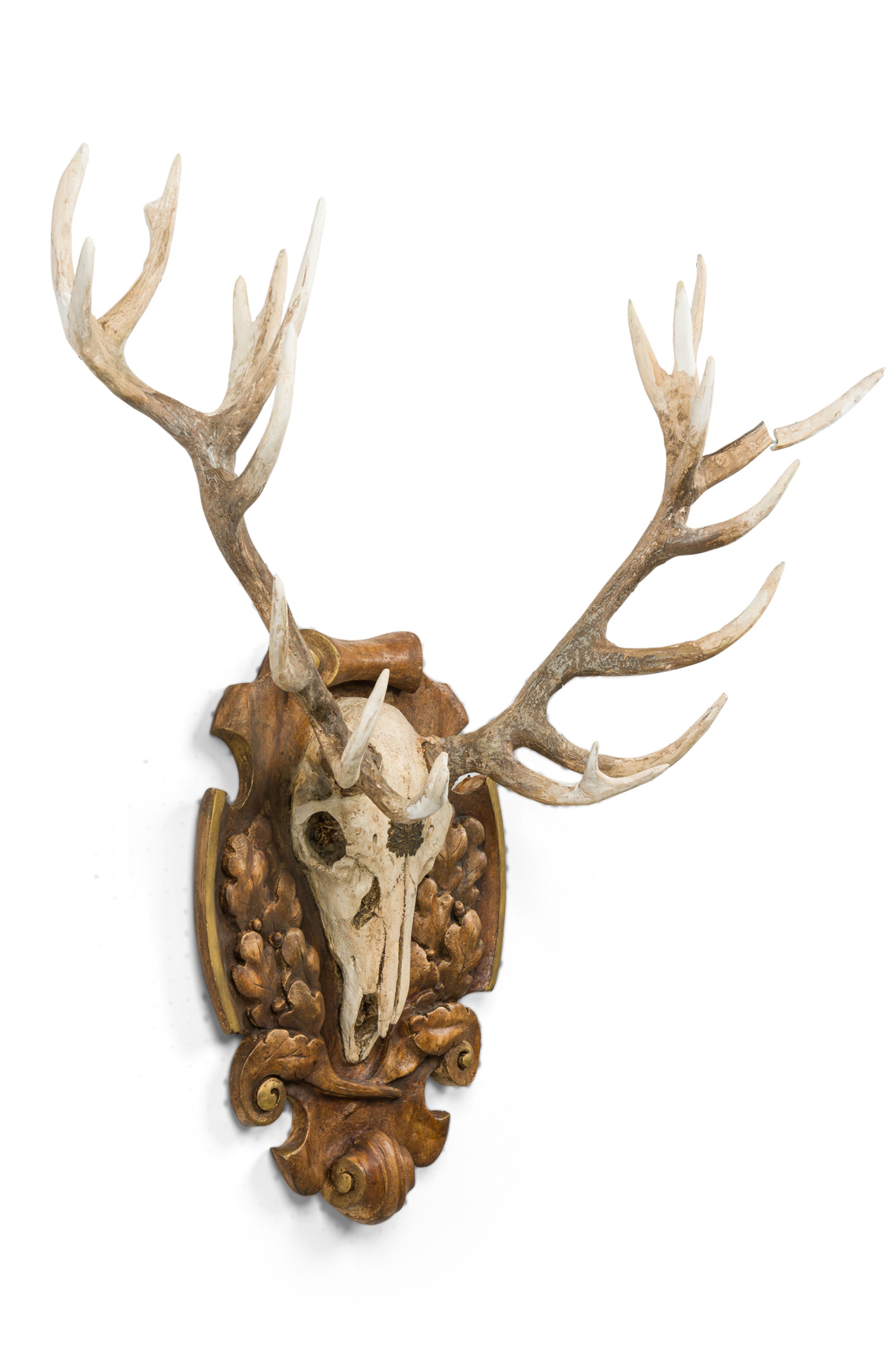 Continental Rustic Elk skull with a painted Insignia mounted on a shaped wall plaque featuring an oak leaf floral design with a scroll pediment and bottom