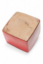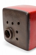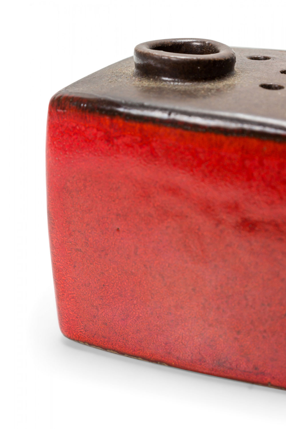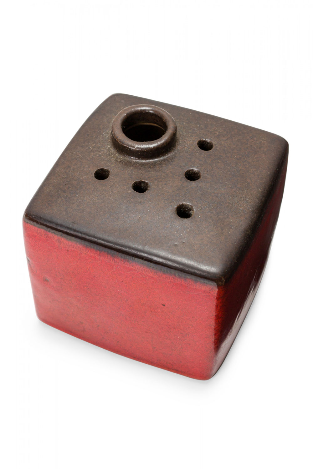 West German Mid-Century square form ceramic vase with red glazed sides and a brown glazed top with an offset larger opening flanked on two sides by 5 smaller openings. (DÜMLER & BREIDEN)