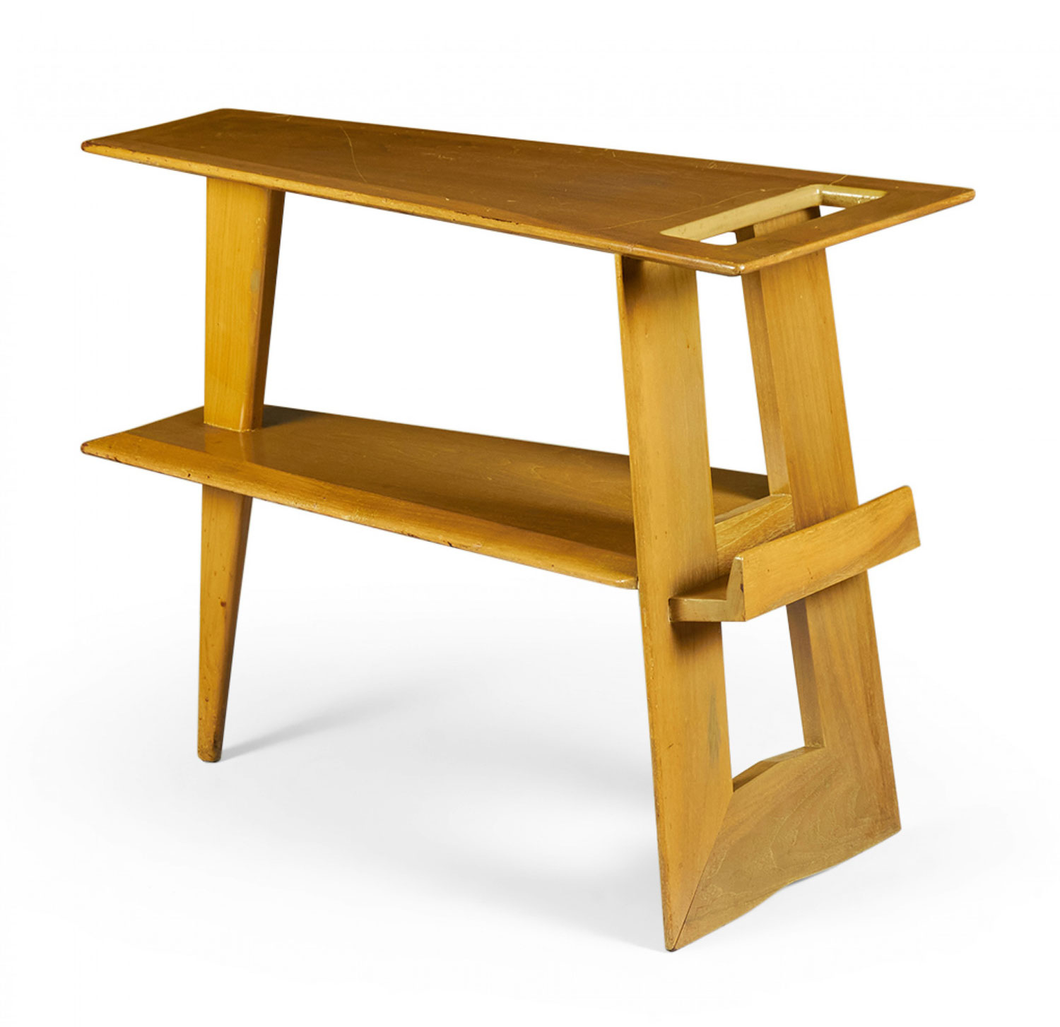 Danish Mid-Century blond mahogany end table with a wedge-shaped top with a rectangular cut-out and a lower shelf having a small magazine holder supported by a tapered leg on the narrow side and a double leg on the opposite side (manner of JENS RISOM)(Available in walnut: DUF0117B)