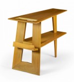 Danish Mid-Century blond mahogany end table with a wedge-shaped top with a rectangular cut-out and a lower shelf having a small magazine holder supported by a tapered leg on the narrow side and a double leg on the opposite side (manner of JENS RISOM)(Available in walnut: DUF0117B).