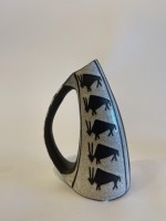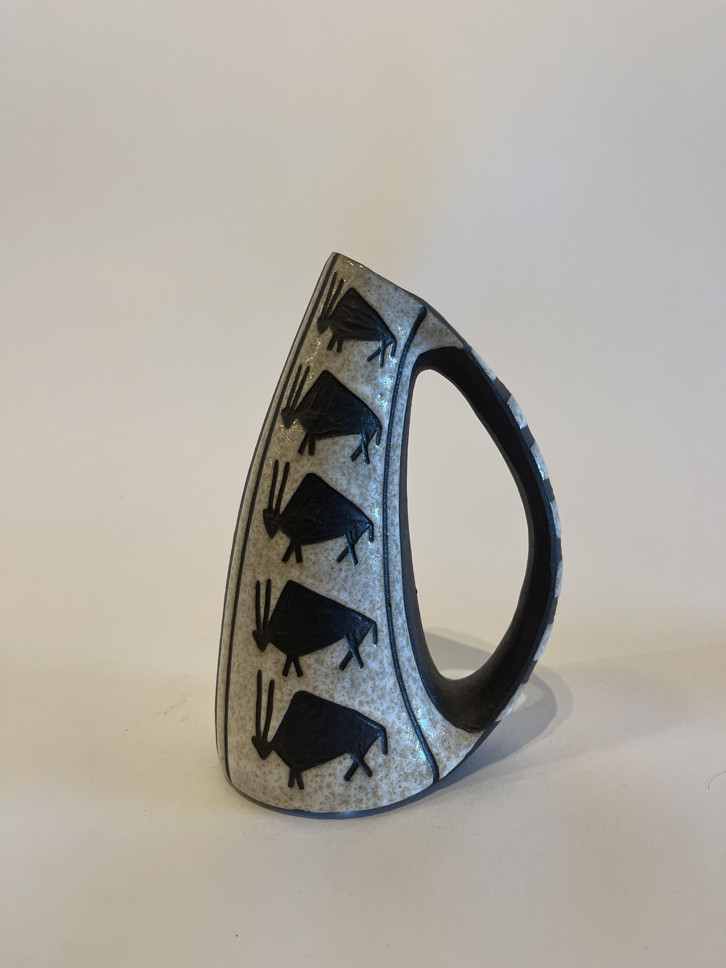 Danish Mid-Century Ceramic Pitcher with a large handle and decorated wtih 5 bulls, Marianne Starck for Andersen and Sons (companion pieces REG4517A-G).