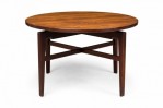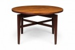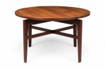 Danish Mid-Century circular walnut dining table with a rotating lazy susan top resting on an X-shaped walnut base with tapered square legs. (JENS RISOM)(Similar tables: DUF0276, DUF0278, DUF0279).