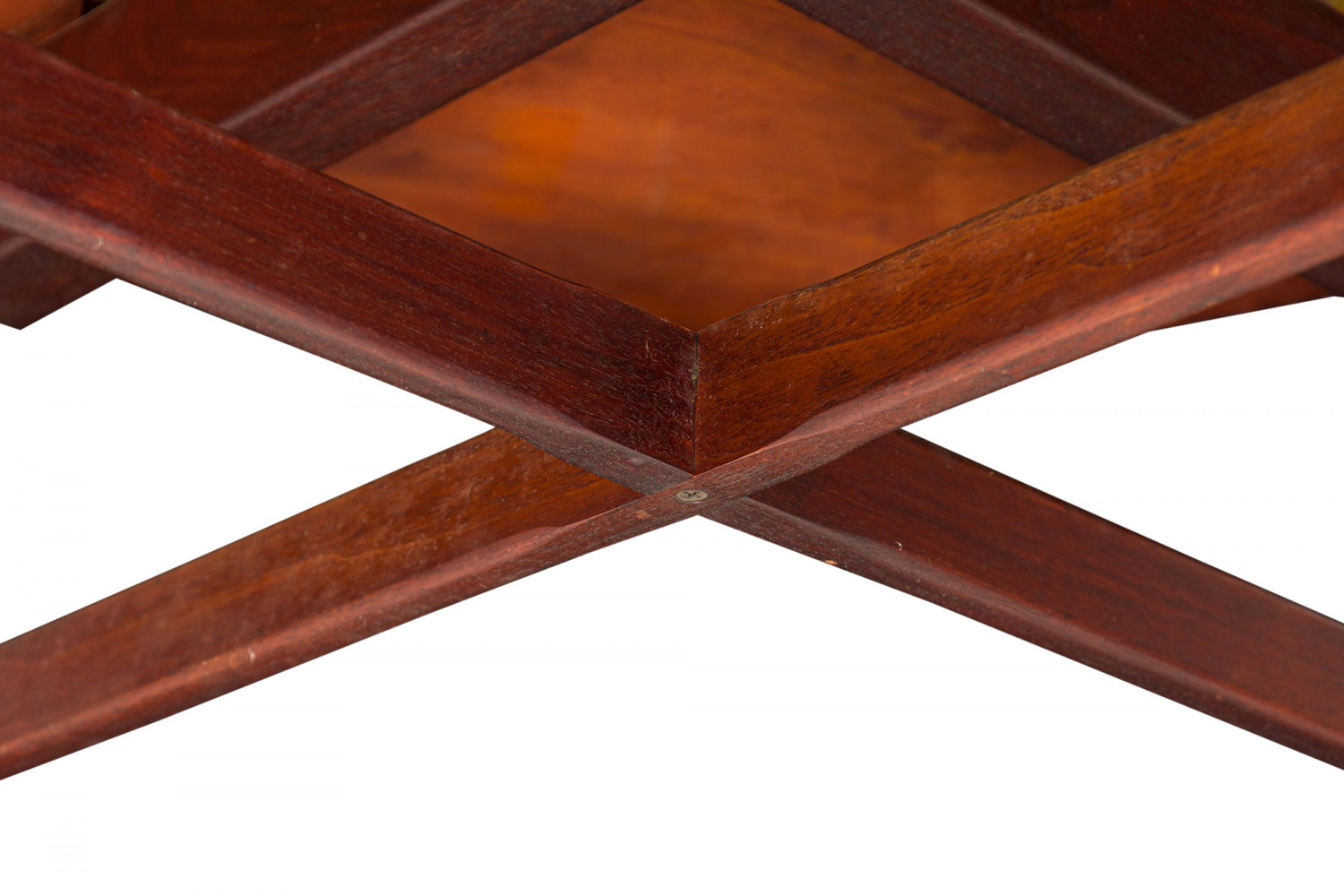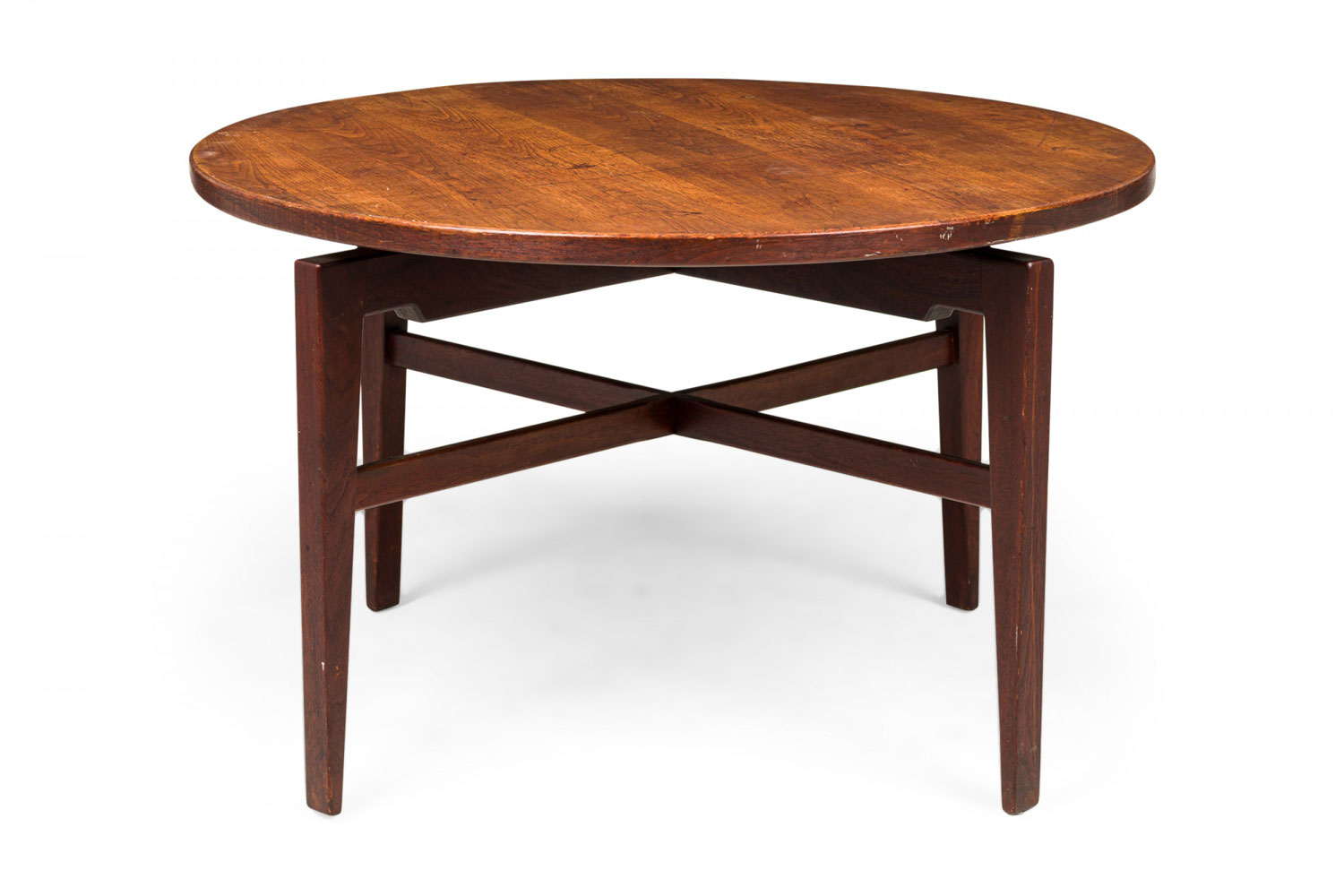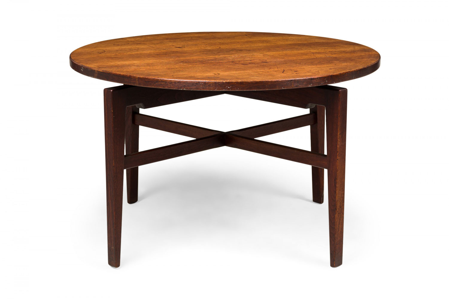 Danish Mid-Century circular walnut dining table with a rotating lazy susan top resting on an X-shaped walnut base with tapered square legs. (JENS RISOM)(Similar tables: DUF0276, DUF0278, DUF0279)