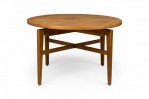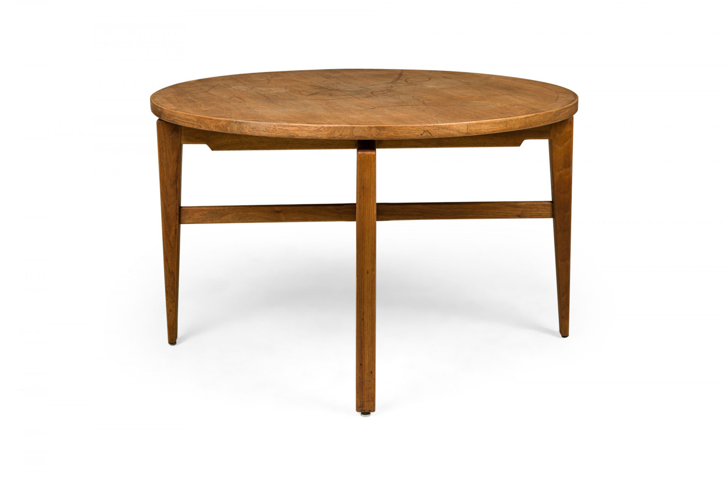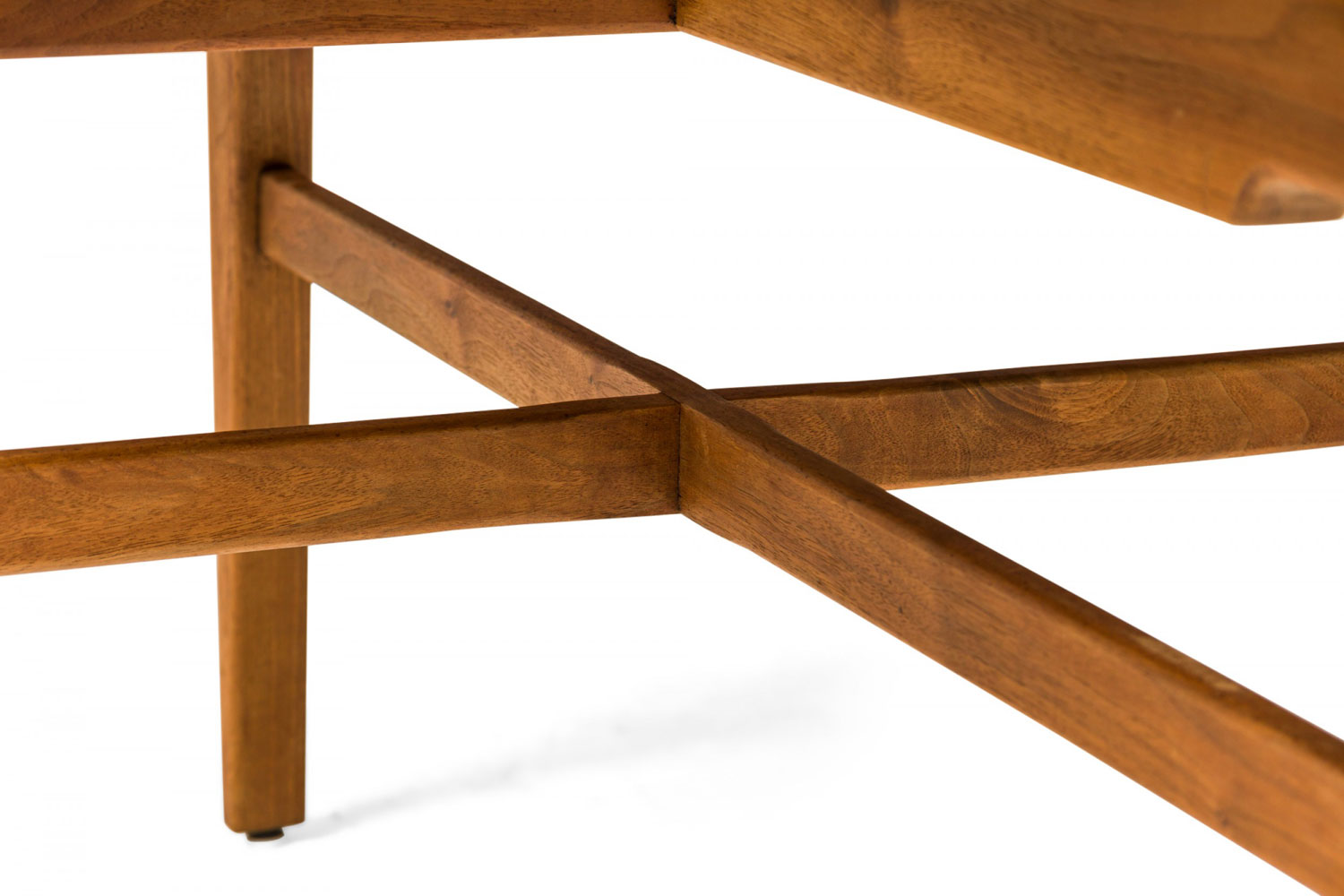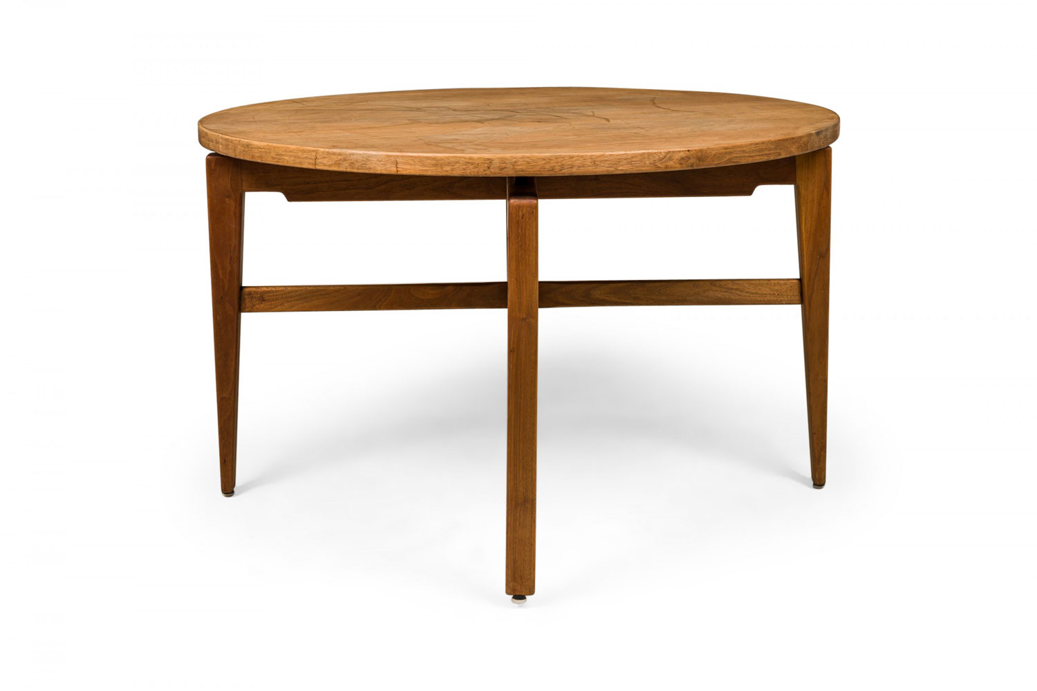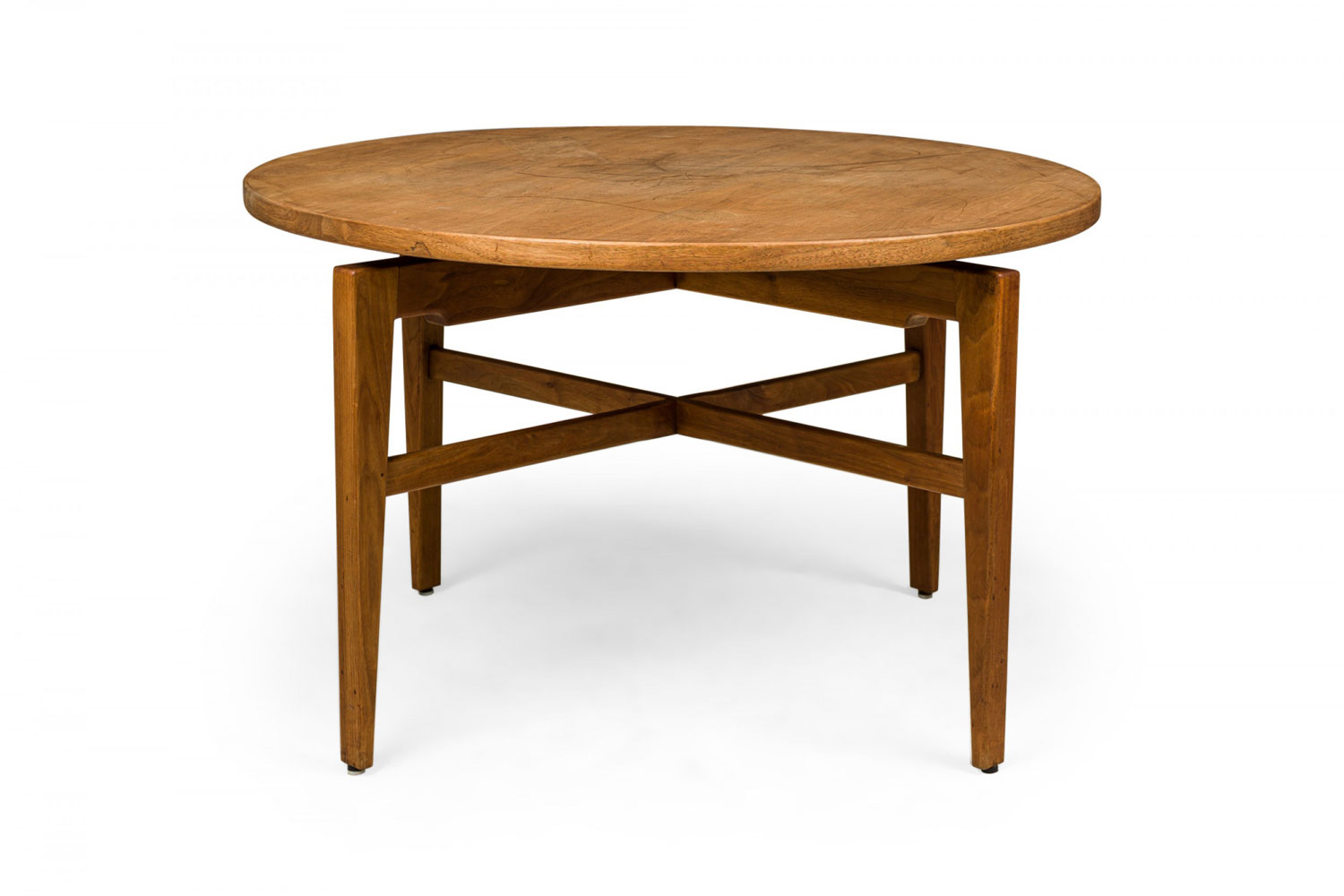Danish Mid-Century circular walnut dining table with a rotating lazy susan top resting on an X-shaped walnut base with tapered square legs. (JENS RISOM)(Similar tables: DUF0276, DUF0277, DUF0279)