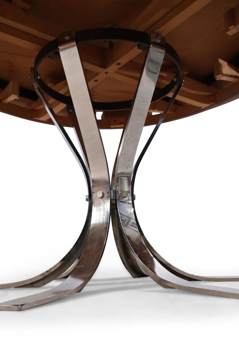 Style: Contemporary/Post-War Design Materials & Techniques: Nickel, rosewood, wood Category: Tables, Office/Library, Dining Room Condition: Wood is slightly different in tone between the two pieces. One has darker notes while the other is slightly lighter.