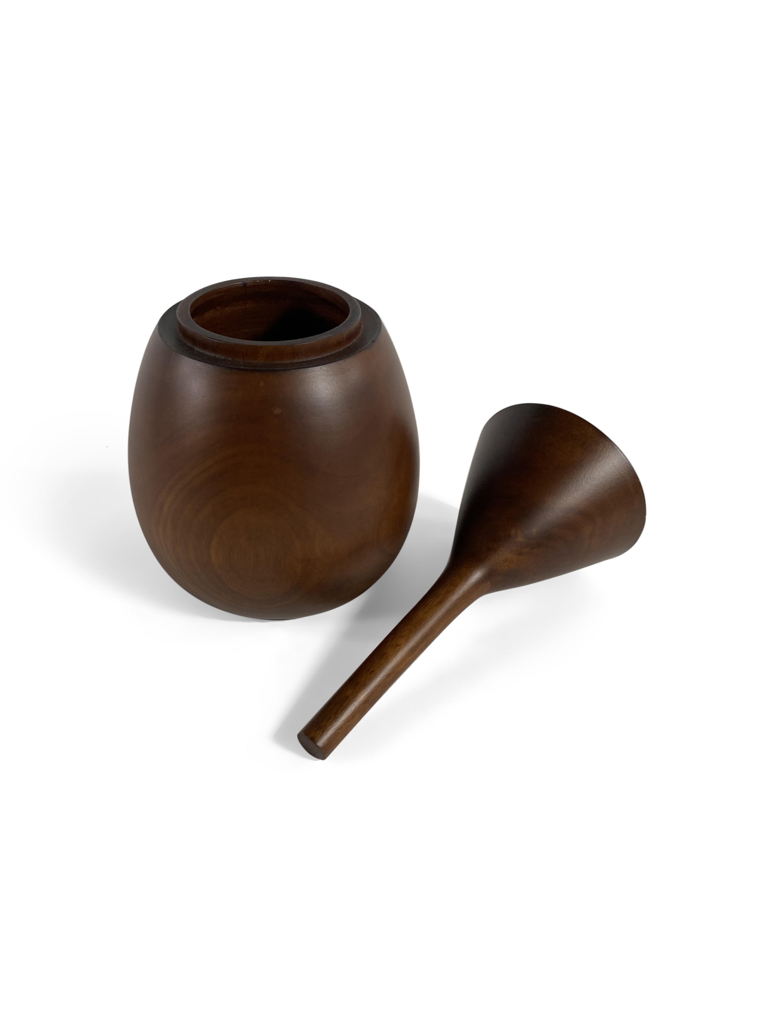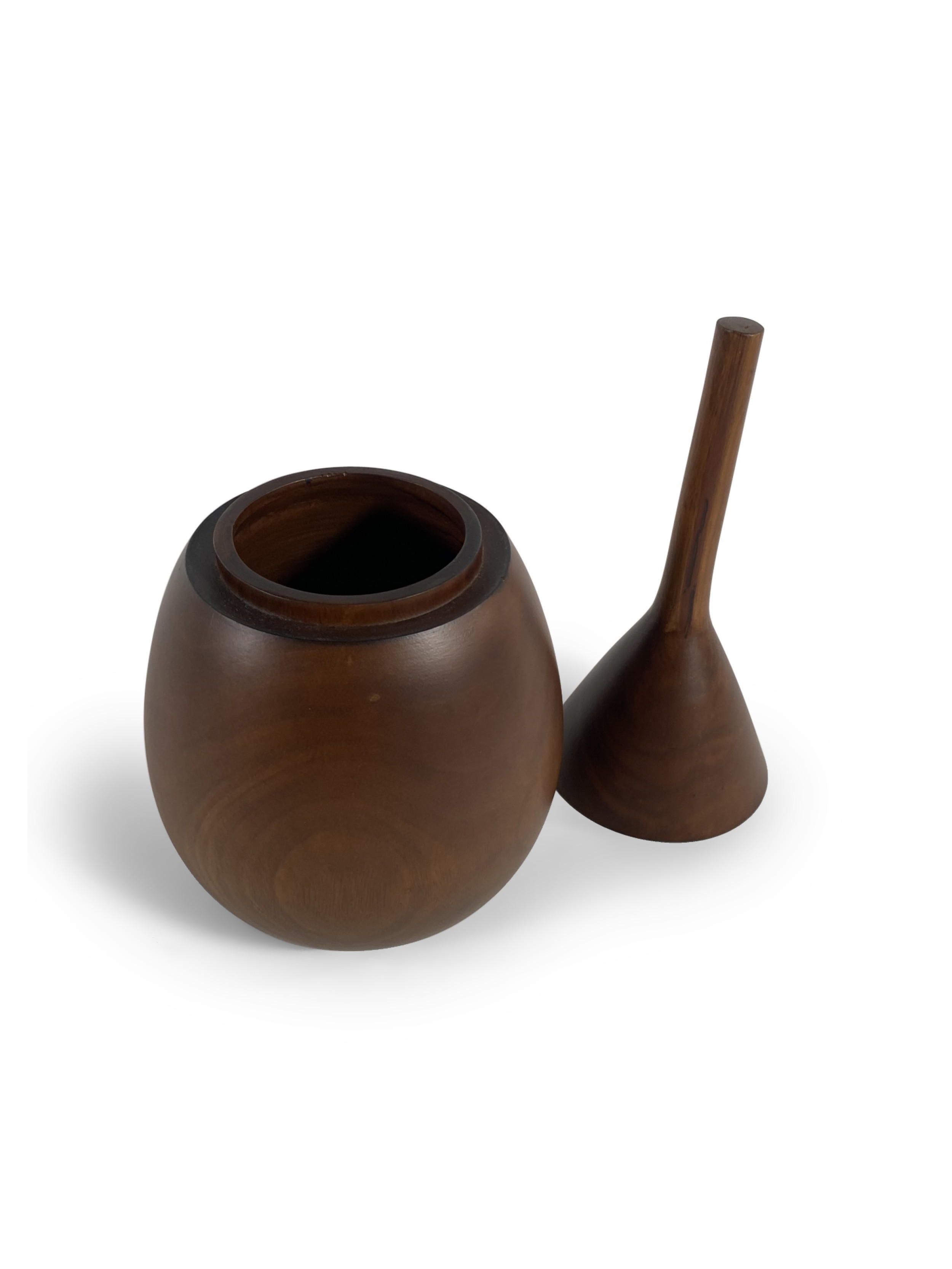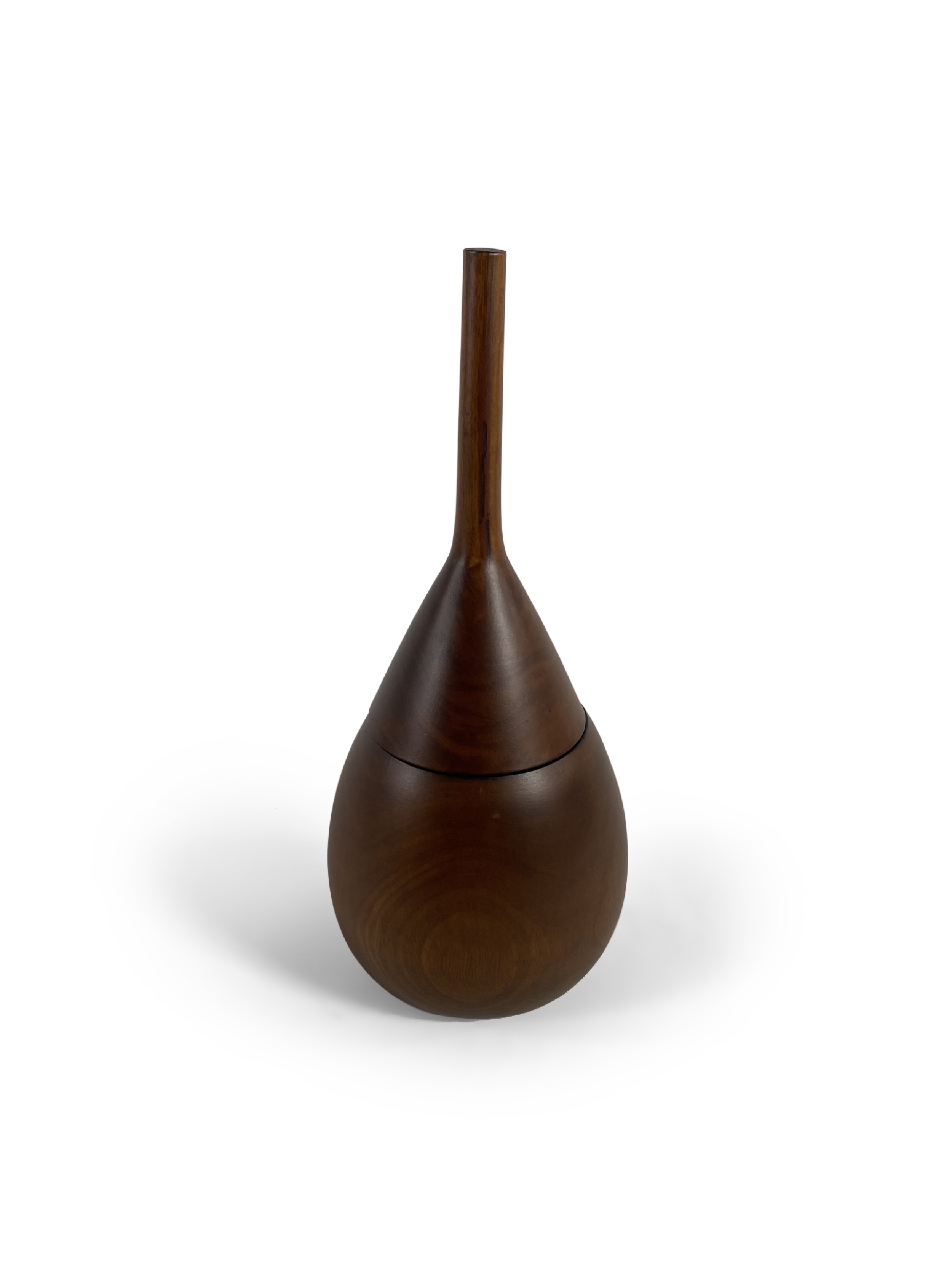 Danish Mid-Century teak wood humidor in tear drop shape with along narrow neck that opens in the middle