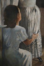 French Victorian style (20th Century) painting capturing a dressmaker kneeling before a form holding an unfinished garment, while a customer holding a paper and looking off to the side sits in the foreground. Painted on unframed, rectangular canvas.