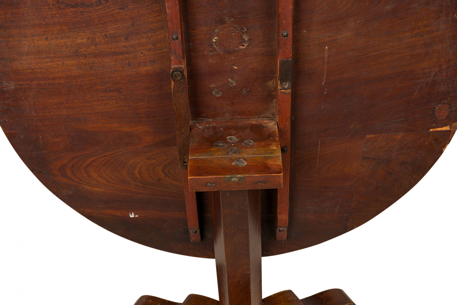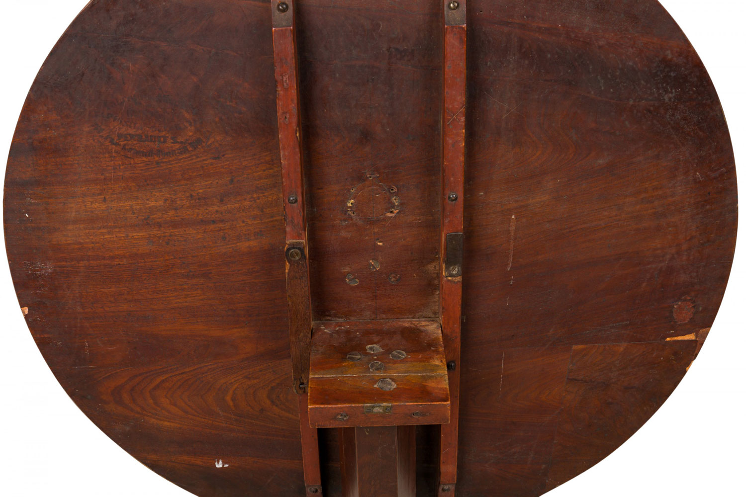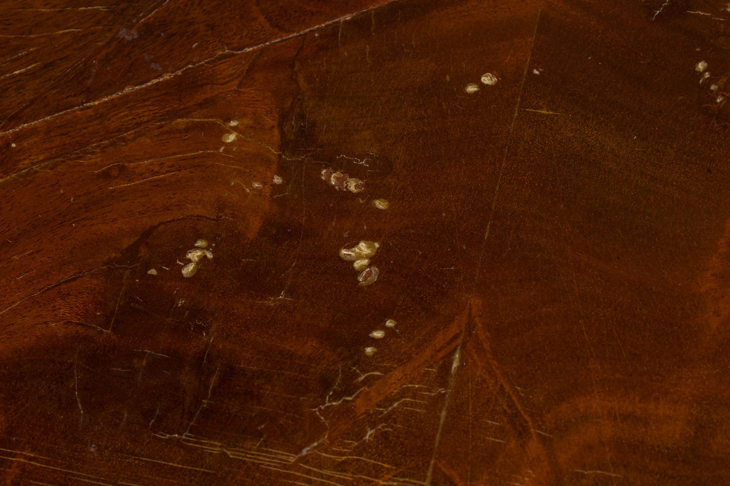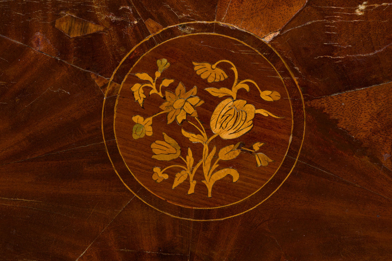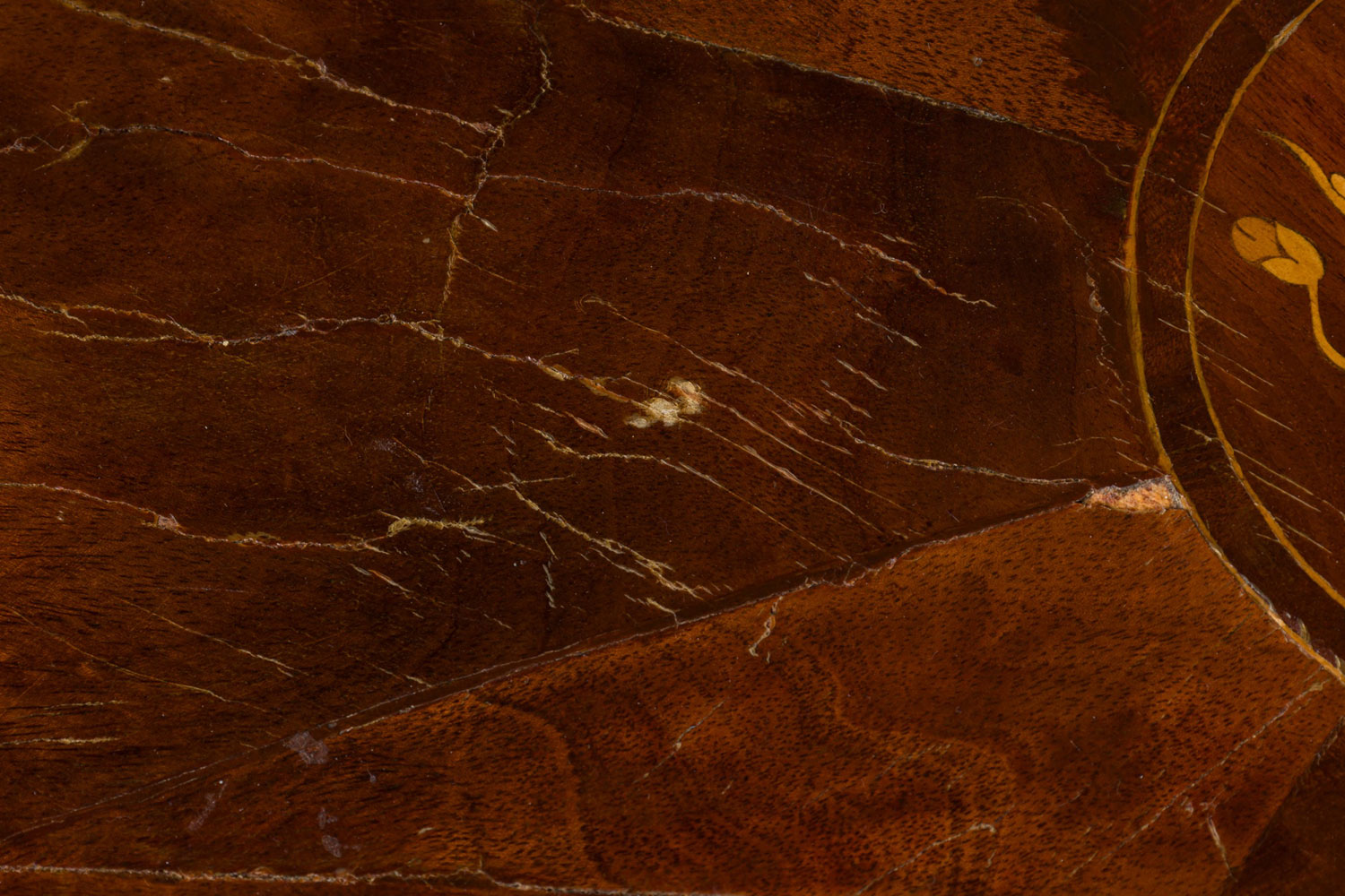 Style: Continental Materials & Techniques: Inlaid, mahogany, veneer, wood Category: Tables Condition: Veneer buckling, scratches and losses to table top.