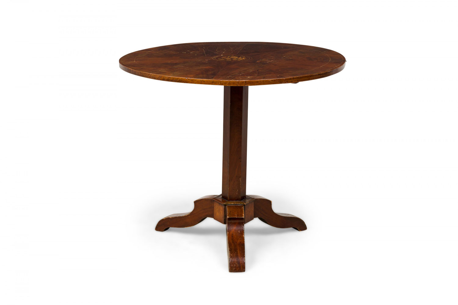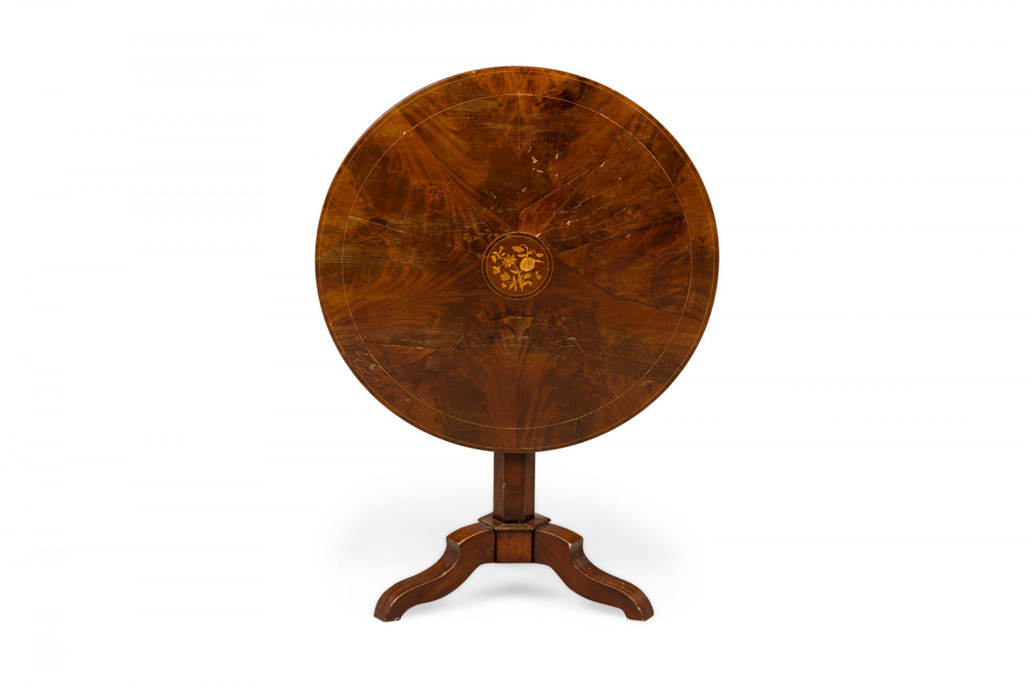 Continental (Possibly Dutch) (19th Century) mahogany flame veneer round tilt-top table with a center floral marquetry inlaid medallion supported on a tripartite base with scalloped legs.
