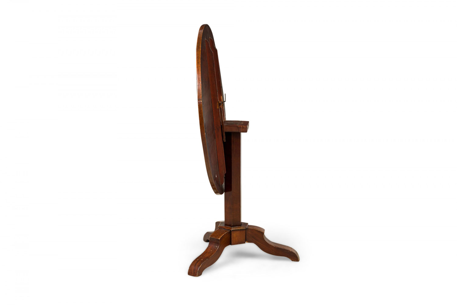 Continental (Possibly Dutch) (19th Century) mahogany flame veneer round tilt-top table with a center floral marquetry inlaid medallion supported on a tripartite base with scalloped legs..
