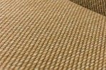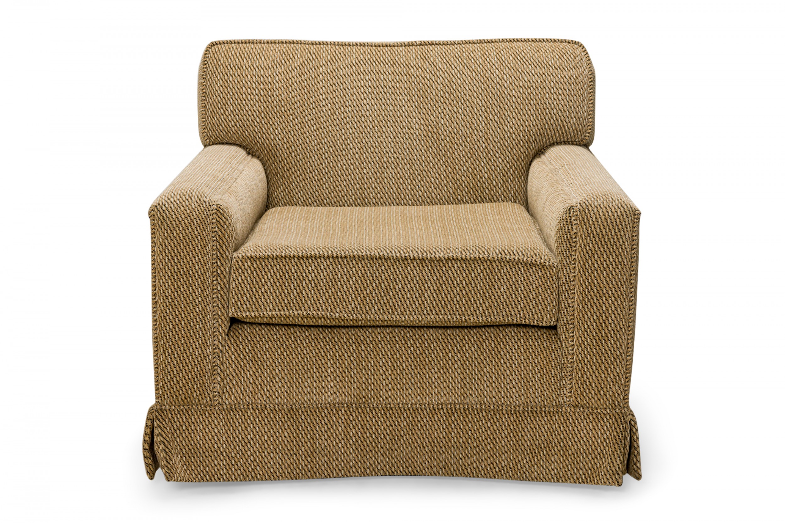 American Mid-Century lounge armchair with plush upholstery in a textured taupe and beige with a small skirt concealing four fluted legs. (EDWARD J WORMLEY FOR DUNBAR FURNITURE COMPANY)