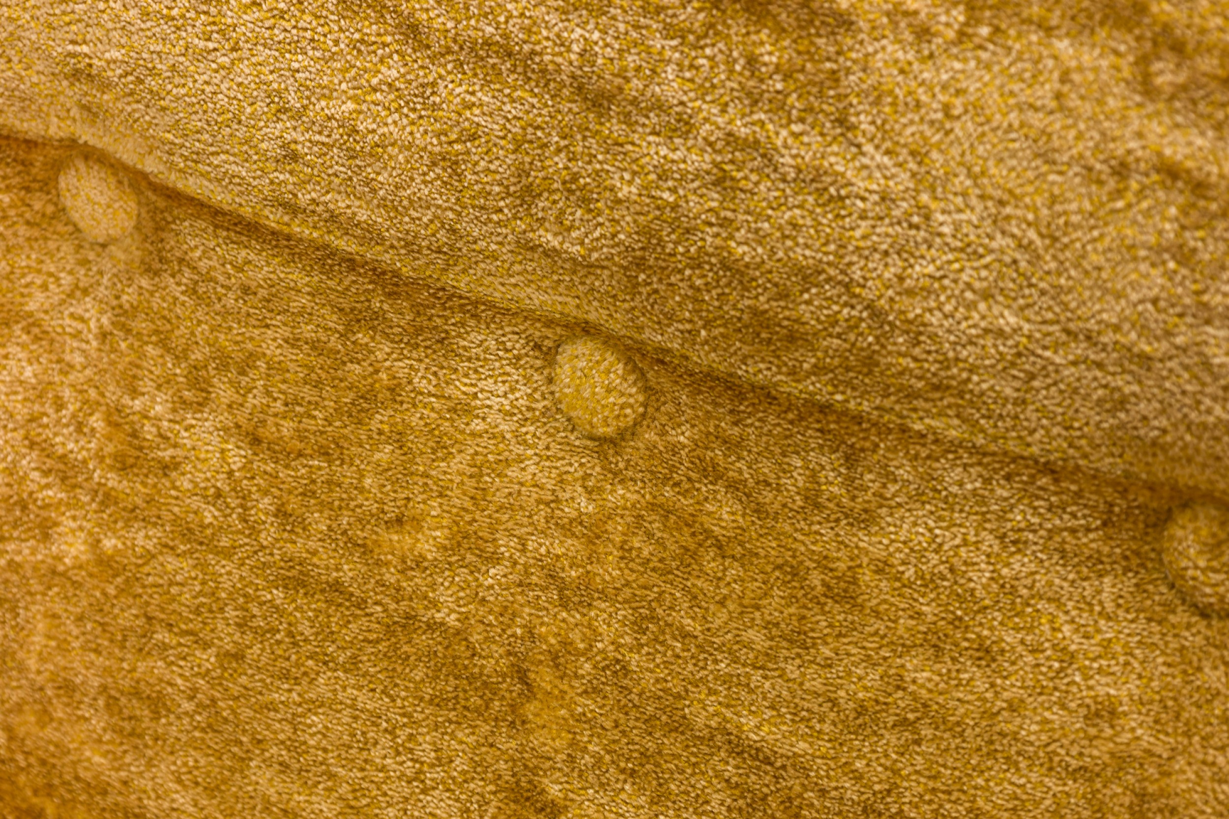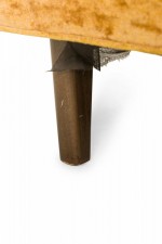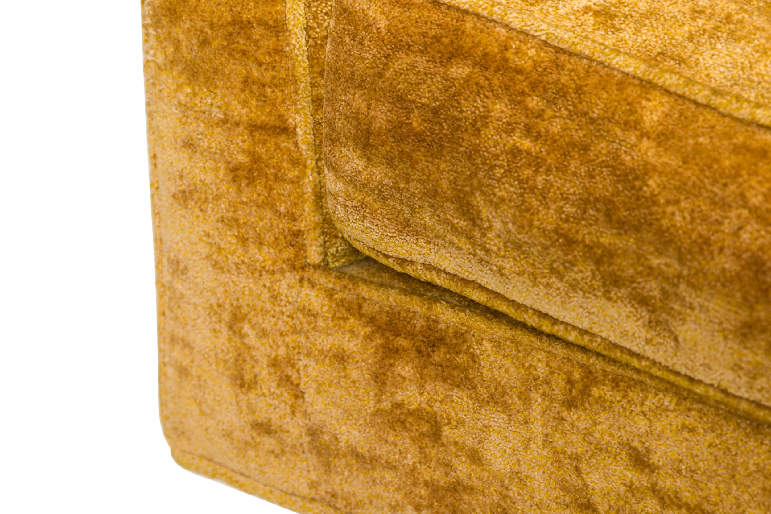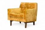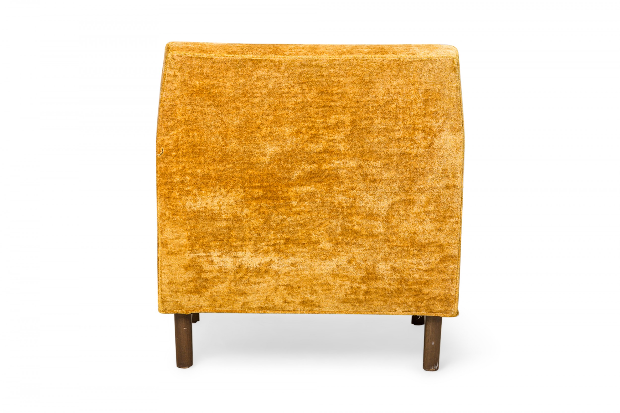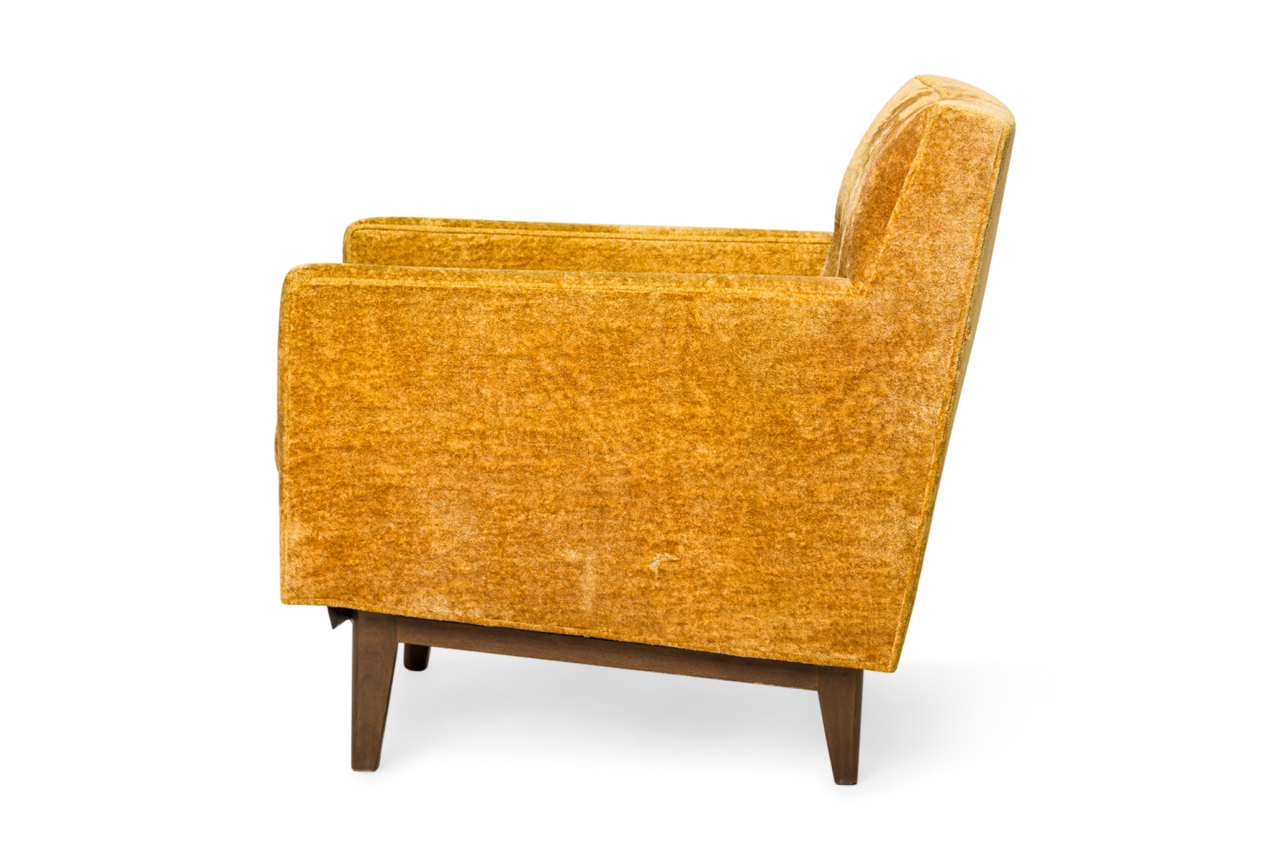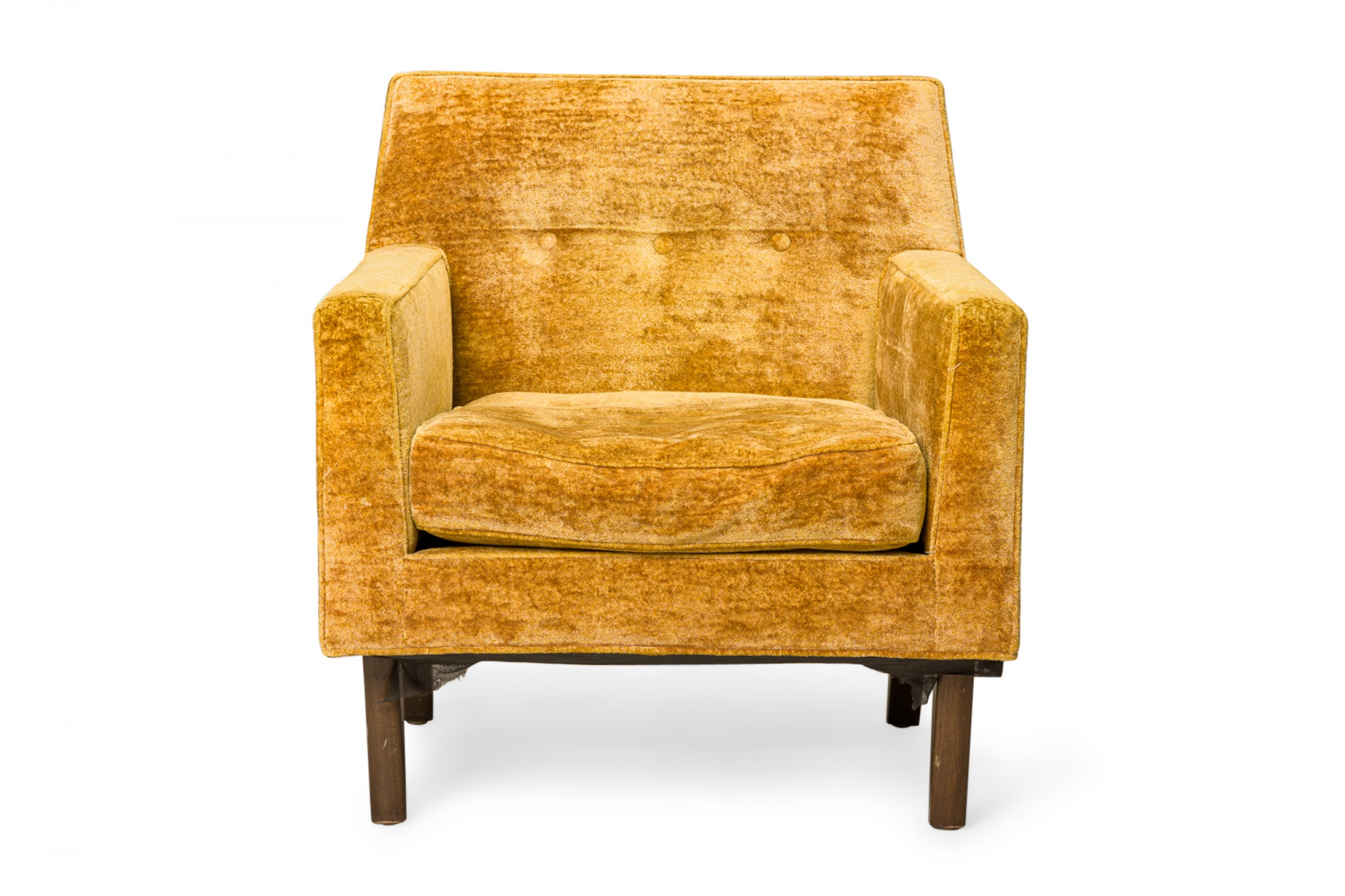 American Mid-Century lounge armchair with square arms and a slightly tapered short back, with crushed gold velour upholstery with button tufted detail on the back cushion, resting on four tapered walnut legs. (EDWARD J WORMLEY FOR DUNBAR FURNITURE COMPANY)