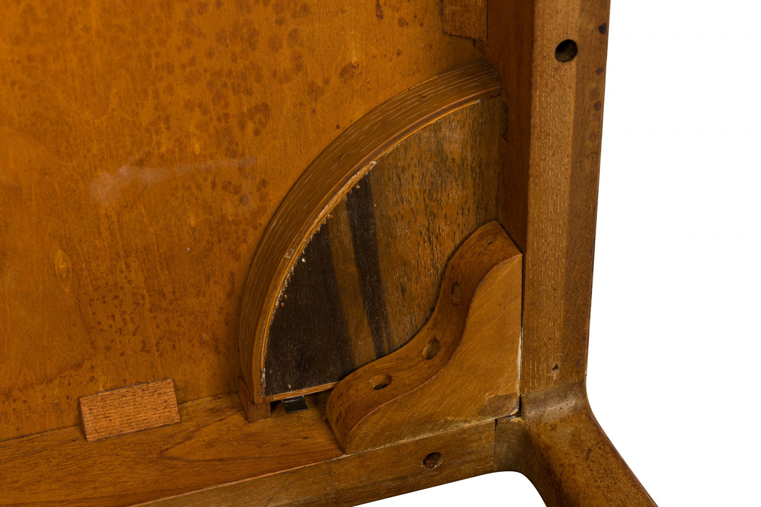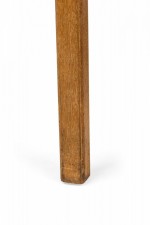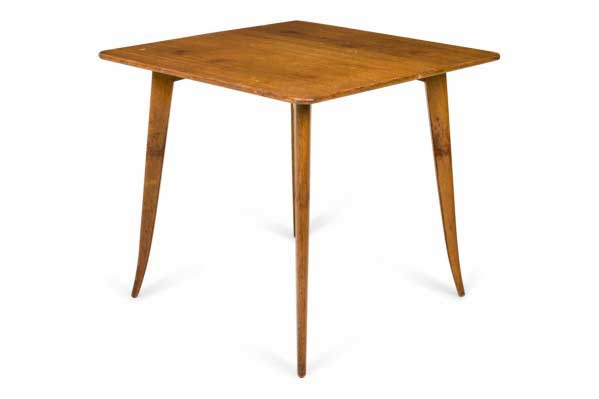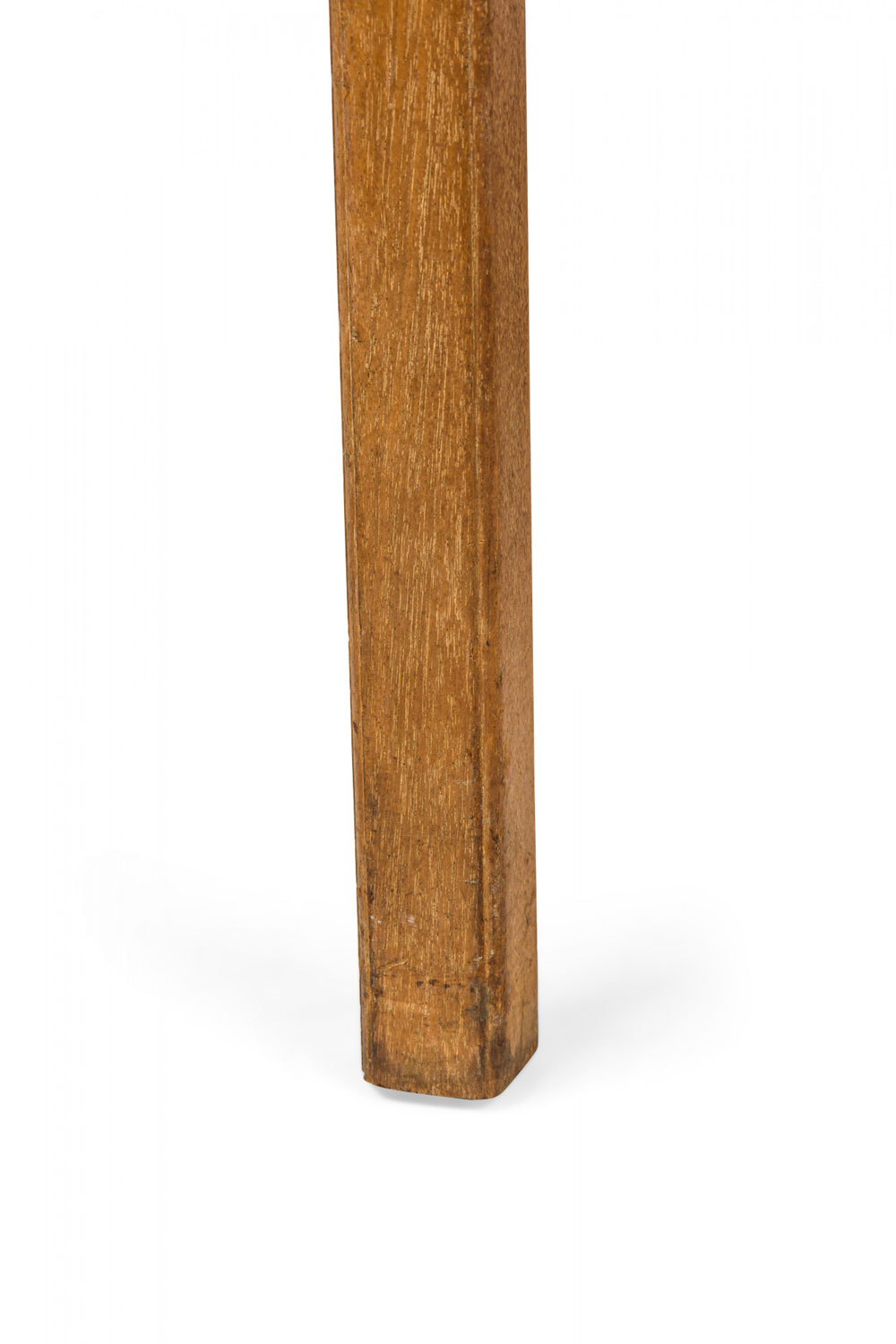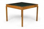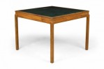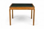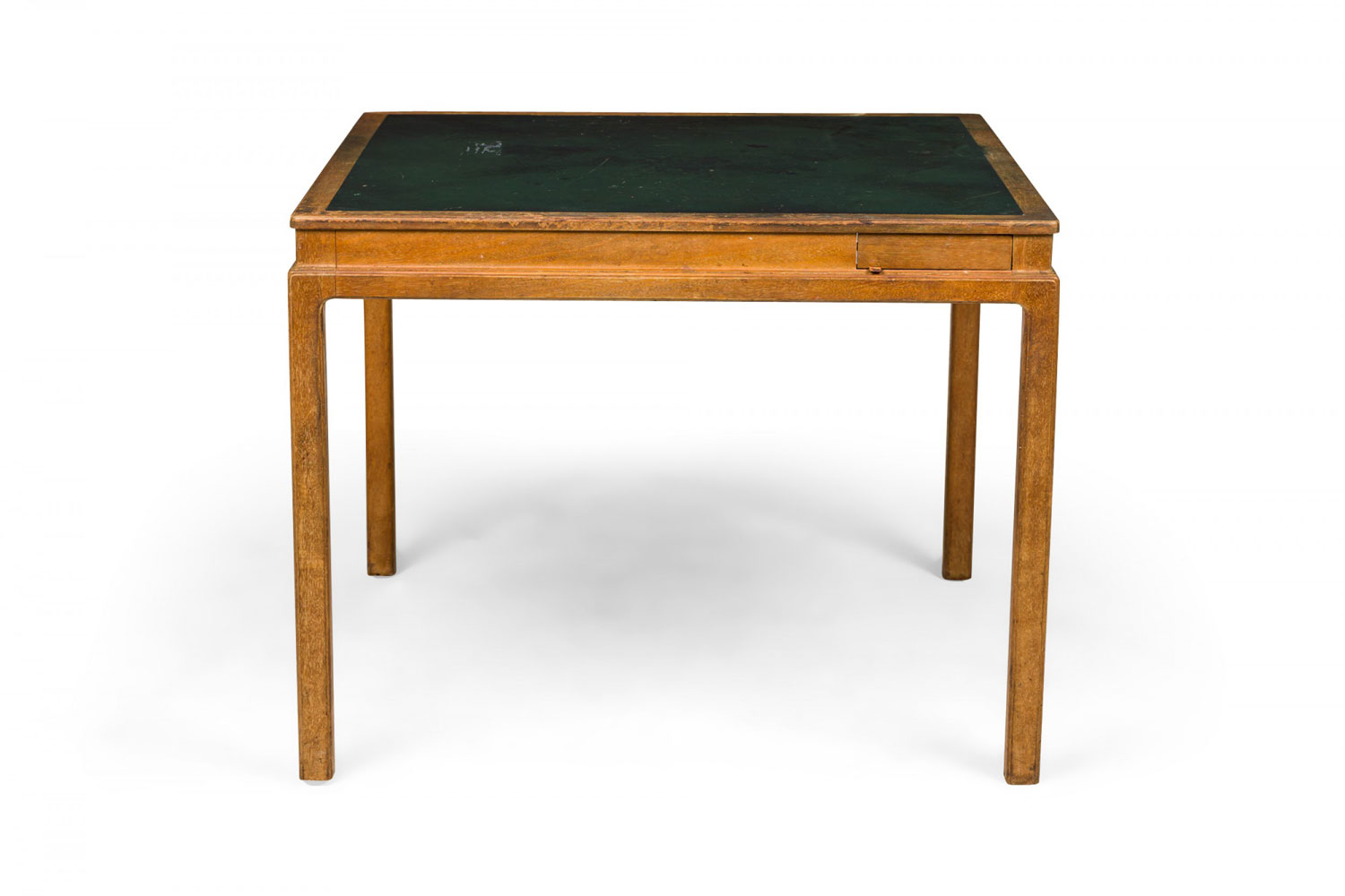 American Mid-Century game table with a wooden frame and a square inset green leather top, resting on four square wooden legs. (EDWARD J WORMLEY FOR DUNBAR FURNITURE COMPANY).