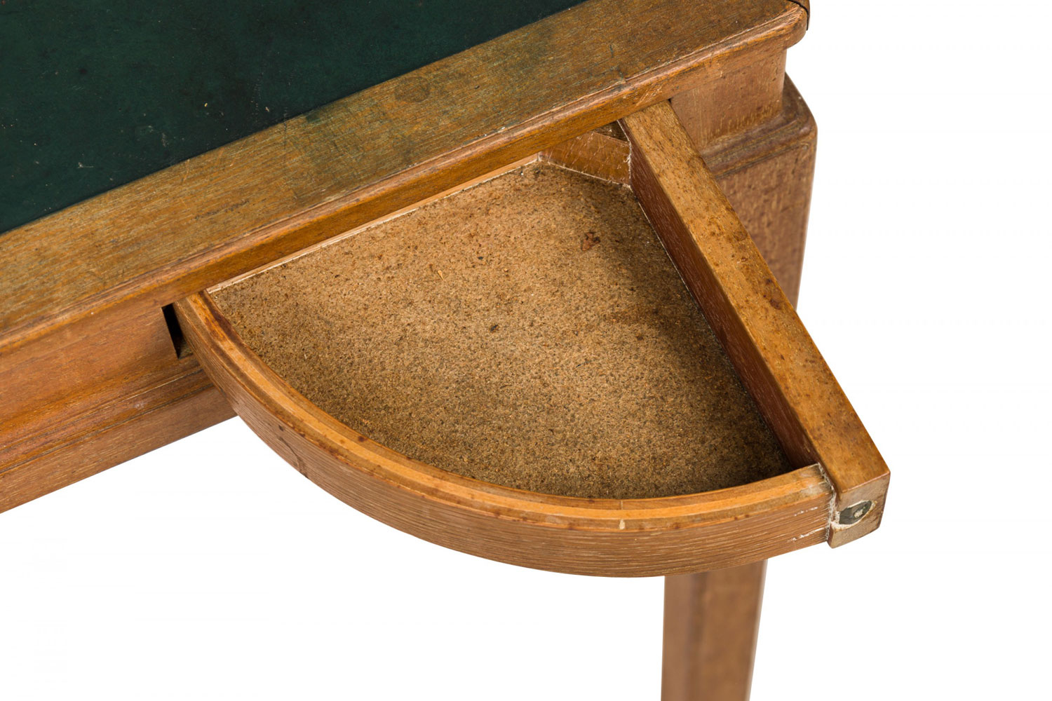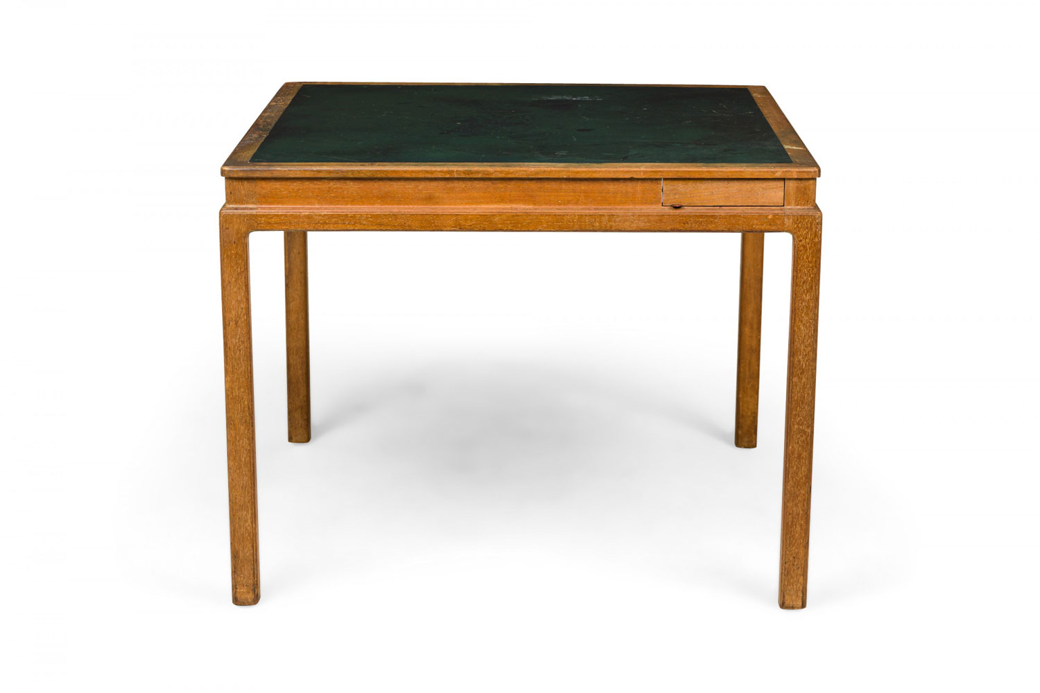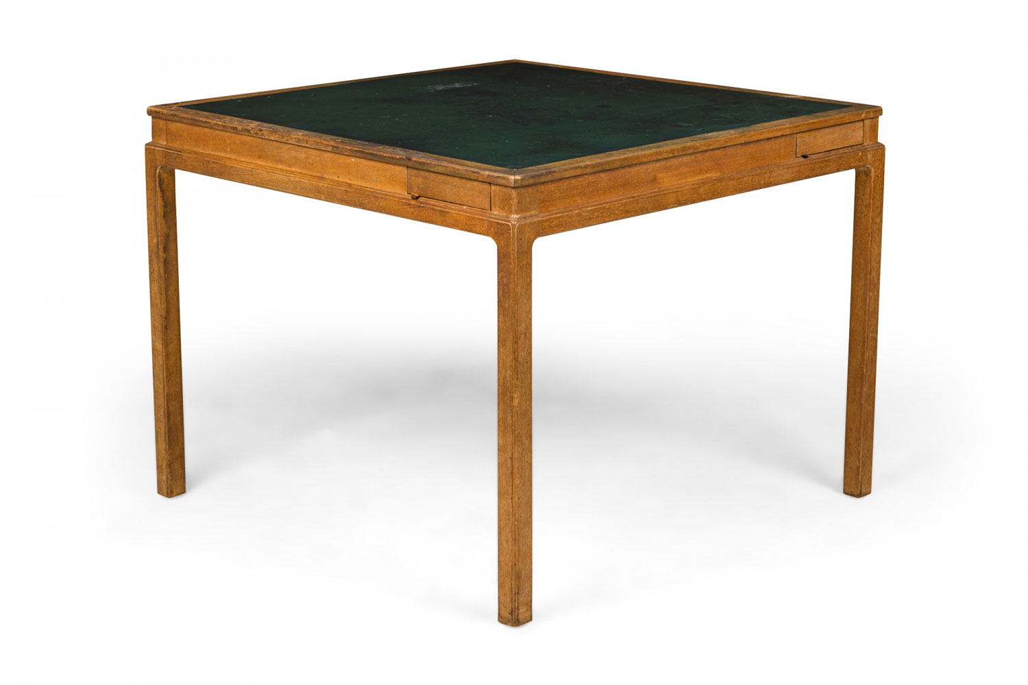 American Mid-Century game table with a wooden frame and a square inset green leather top, resting on four square wooden legs. (EDWARD J WORMLEY FOR DUNBAR FURNITURE COMPANY)