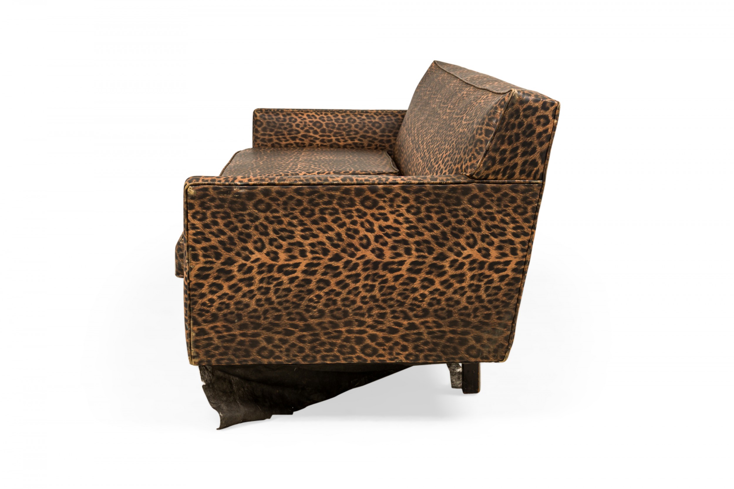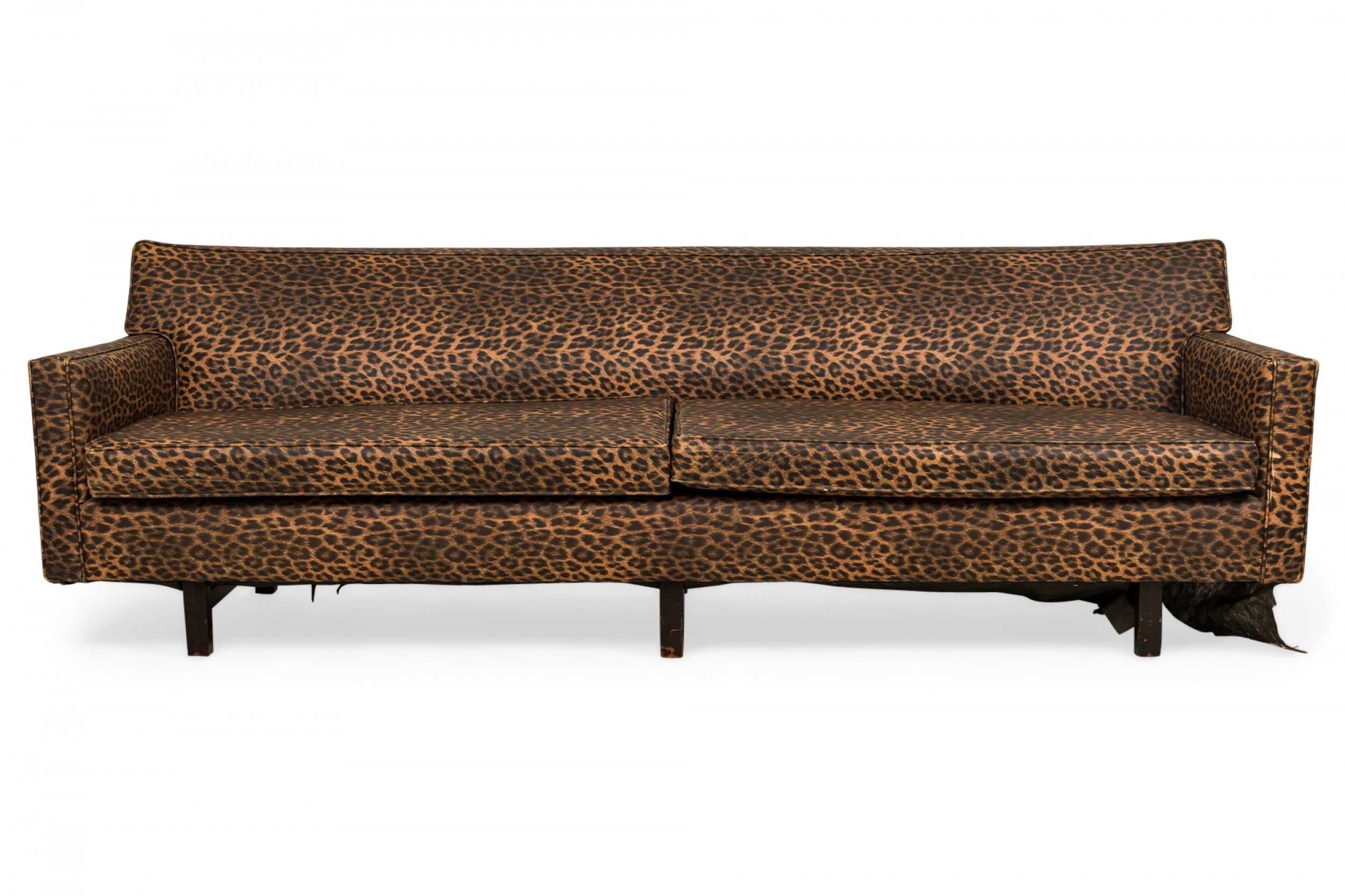 American Mid-Century three seat sofa, upholstered in a brown and black leopard print vinyl with two removable seat cushions, resting on three sets of square walnut legs. (EDWARD J WORMLEY FOR DUNBAR FURNITURE COMPANY).
