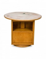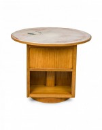 American Mid-Century circular library table with a white mottled leather top above a wooden pedestal center with alternating open cabinets for book storage, resting on a fully rotational base. (EDWARD J WORMLEY FOR DUNBAR FURNITURE CO.).