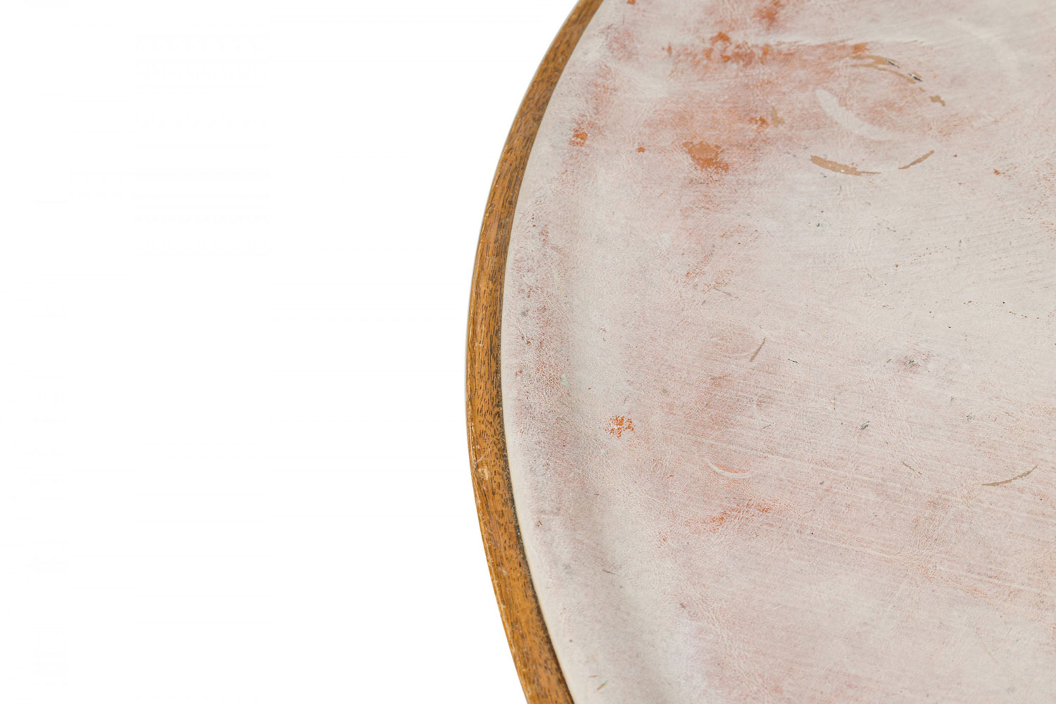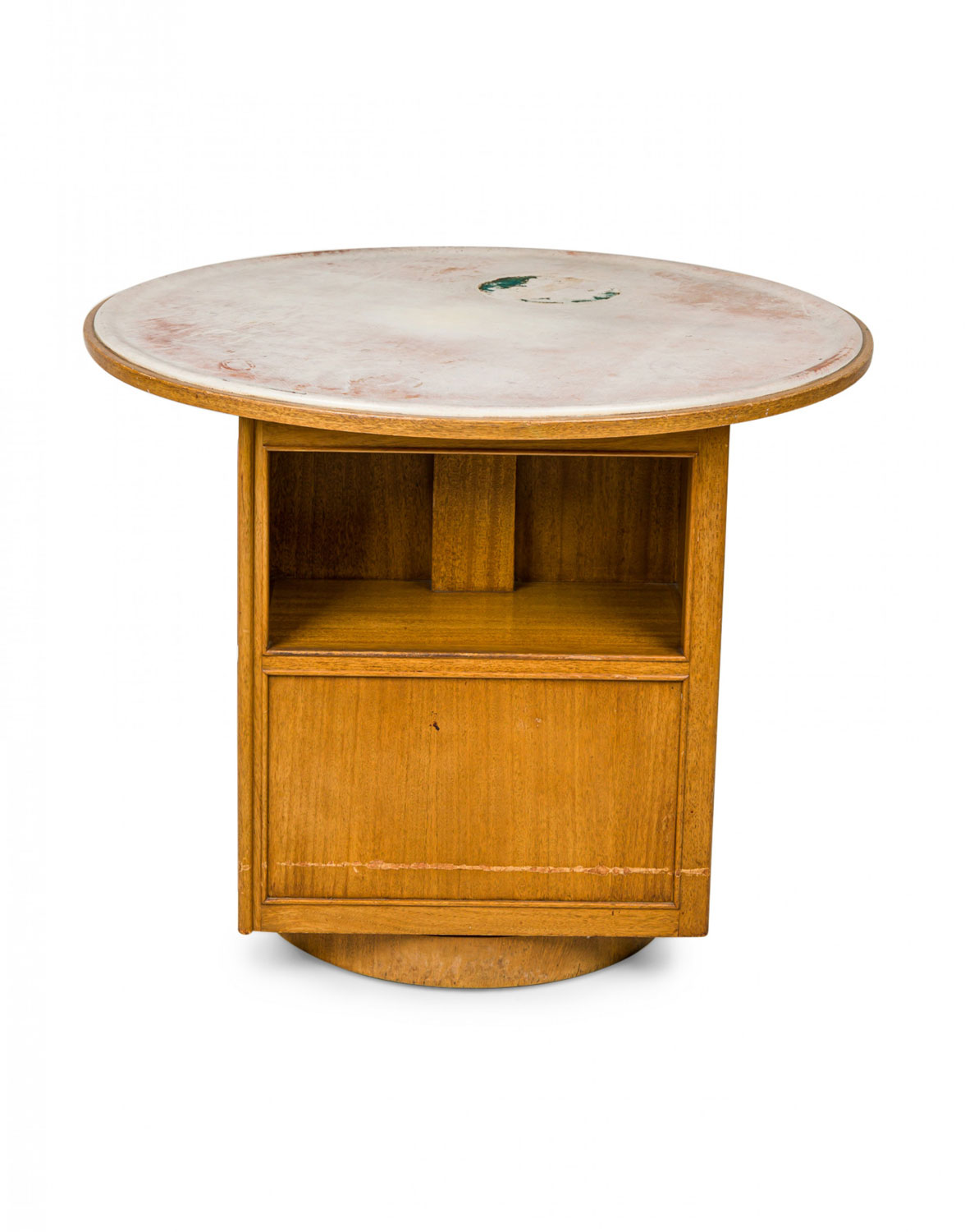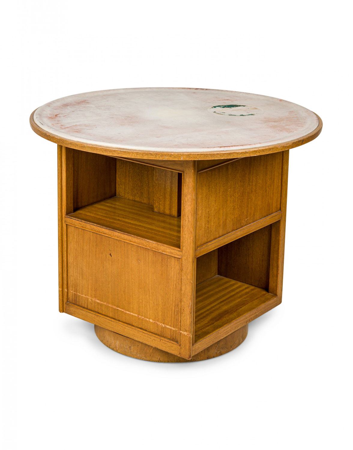 American Mid-Century circular library table with a white mottled leather top above a wooden pedestal center with alternating open cabinets for book storage, resting on a fully rotational base. (EDWARD J WORMLEY FOR DUNBAR FURNITURE CO.)