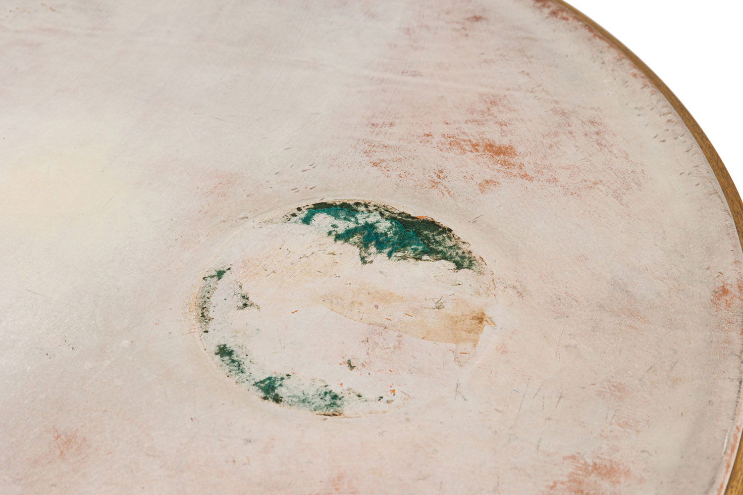 Style: Mid-Century Materials & Techniques: Leather, wood Category: Tables Condition: Significant damage to leather top. Fair; Minor structural damages